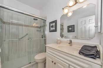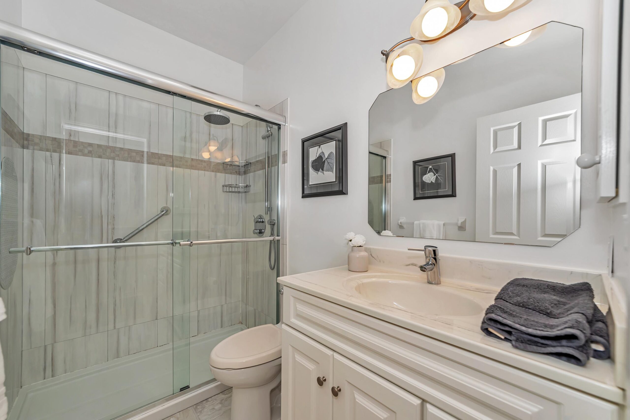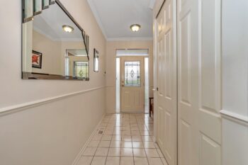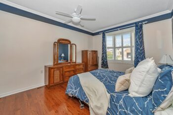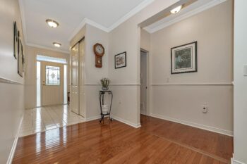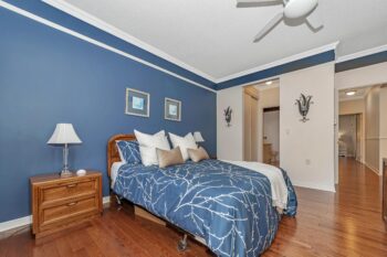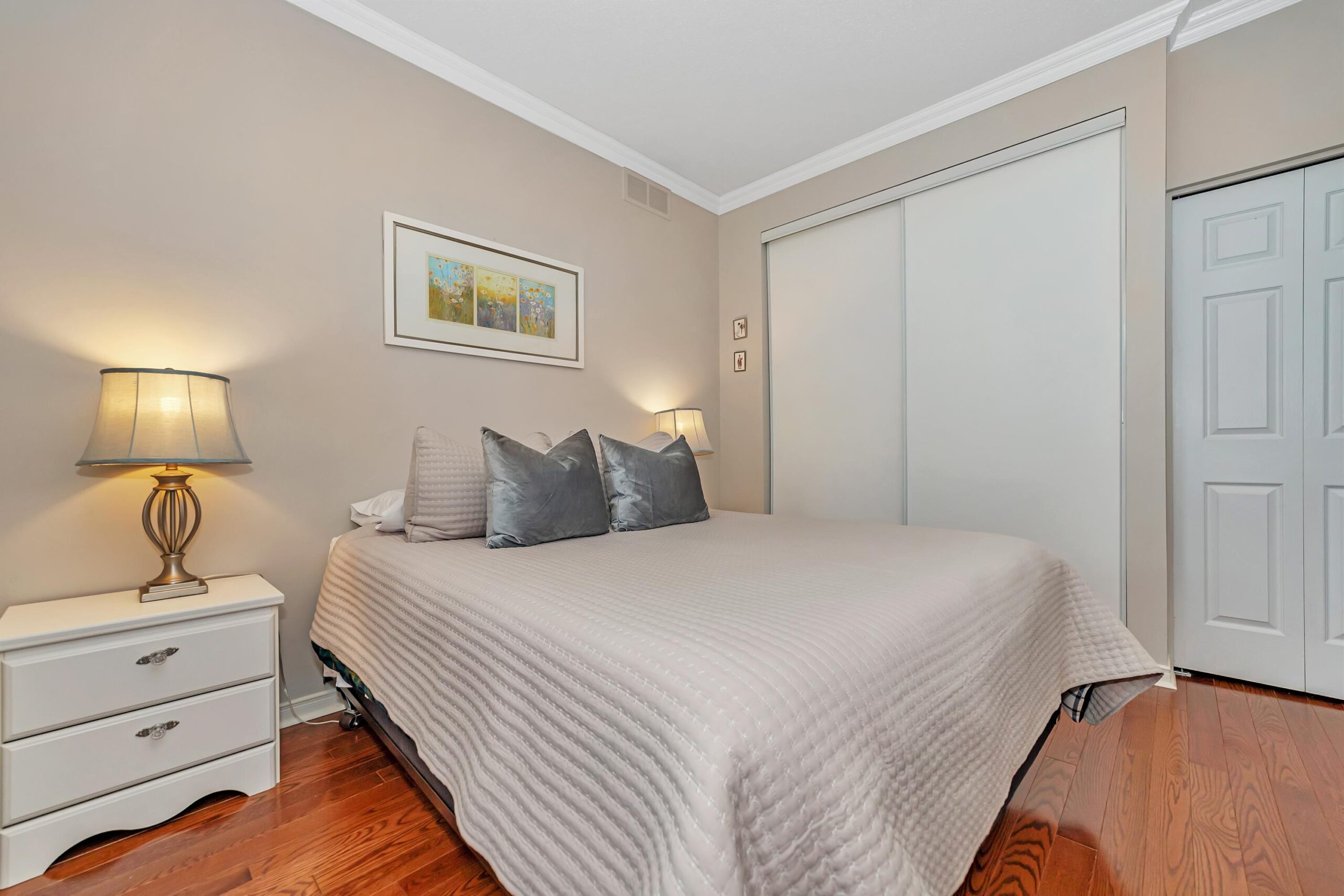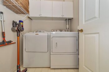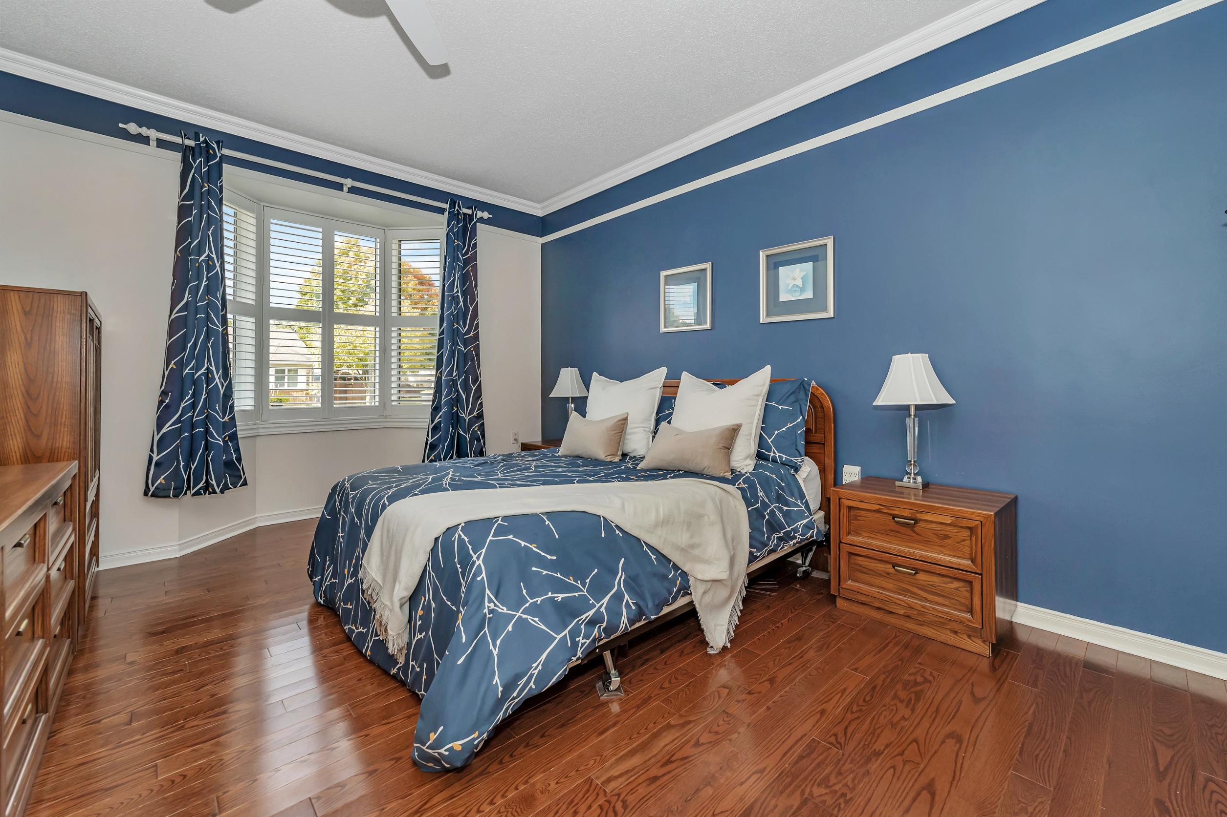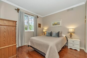 The thoughtfully designed bedroom wing includes a primary suite with his and her closets and a beautifully updated 4-piece ensuite with quartz counters and separate shower and tub. Down the hall, you’ll find the modern main bathroom with a walk-in shower, a second bedroom with ample closet space, and a linen closet for added convenience.