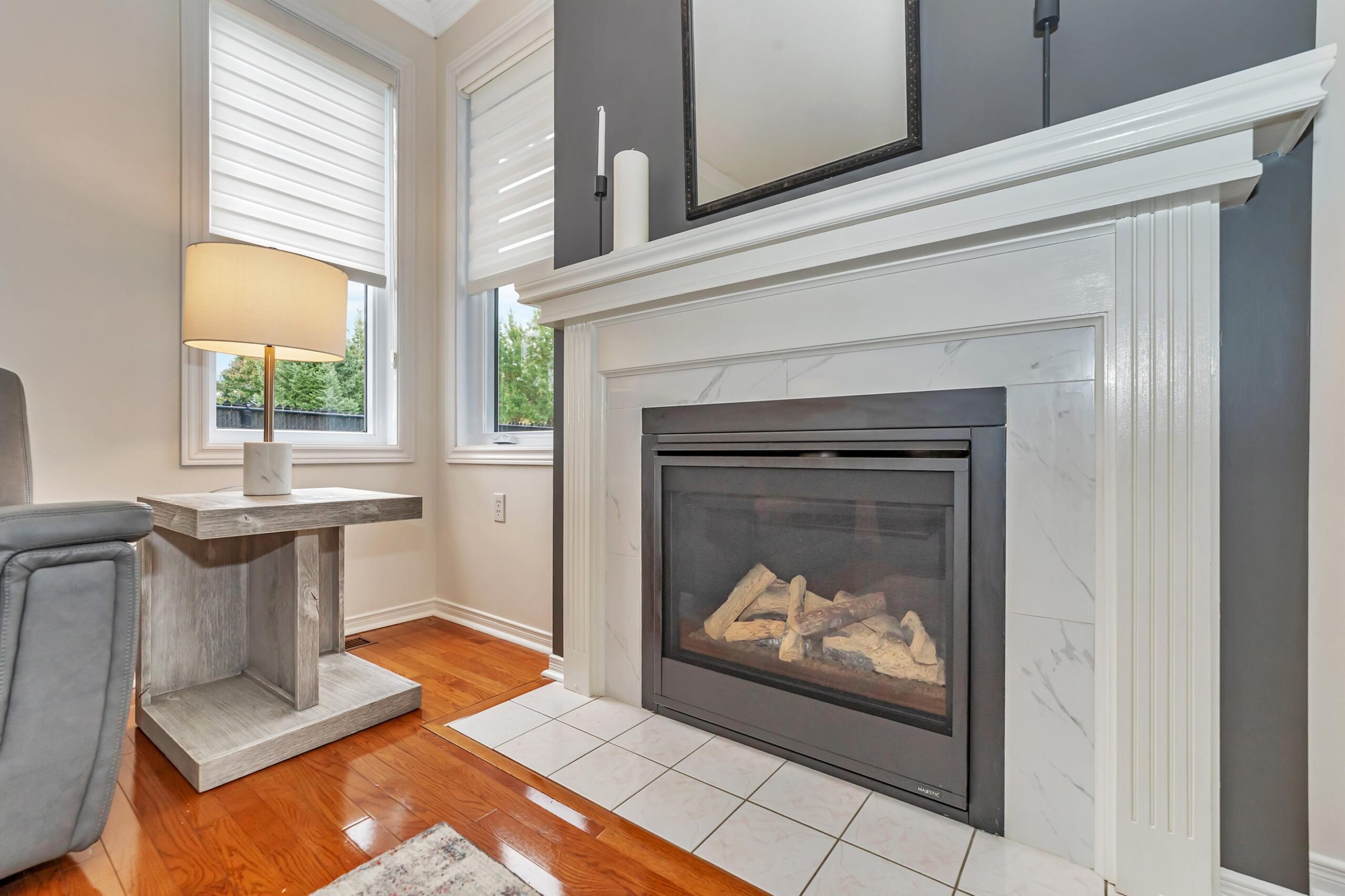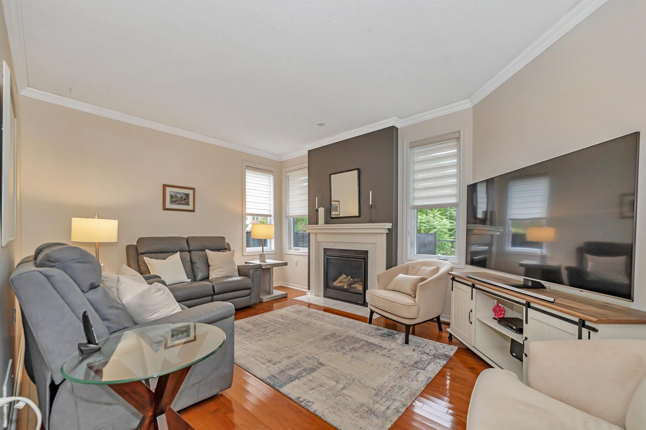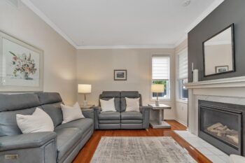 Relax in the cozy living room, featuring a gas fireplace, pot lighting, and views of the lush backyard.