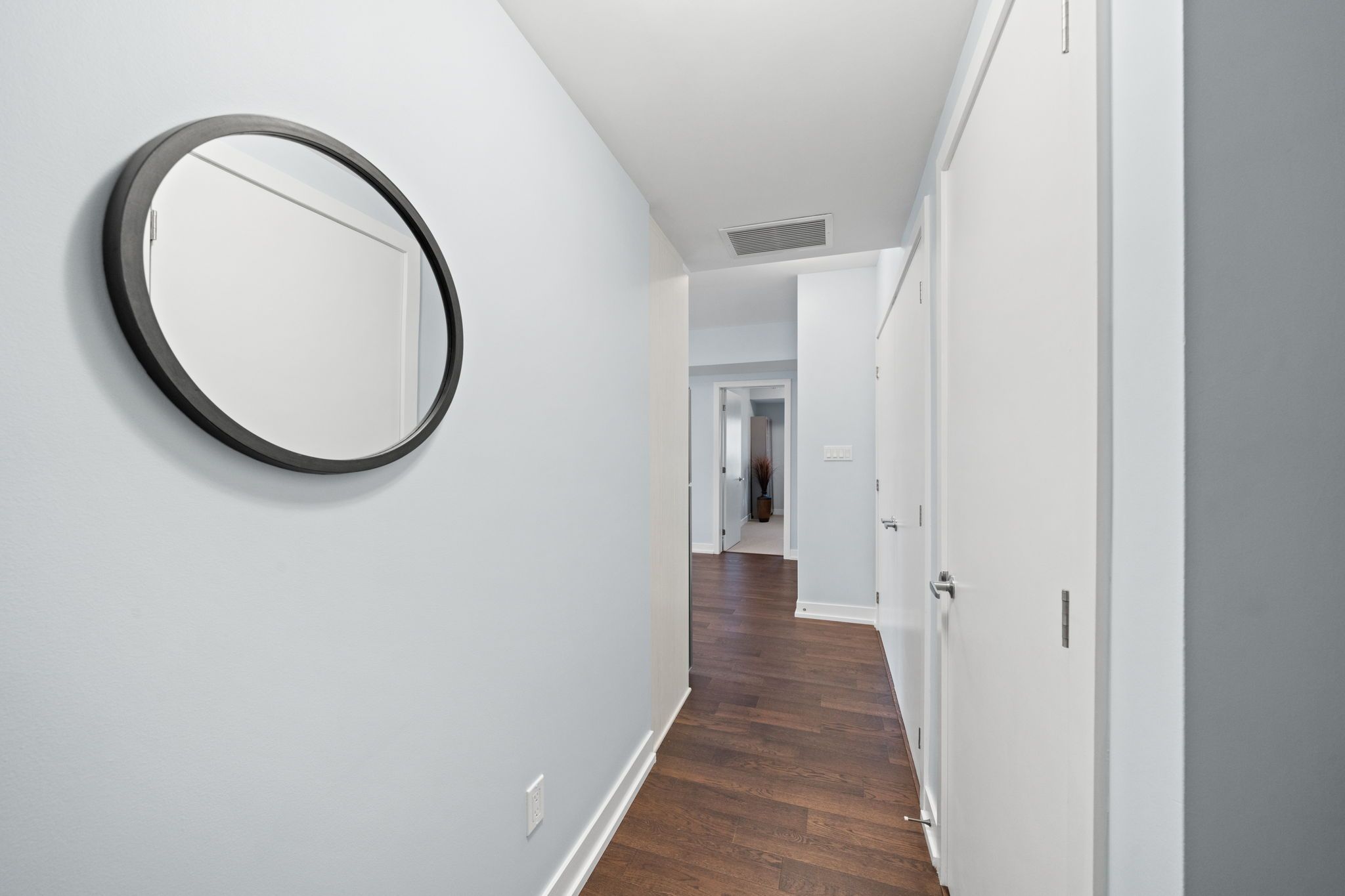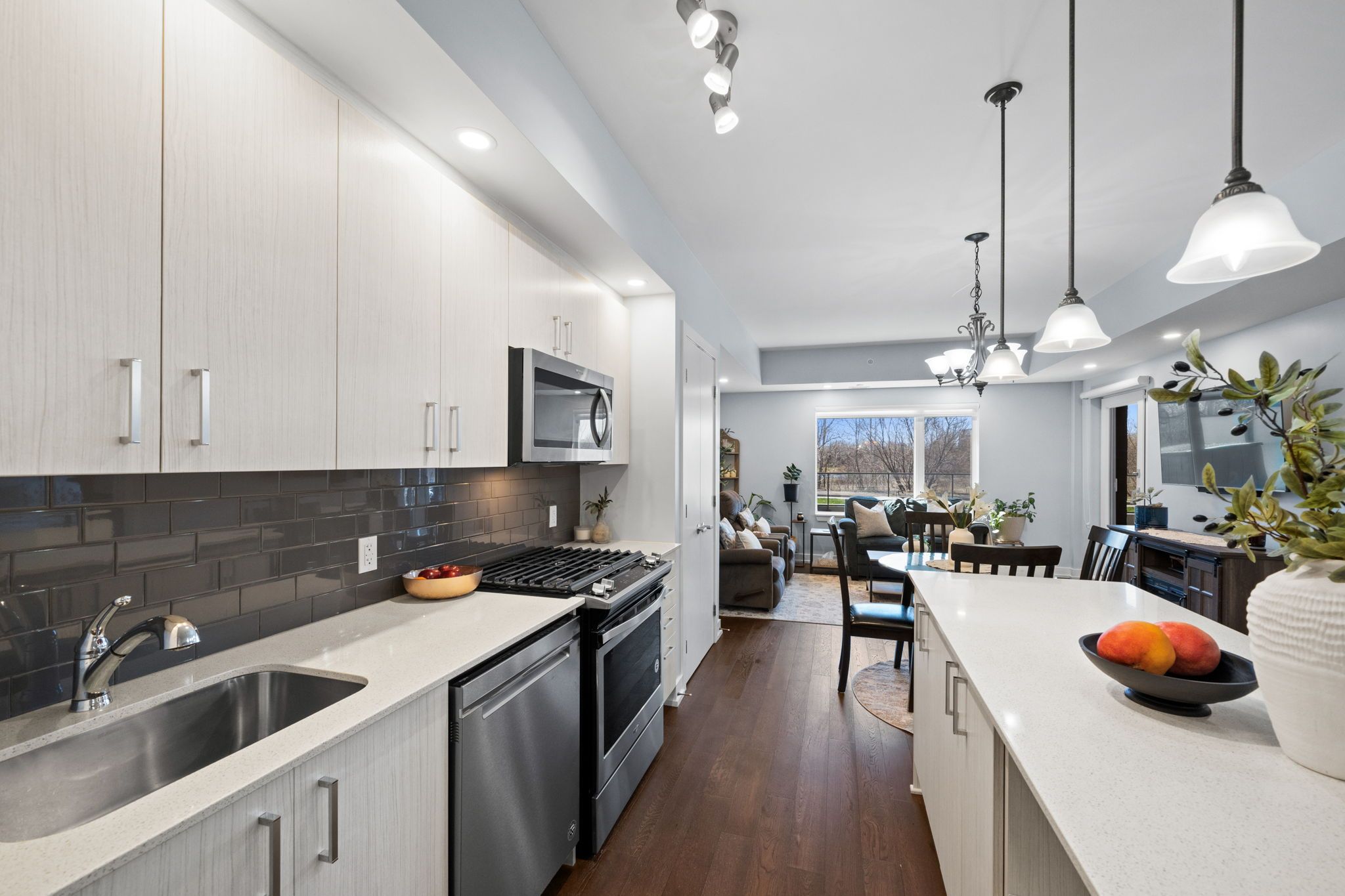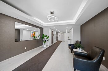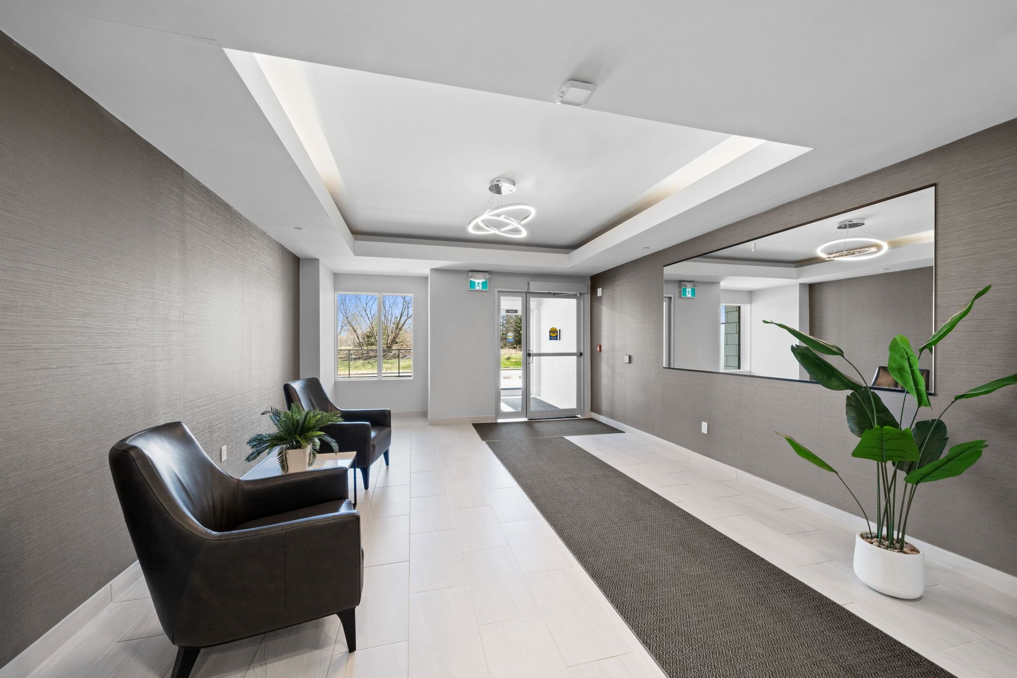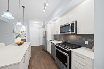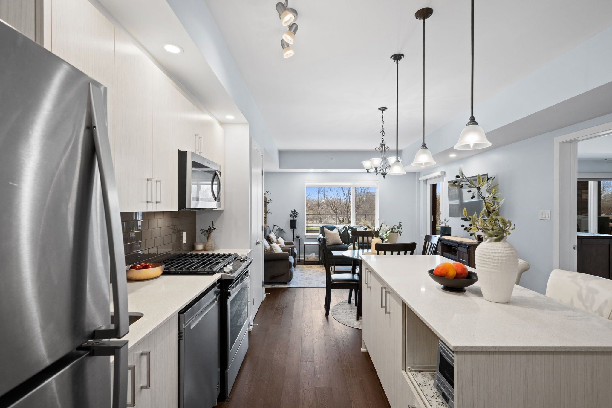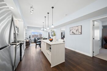 An inviting and modern lobby sets the tone as you enter the building, offering a welcoming first impression before stepping into the suite. Inside, a bright and open living space is defined by 9’ ceilings and rich hardwood flooring, creating a warm and airy atmosphere throughout. The stunning kitchen serves as the heart of the unit, featuring full-height cabinetry, quartz countertops, stainless steel appliances, a tiled backsplash, and a spacious island with additional storage, along with a convenient pantry.