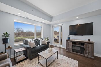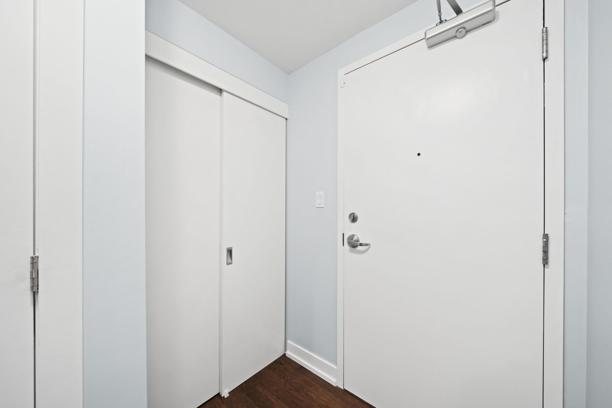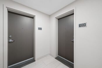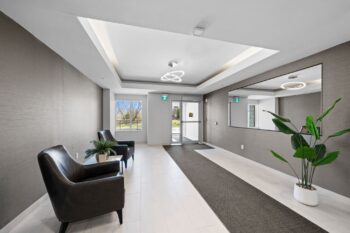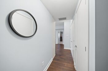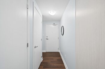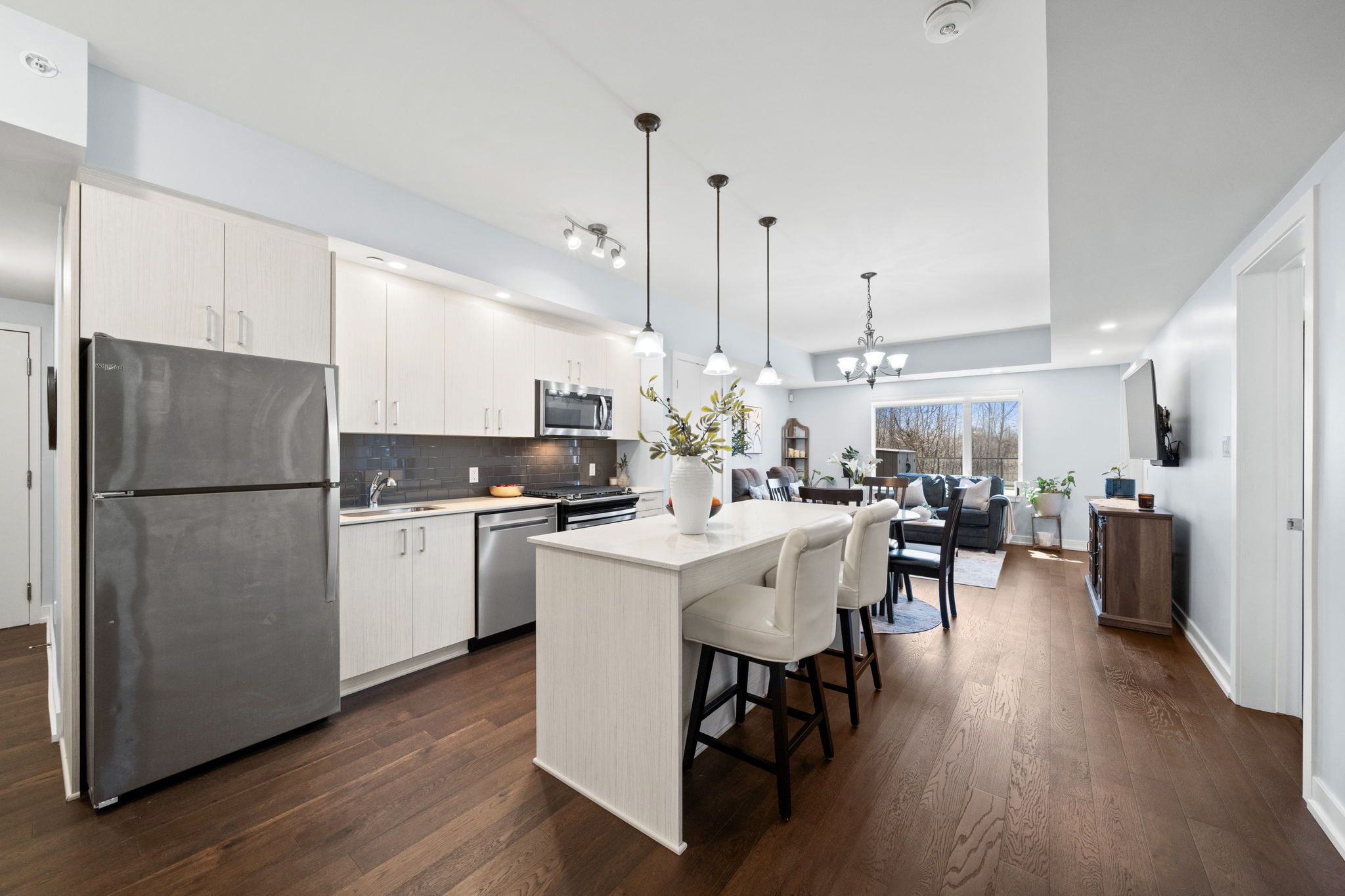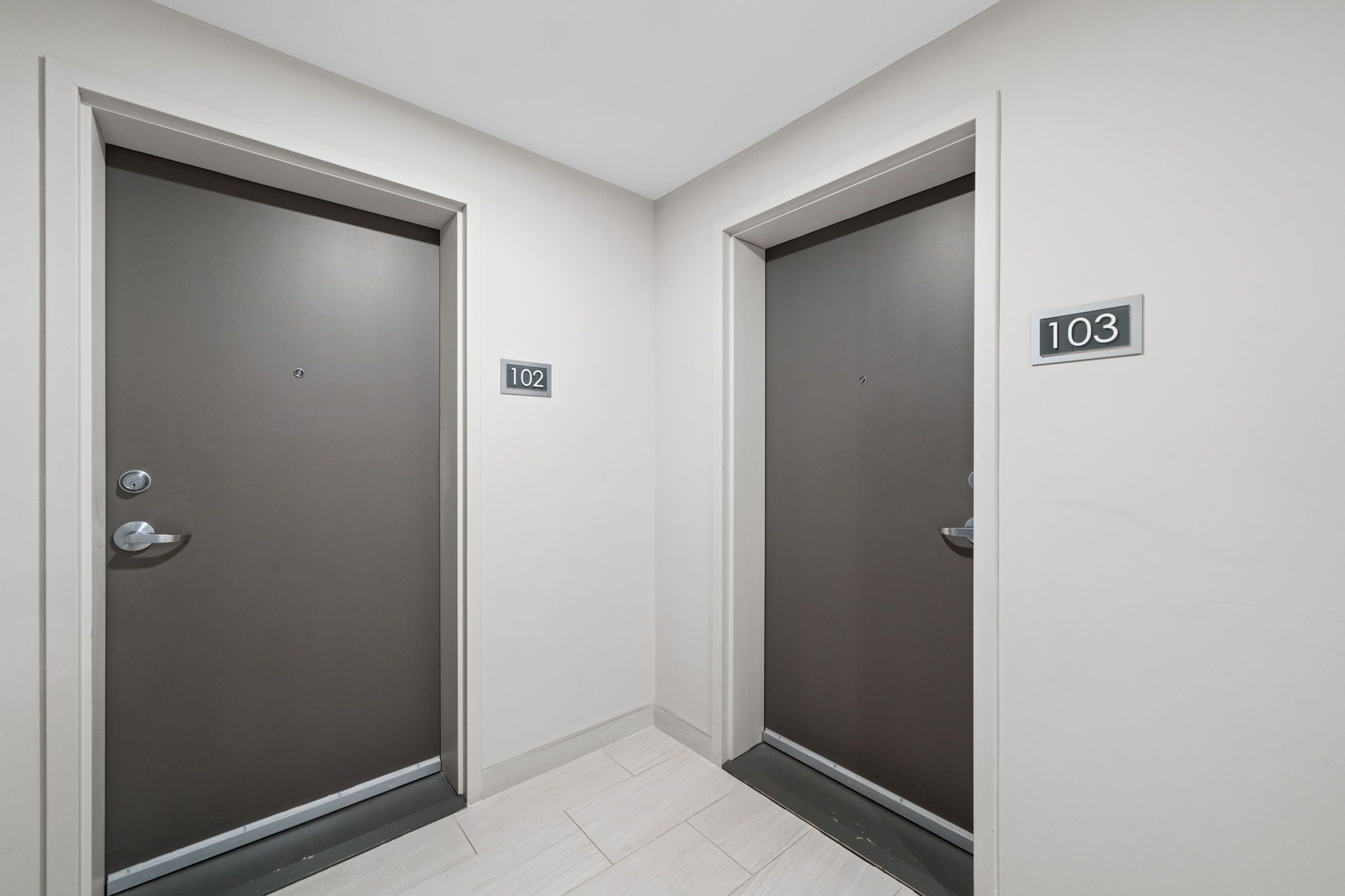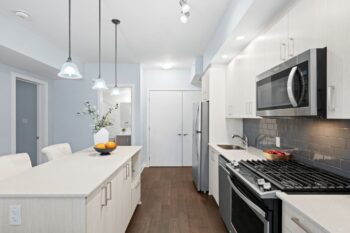 An inviting and modern lobby sets the tone as you enter the building, offering a welcoming first impression before stepping into the suite. Inside, a bright and open living space is defined by 9’ ceilings and rich hardwood flooring, creating a warm and airy atmosphere throughout. The stunning kitchen serves as the heart of the unit, featuring full-height cabinetry, quartz countertops, stainless steel appliances, a tiled backsplash, and a spacious island with additional storage, along with a convenient pantry.