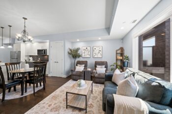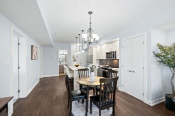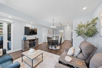 The dining area is highlighted by a chandelier and flows seamlessly into the sunlit living room, where large windows and pot lighting create an inviting space to relax or entertain. From here, step directly onto the terrace, offering a natural extension of the main living space.