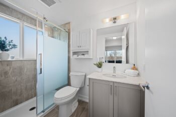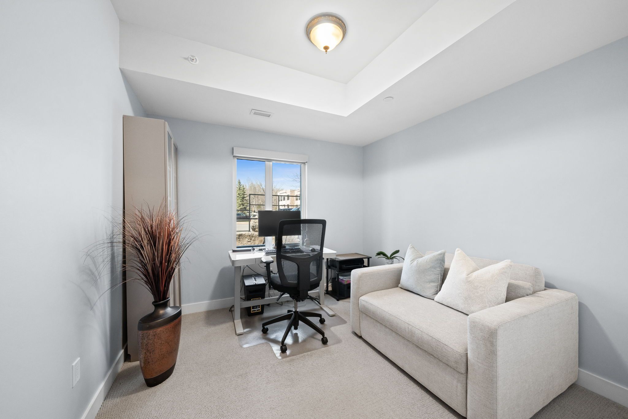 The primary bedroom is thoughtfully positioned and features upgraded Berber carpet, two large windows, and a generous walk-in closet. The ensuite bathroom is bright and well-appointed with a quartz vanity, glass shower with upgraded tile, a frosted window for privacy, and added storage. A versatile second bedroom, currently used as a home office, provides flexibility for guests or work-from-home needs. The main bathroom includes a quartz vanity, upgraded wall tile, and a tub/shower combo. Additional conveniences include in-suite laundry, a utility space, and a front hall closet.