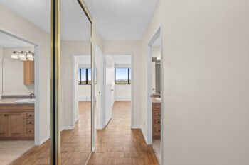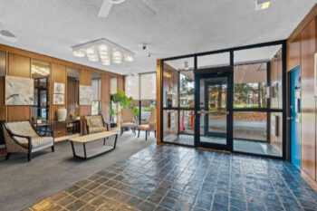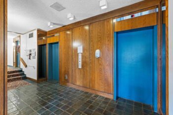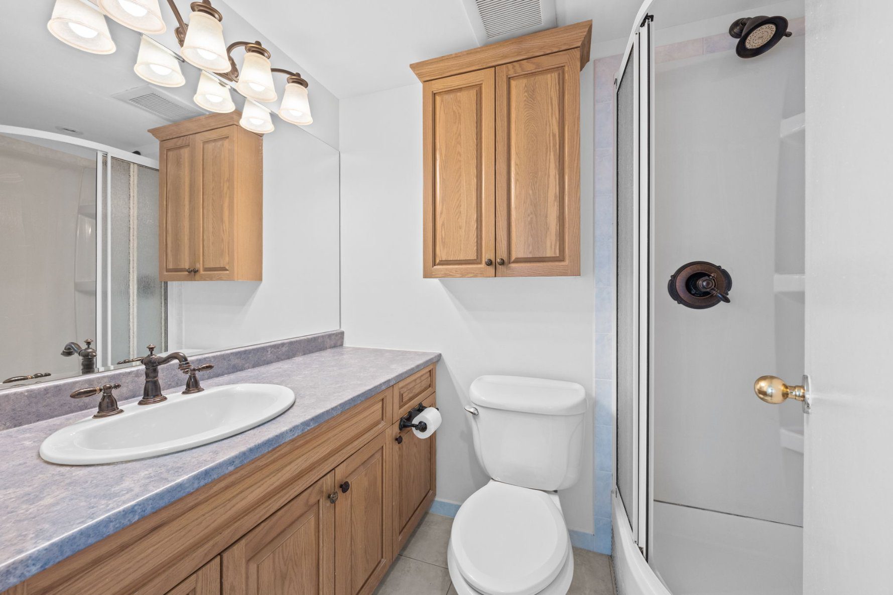 Two spacious bedrooms offer excellent furniture placement, complemented by an updated bath with a large vanity, oak cabinetry, and standalone shower. A generous linen/storage closet in the hallway plus a large storage room near the entrance provide ample space.