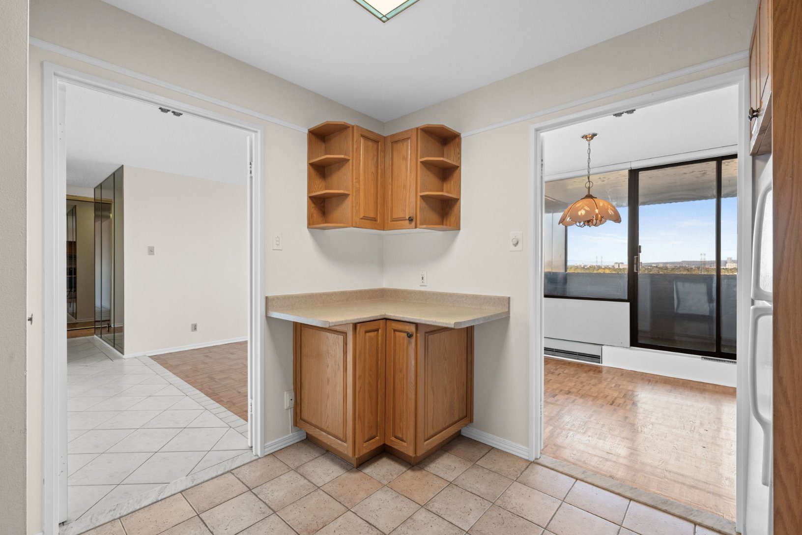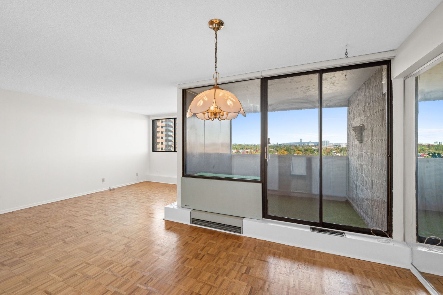 Inside, a welcoming foyer with ceramic tile flooring leads to a bright, open living and dining area with rich parquet flooring and large windows that fill the space with natural light. A generous balcony extends your living area outdoors—perfect for morning coffee or evening relaxation.