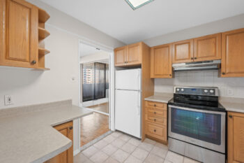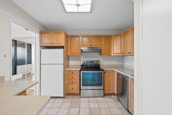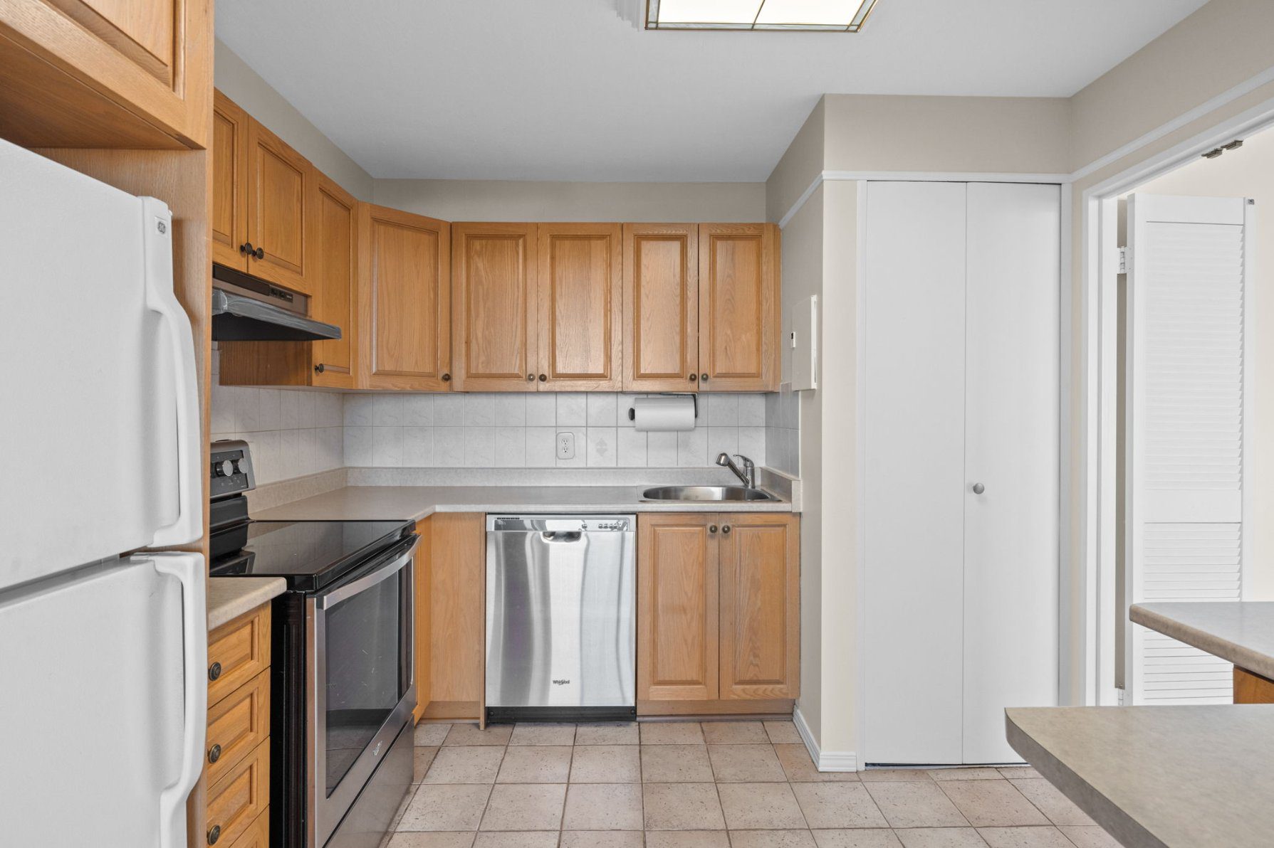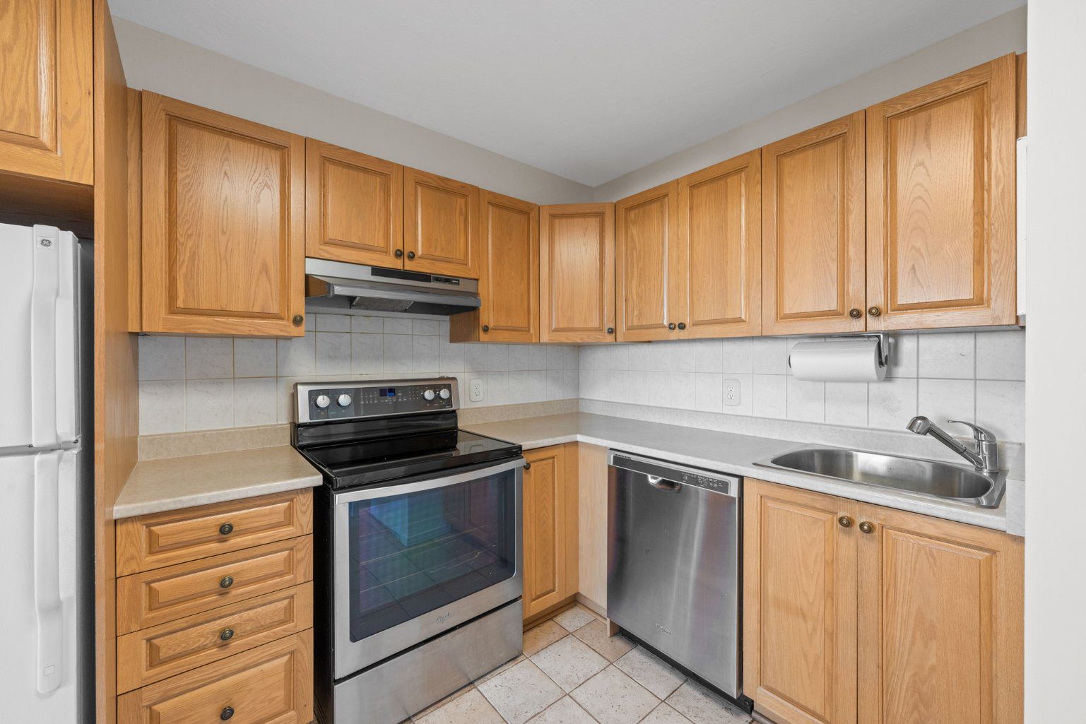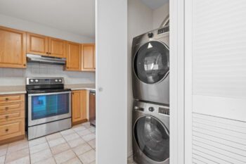 The updated kitchen features raised-panel oak cabinetry, stainless-steel appliances (stove, dishwasher, hood fan), a white refrigerator, and an additional section of upper and lower cabinets for extra storage and workspace. A stacked washer and dryer are neatly tucked behind cabinetry.