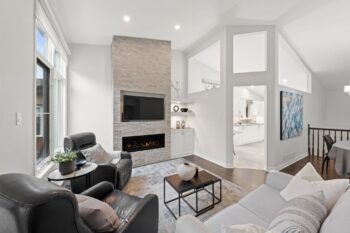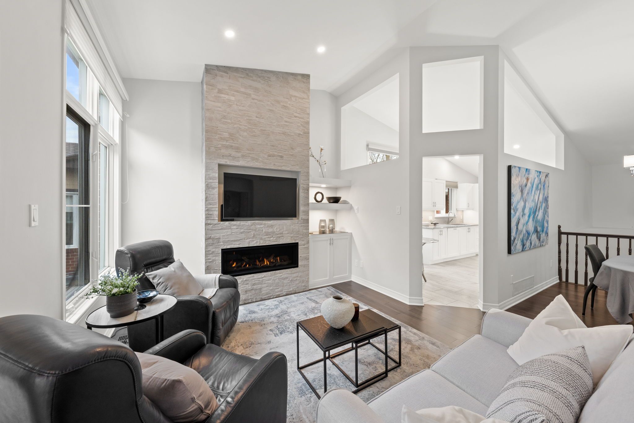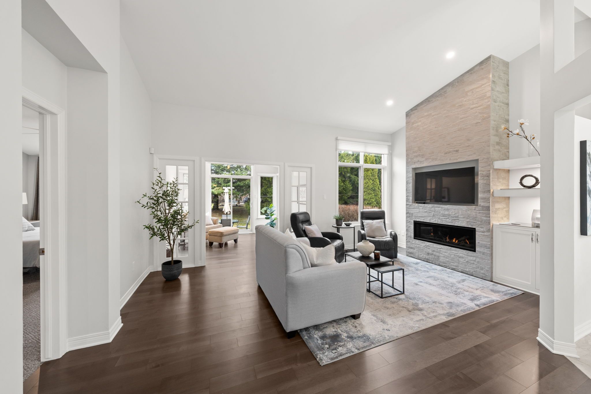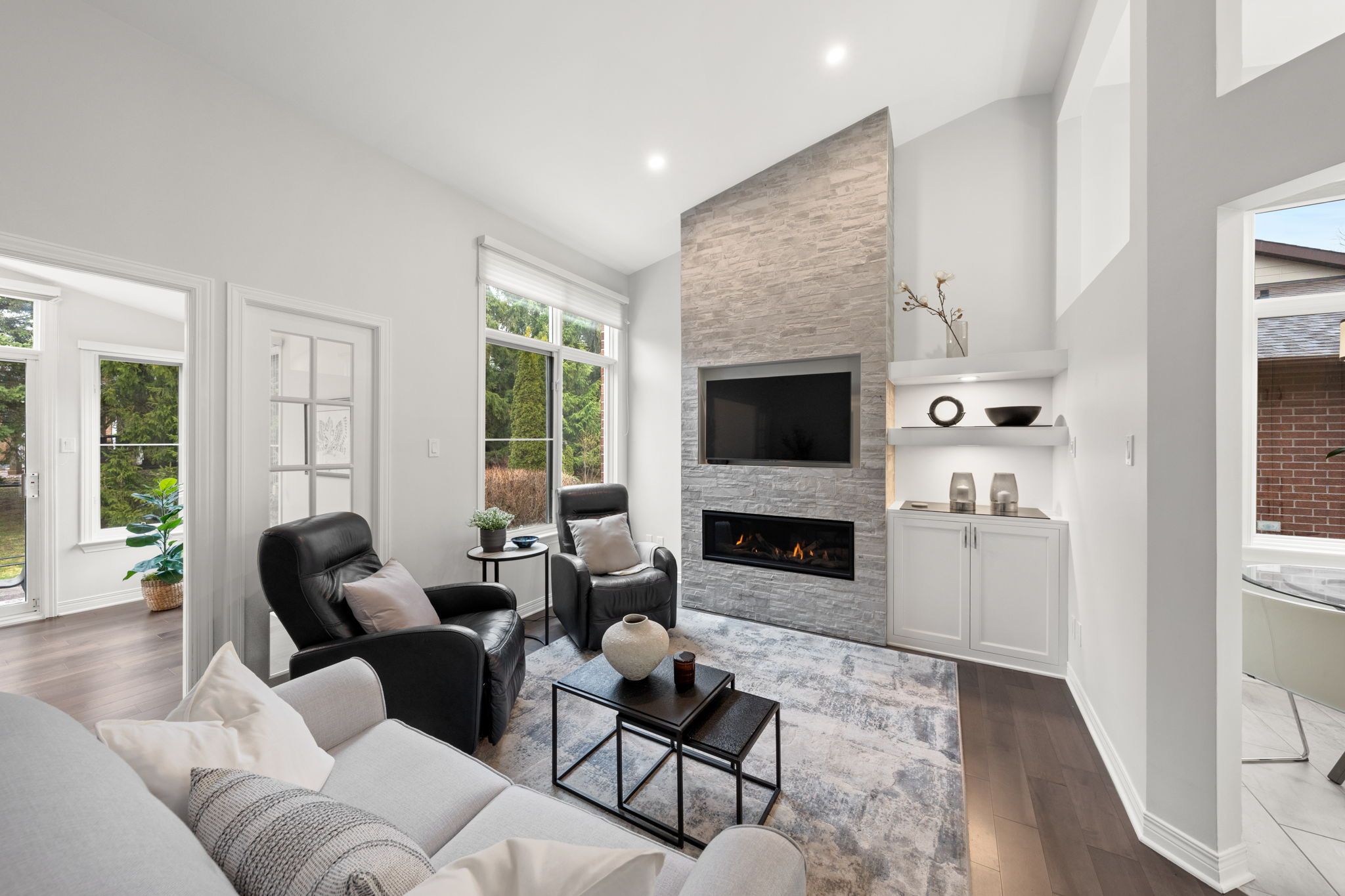 A welcoming interlock driveway and walkway lead through landscaped gardens to a covered front porch with a new epoxy floor (2025). Inside, a bright tiled foyer opens to hardwood floors (2017) and a spacious dining area, where vaulted ceilings and architectural wall cutouts create an open, airy feel. The living room is a true focal point, featuring a gas fireplace with a striking stone surround, built-in television above, and custom cabinetry and shelving with integrated lighting. French-style glass panels frame the entry to the sunroom, a bright and inviting space with vaulted ceiling, expansive windows, and a patio door leading to the backyard.