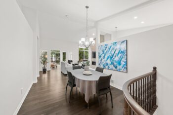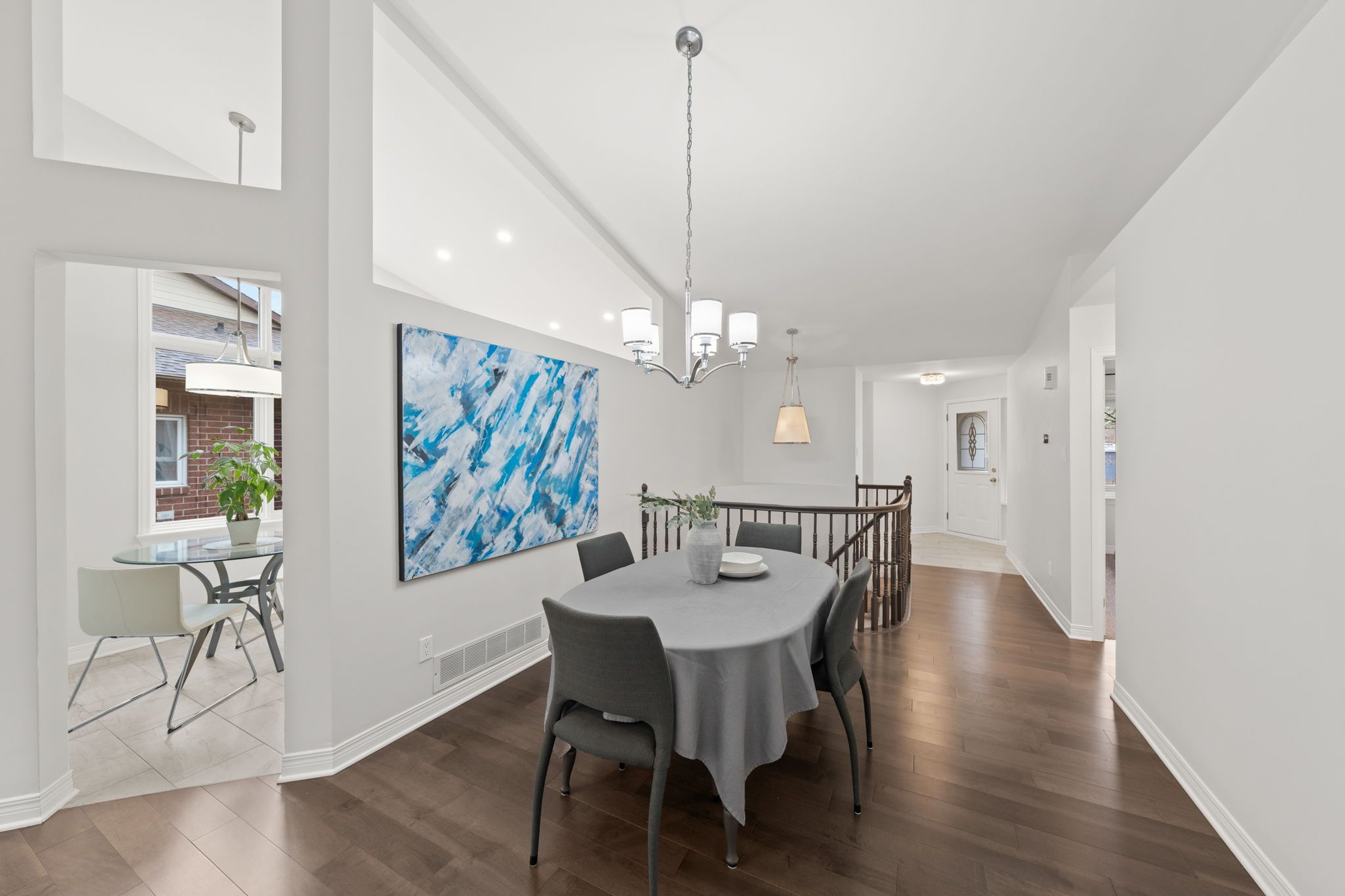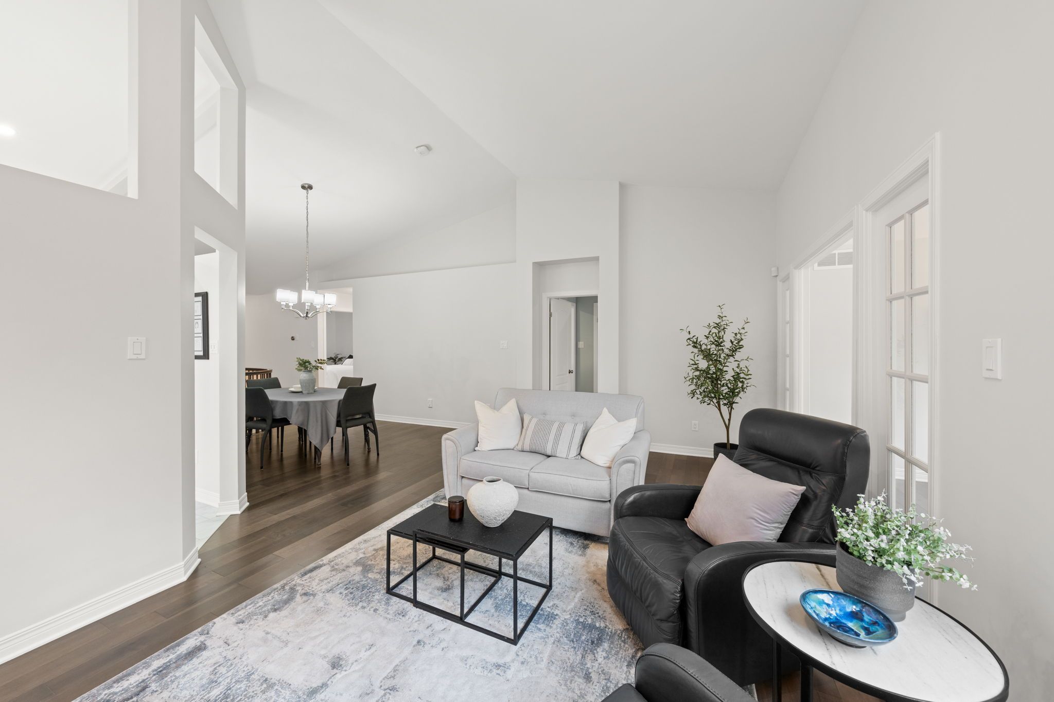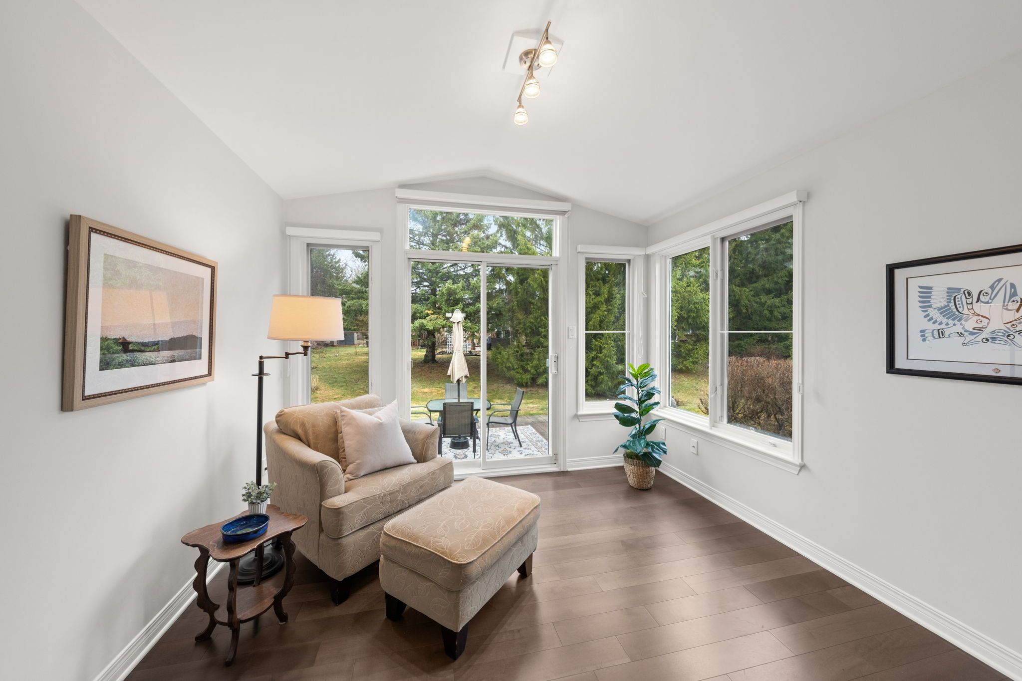 A welcoming interlock driveway and walkway lead through landscaped gardens to a covered front porch with a new epoxy floor (2025). Inside, a bright tiled foyer opens to hardwood floors (2017) and a spacious dining area, where vaulted ceilings and architectural wall cutouts create an open, airy feel. The living room is a true focal point, featuring a gas fireplace with a striking stone surround, built-in television above, and custom cabinetry and shelving with integrated lighting. French-style glass panels frame the entry to the sunroom, a bright and inviting space with vaulted ceiling, expansive windows, and a patio door leading to the backyard.