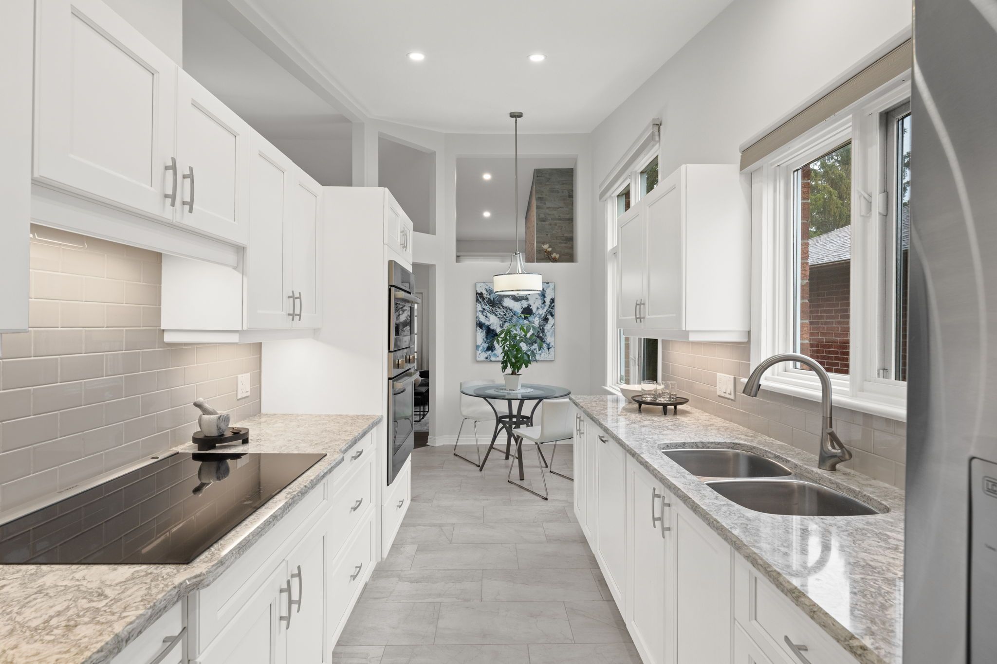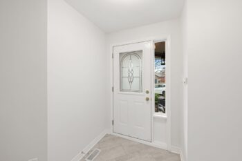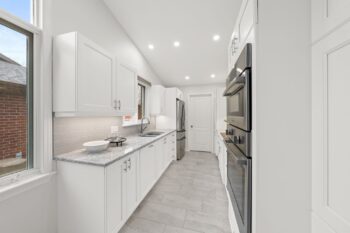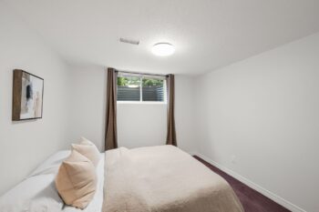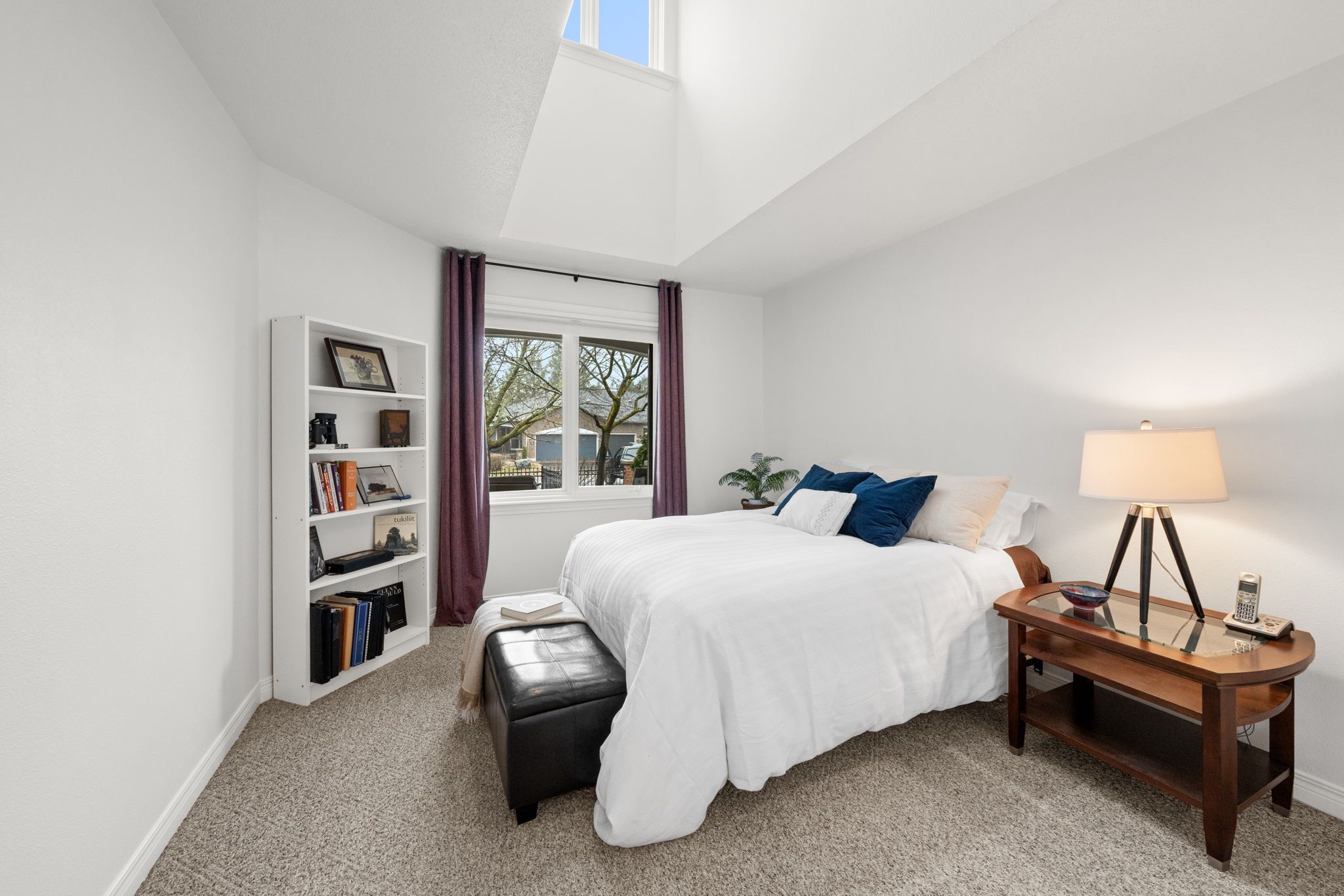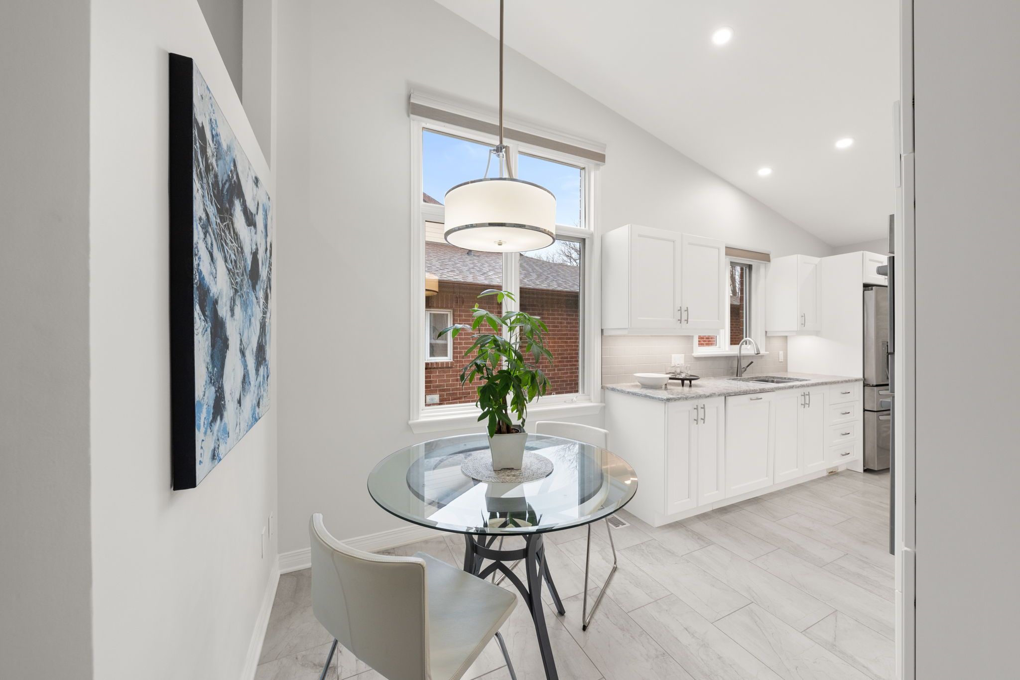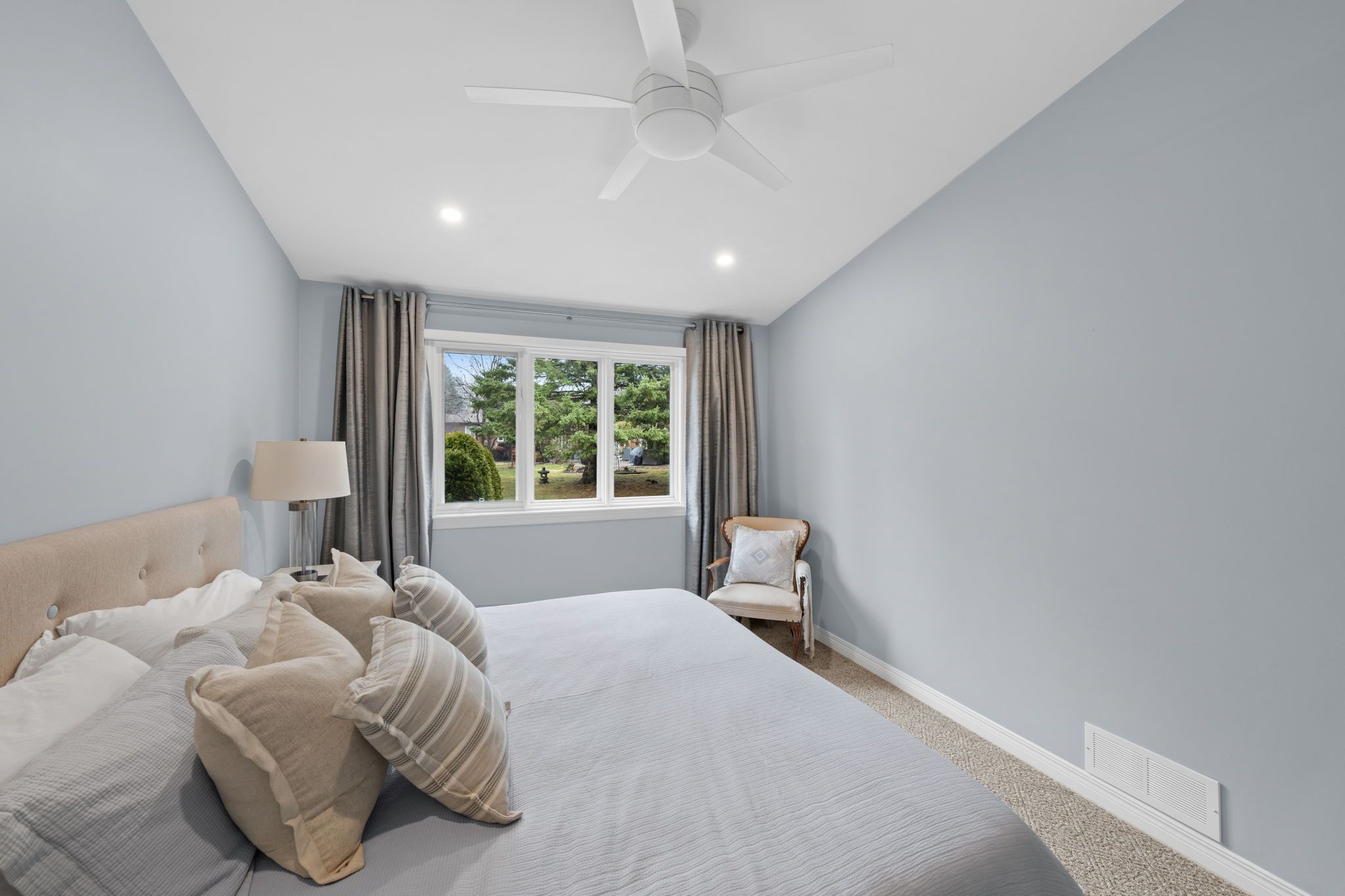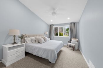 The renovated kitchen (2017) is both stylish and functional, offering white cabinetry, subway tile backsplash, quartz countertops, stainless steel appliances, pot lighting, ample pantry storage, and an eating area with a large window and automatic blinds. The primary bedroom is a peaceful retreat with vaulted ceiling, views of the backyard, and a spacious walk-in closet. The spa-inspired ensuite (2019) features a custom quartz vanity, a beautifully tiled glass rainfall shower with built-in niches and bench, and an impressive amount of storage. A second bedroom with skylight and large closet overlooks the front porch, while the renovated main bathroom (2019) includes a tub and shower combination, ideal for guests. The main floor is completed by a well-designed laundry room with cabinetry and direct access to the foyer, kitchen, and garage, making day-to-day living especially convenient.