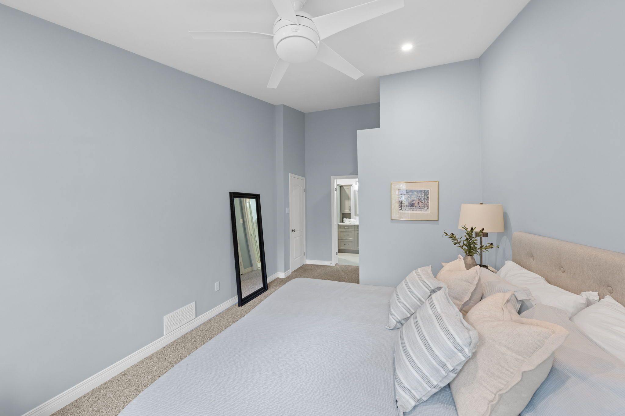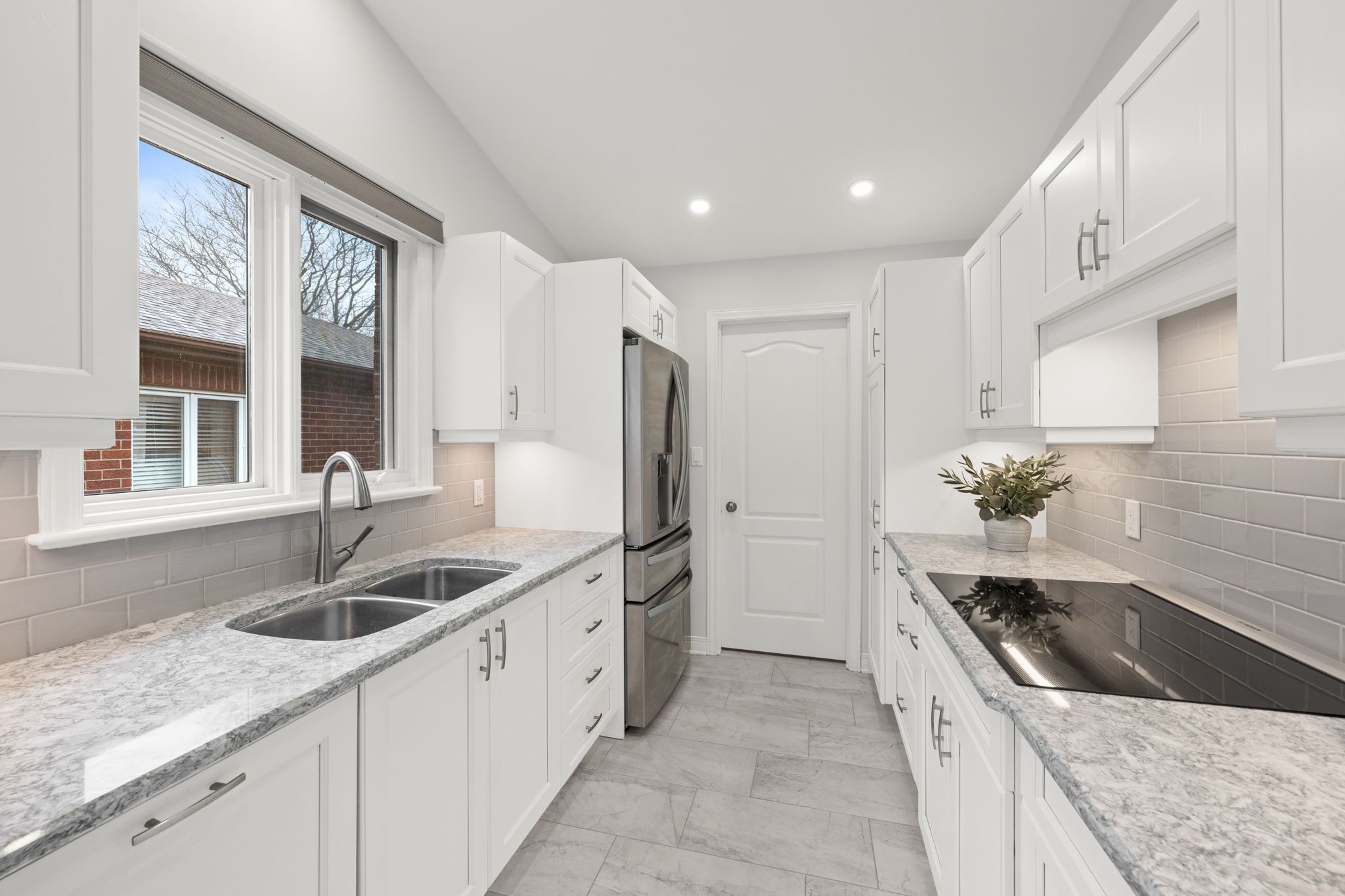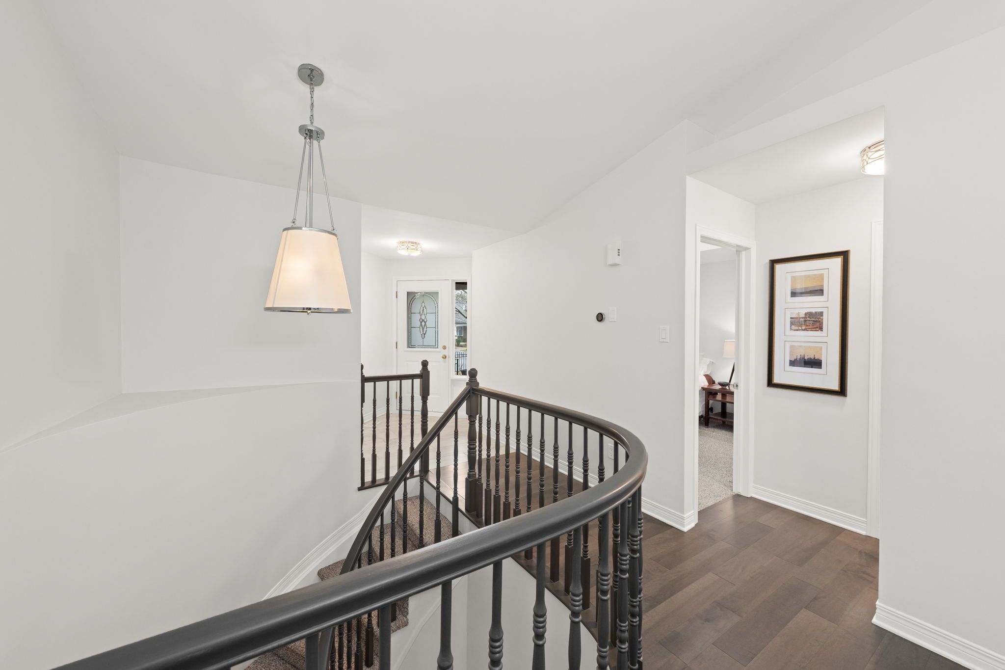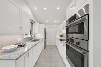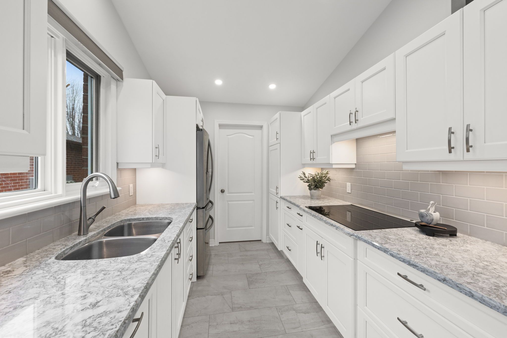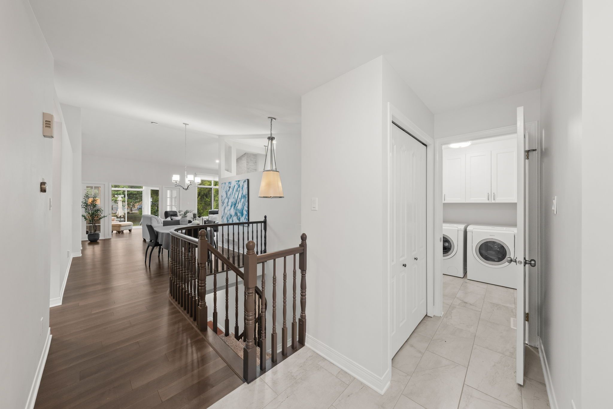 The renovated kitchen (2017) is both stylish and functional, offering white cabinetry, subway tile backsplash, quartz countertops, stainless steel appliances, pot lighting, ample pantry storage, and an eating area with a large window and automatic blinds. The primary bedroom is a peaceful retreat with vaulted ceiling, views of the backyard, and a spacious walk-in closet. The spa-inspired ensuite (2019) features a custom quartz vanity, a beautifully tiled glass rainfall shower with built-in niches and bench, and an impressive amount of storage. A second bedroom with skylight and large closet overlooks the front porch, while the renovated main bathroom (2019) includes a tub and shower combination, ideal for guests. The main floor is completed by a well-designed laundry room with cabinetry and direct access to the foyer, kitchen, and garage, making day-to-day living especially convenient.