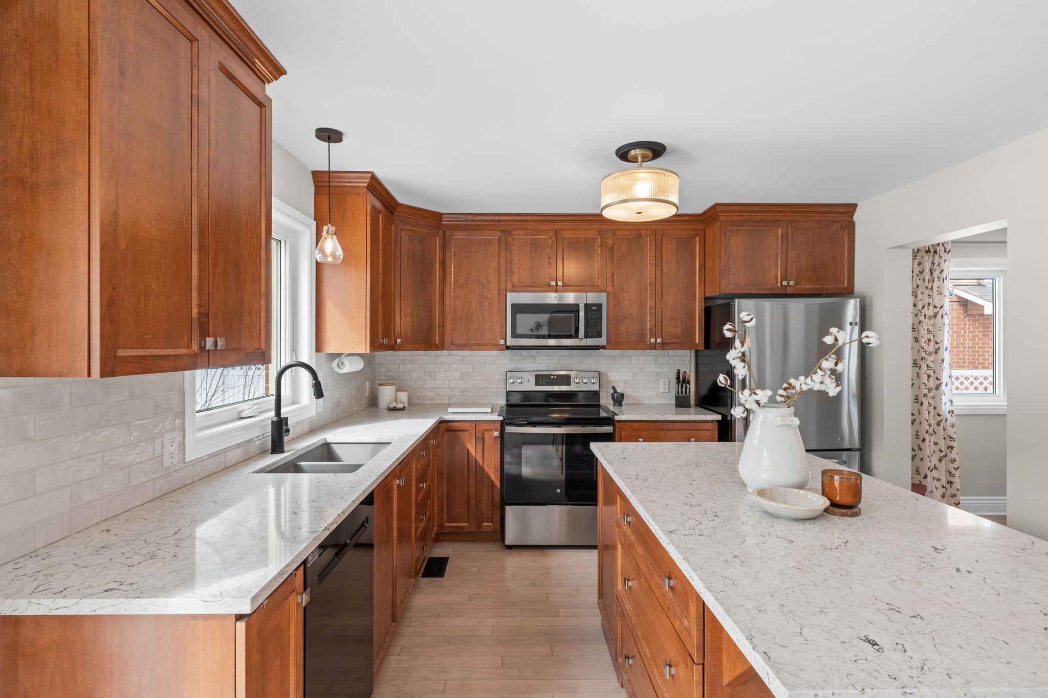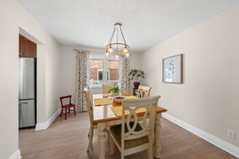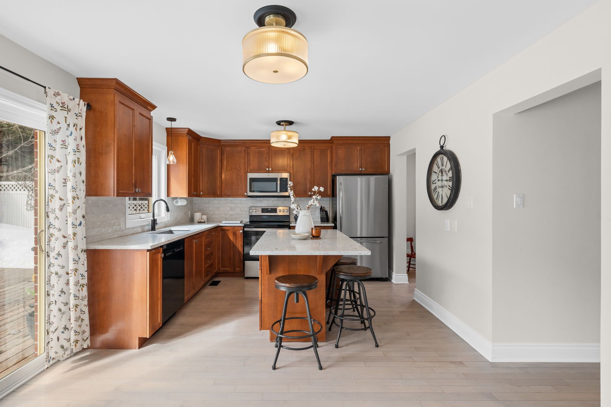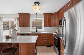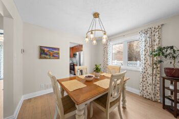 The beautifully updated eat-in kitchen features new granite counters and sink (2024), new dishwasher, stove and microwave (2025), ample cabinetry, and a functional island with storage and barstool seating. Sliding doors provide direct access to the back deck, making it easy to step outside for outdoor dining or relaxing in the backyard. Nearby, the generous dining room offers a bright window and modern light fixture, creating the perfect setting for family meals and entertaining.