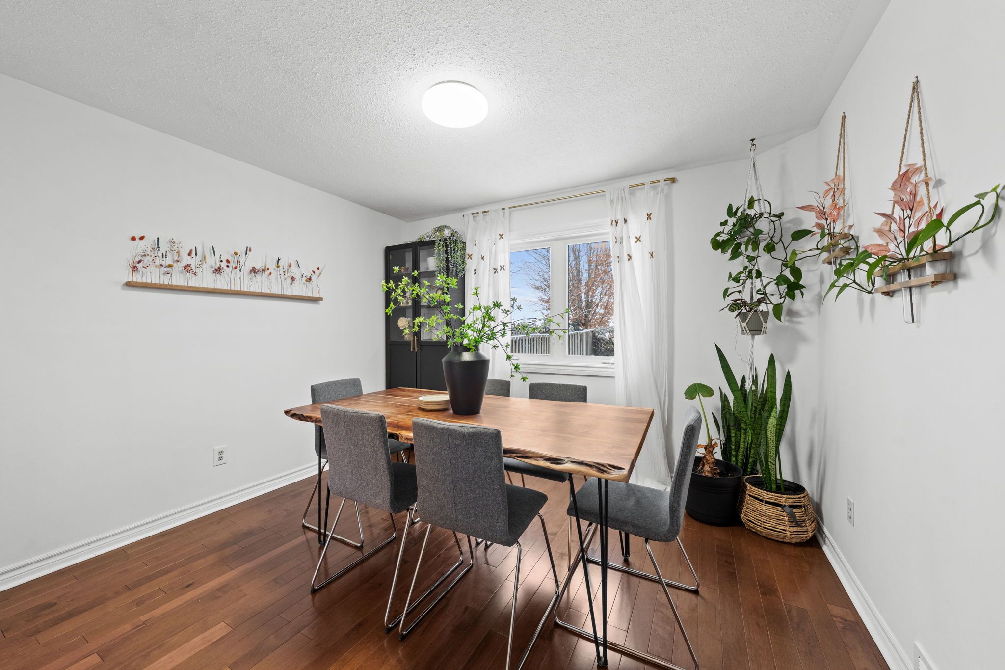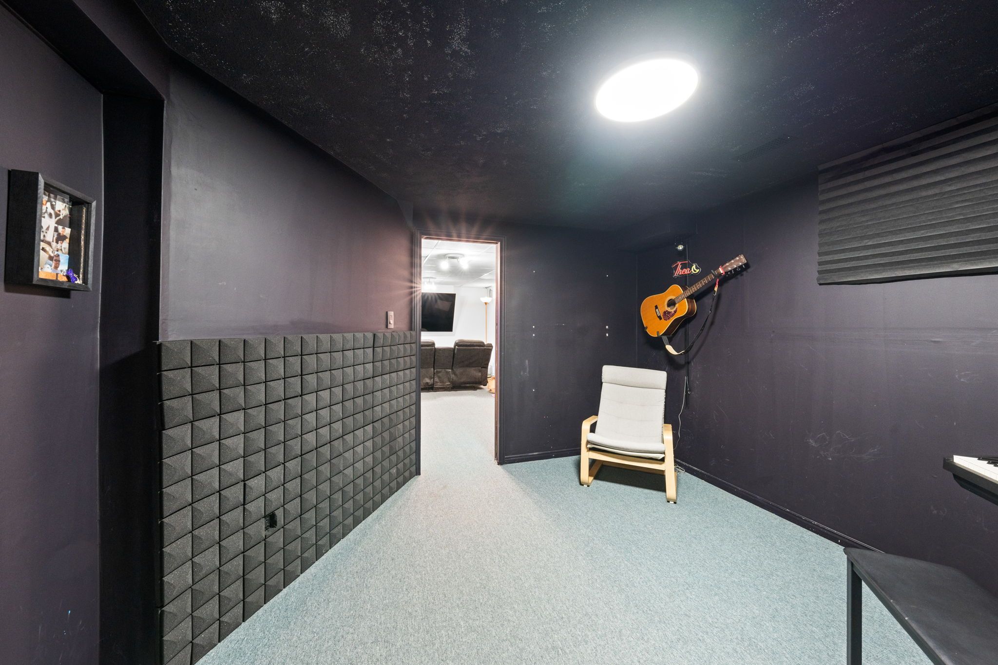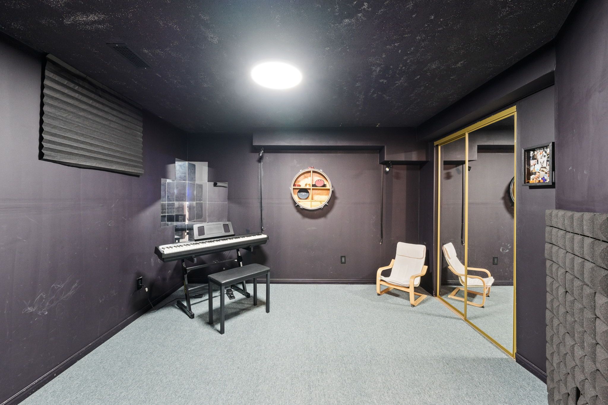 Wall mounted televisions & wall brackets, Ikea cabinet in dining room, wall decor in dining room, drapes in dining room & breakfast nook, metal tool wall, spot lights in music room