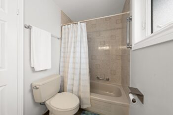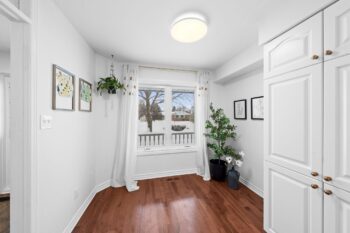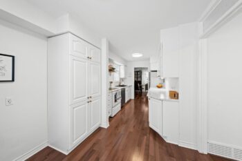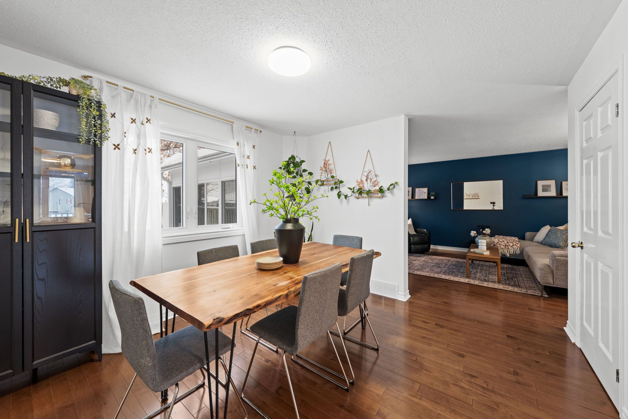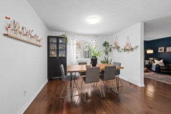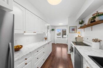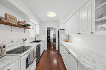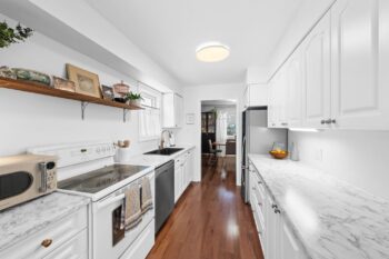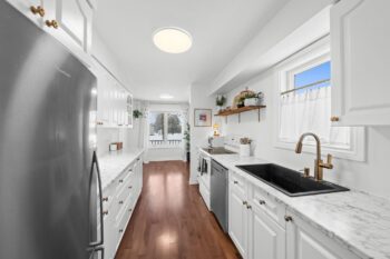 Across from the living room, the dining area flows seamlessly into the updated kitchen. Thoughtfully refreshed, the kitchen showcases stylish white cabinetry, wood shelving, brass hardware and faucet, a deep black sink, pantry storage, and a cozy breakfast nook overlooking the front of the home.