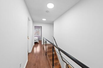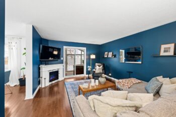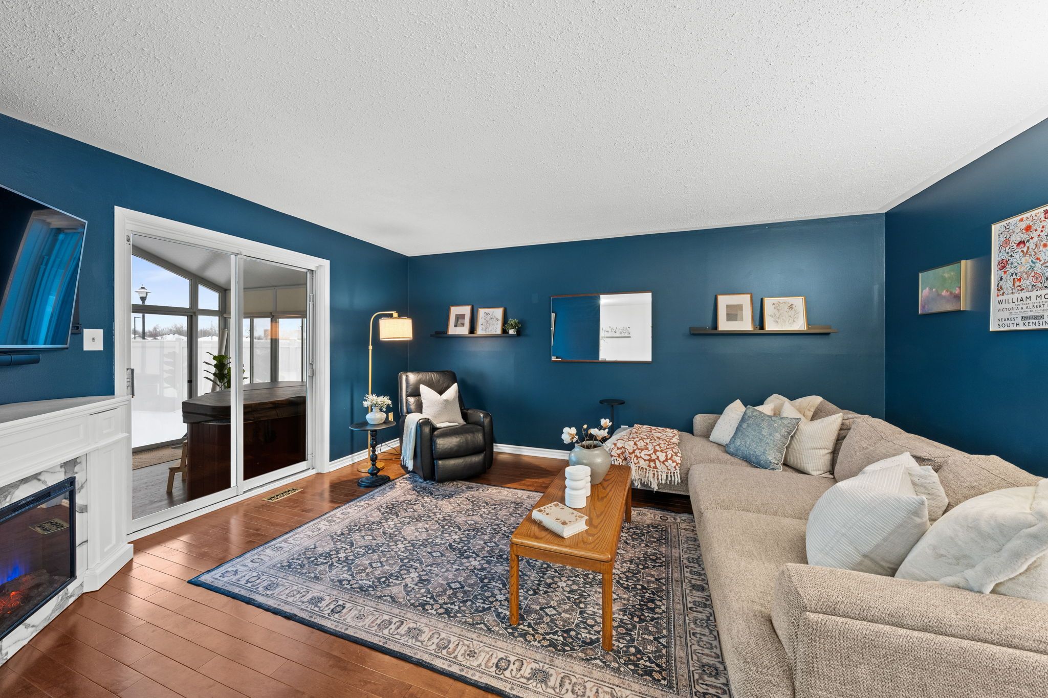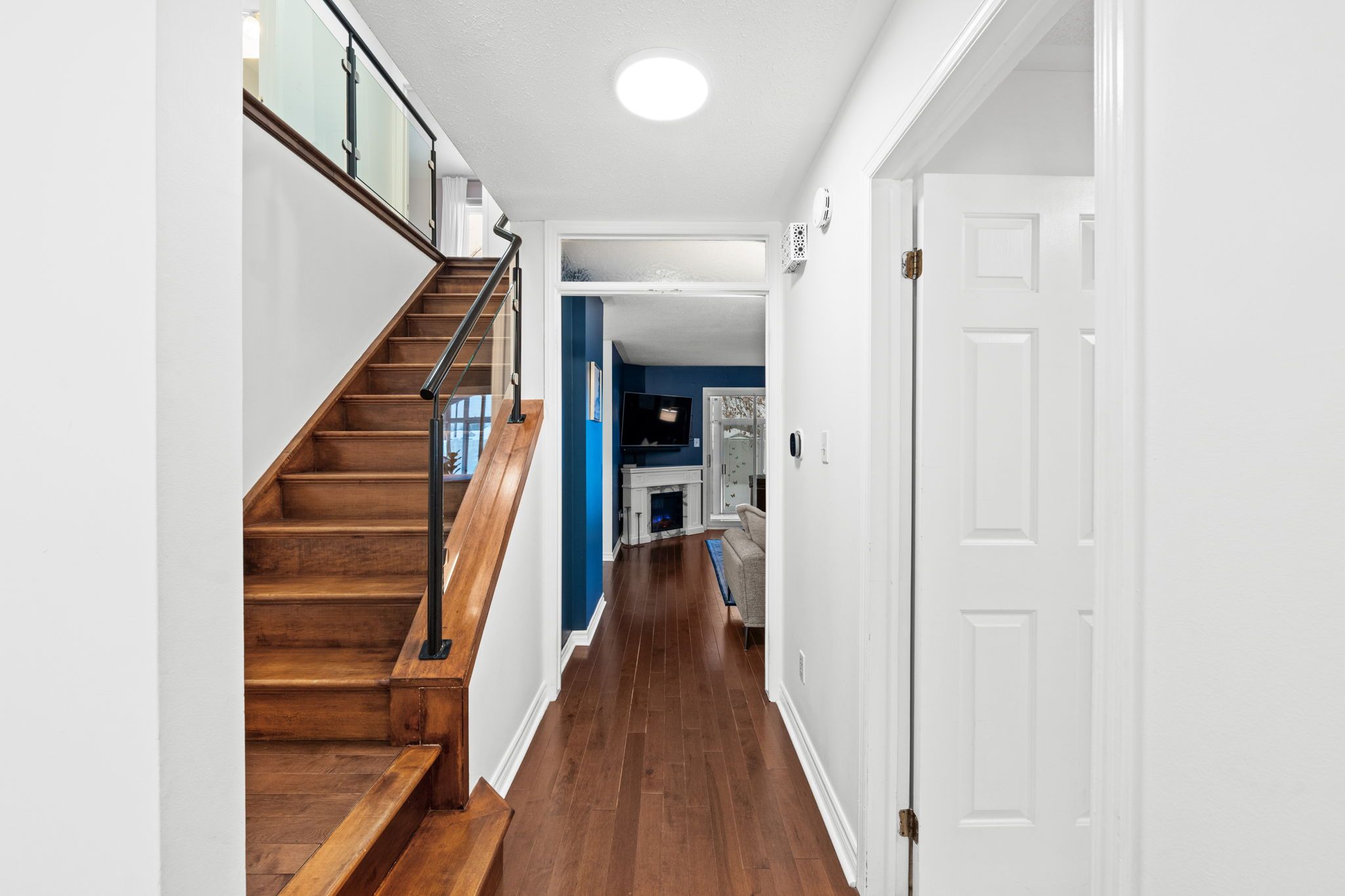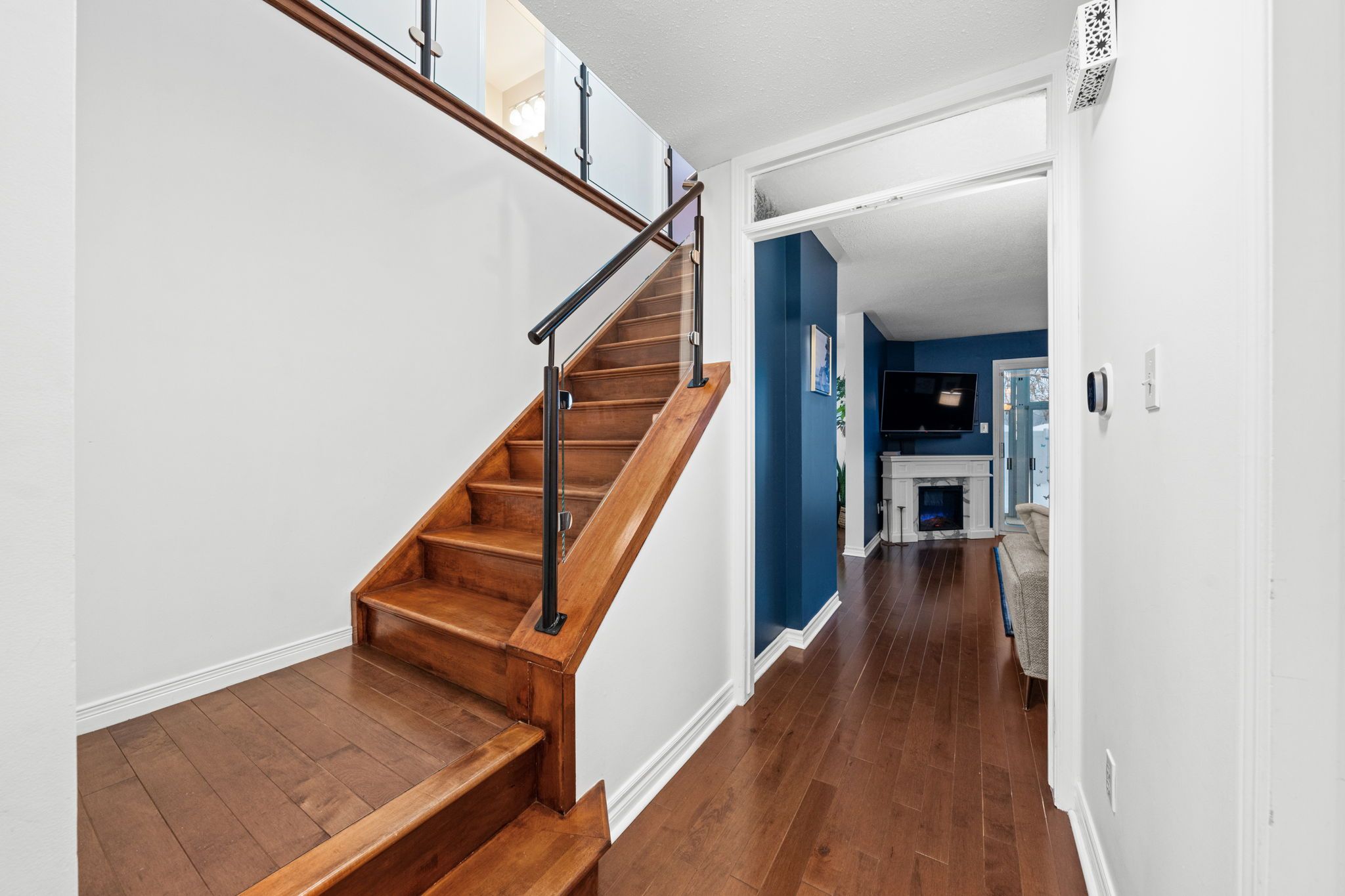 Step into a bright and welcoming entryway featuring hardwood floors and a striking staircase with modern glass railings. The spacious living room is filled with natural light and anchored by an electric fireplace, with sliding doors that lead to the vaulted sunroom.