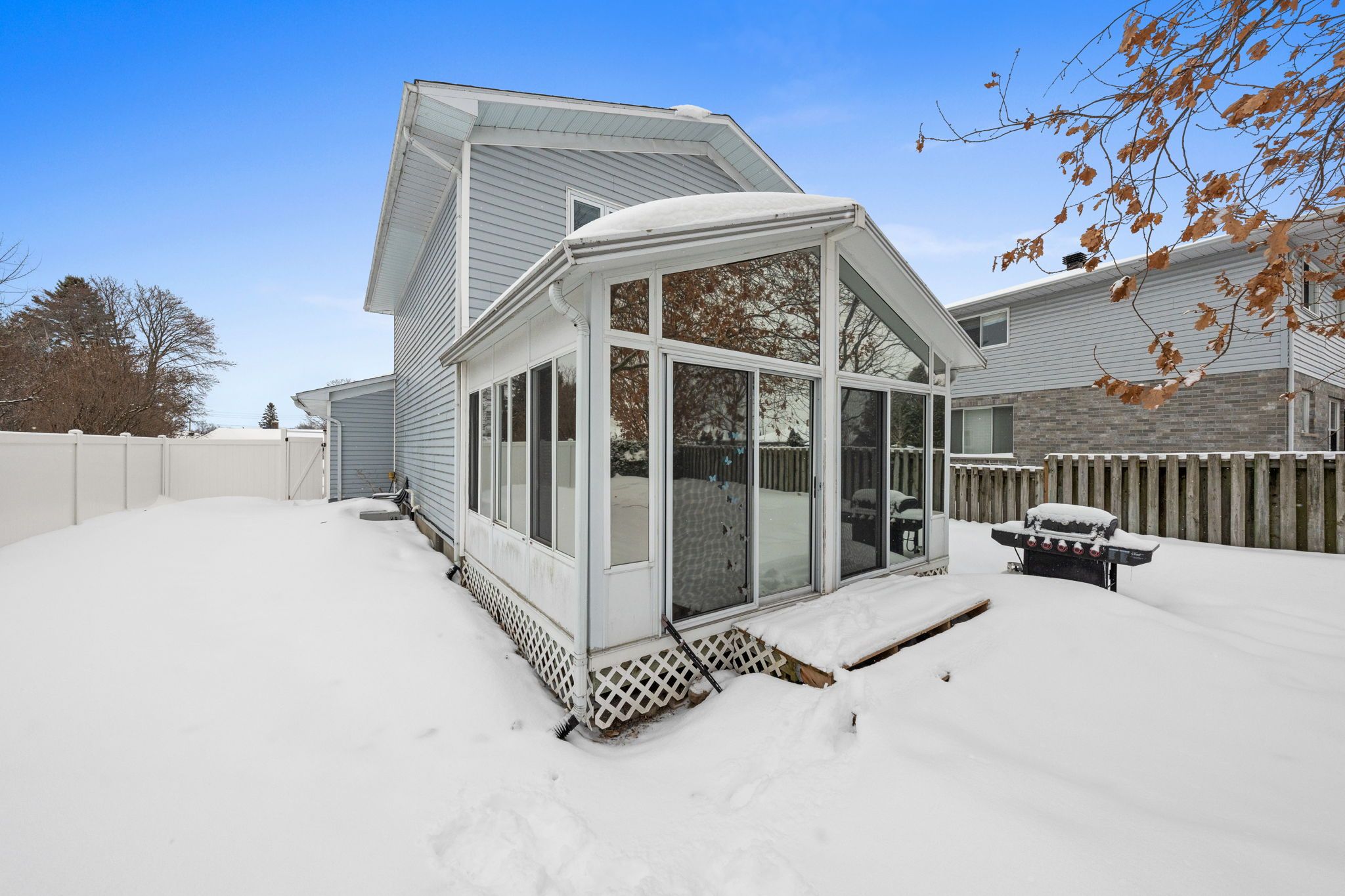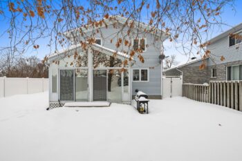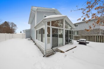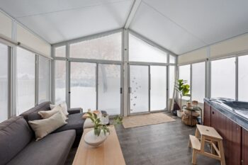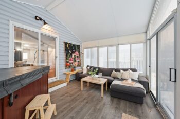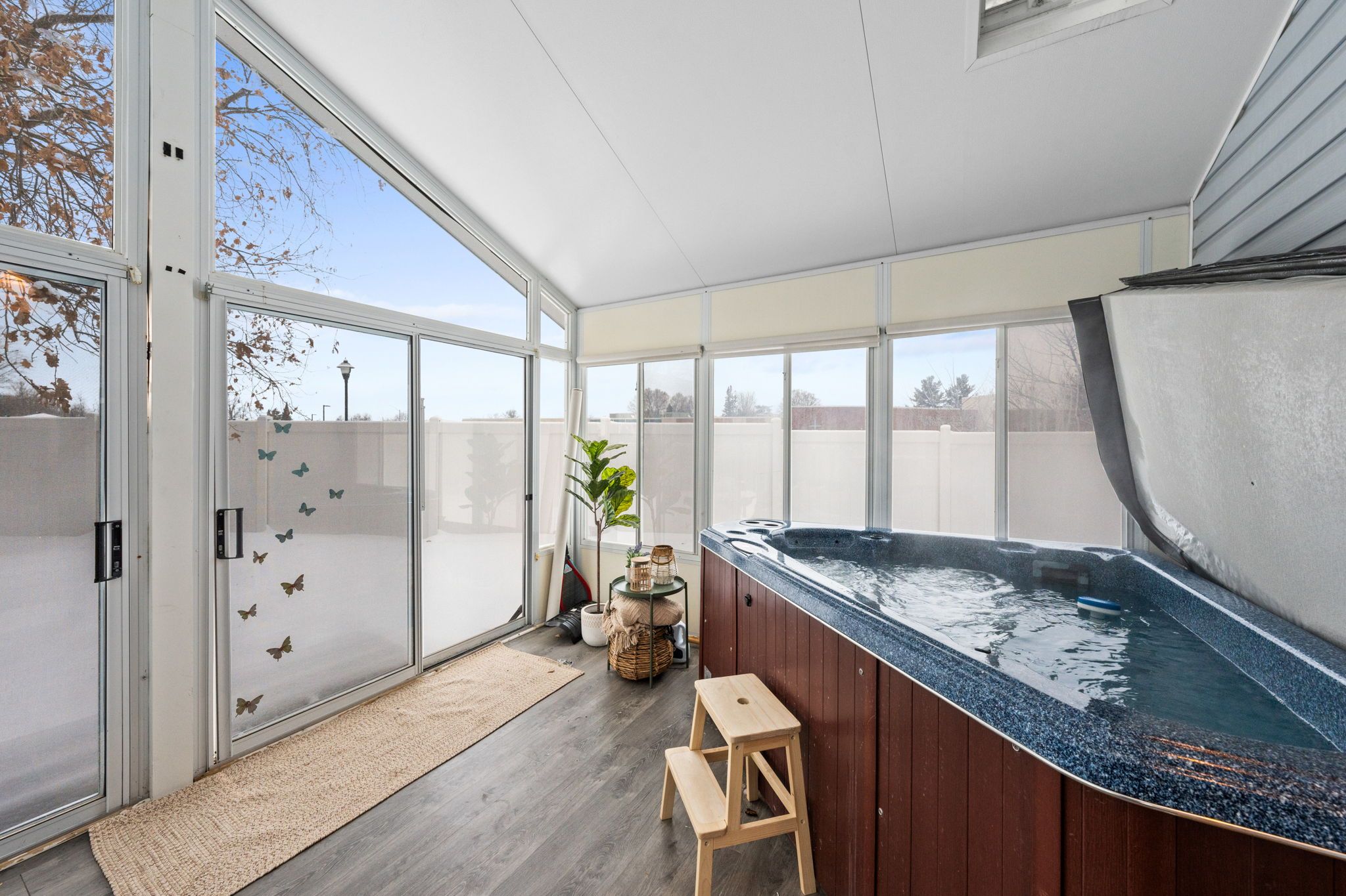 The vaulted sunroom is an incredible extension of the living space and can be enjoyed year-round. Complete with a hot tub and views of the backyard, it creates a perfect setting for relaxing or entertaining in every season.
