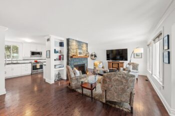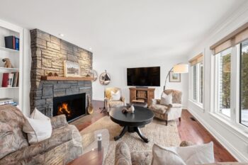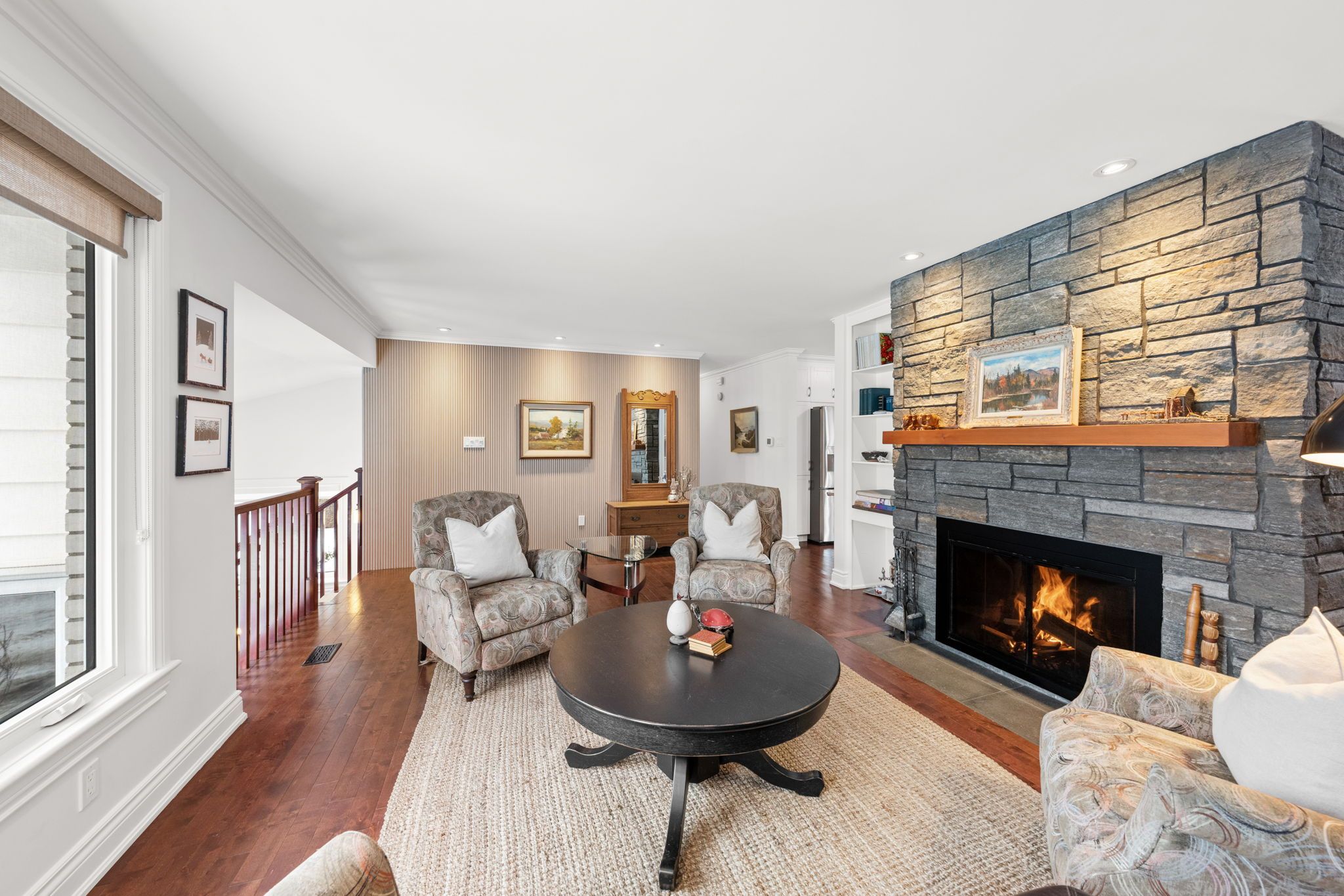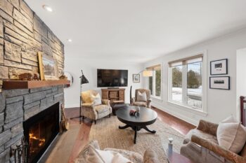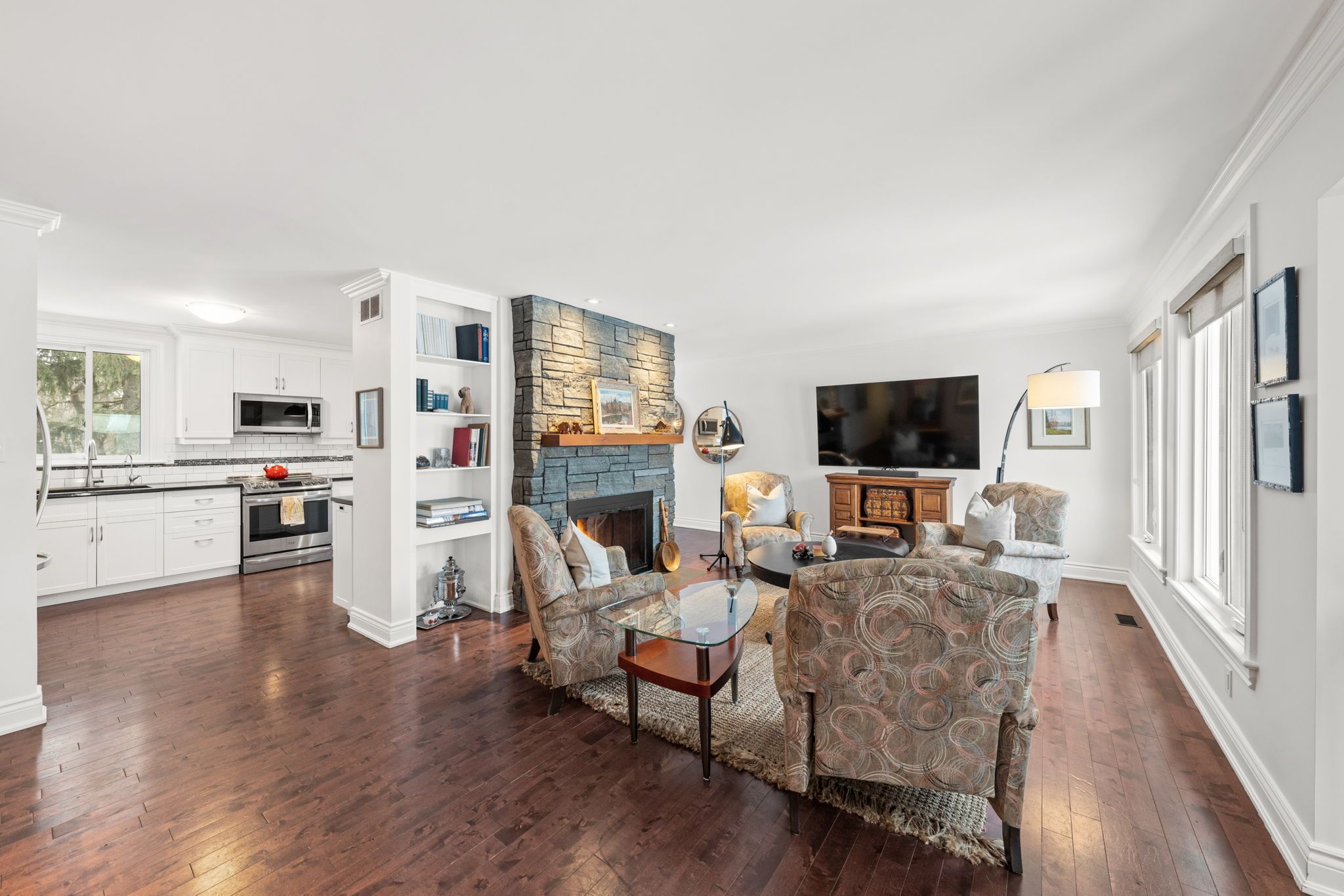 The bright living room is anchored by a stunning stone-surround wood-burning fireplace (WETT certified in 2020), complete with built-in shelving and accent wall detail that adds warmth and presence to the space.