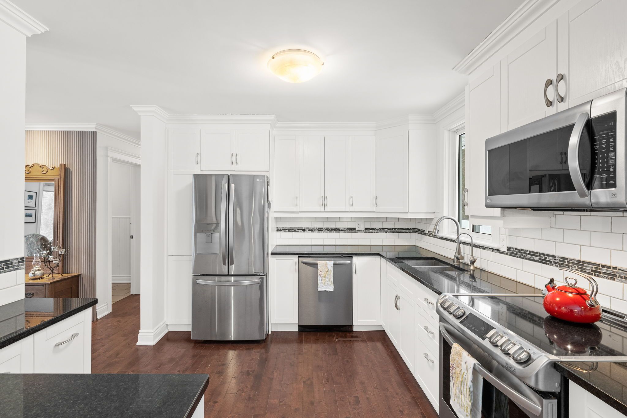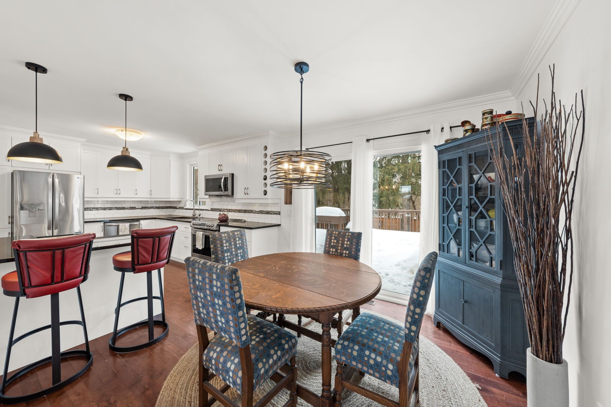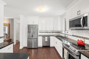 The kitchen is both functional and stylish, offering black granite countertops, white shaker cabinetry, stainless steel appliances, tiled backsplash, and a convenient breakfast bar. The adjoining dining area is filled with natural light and features sliding doors that open to the deck, creating seamless indoor-outdoor flow.