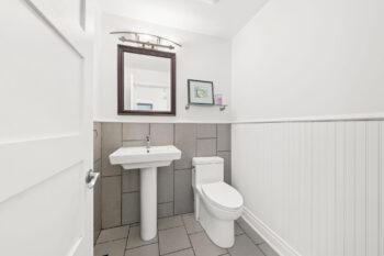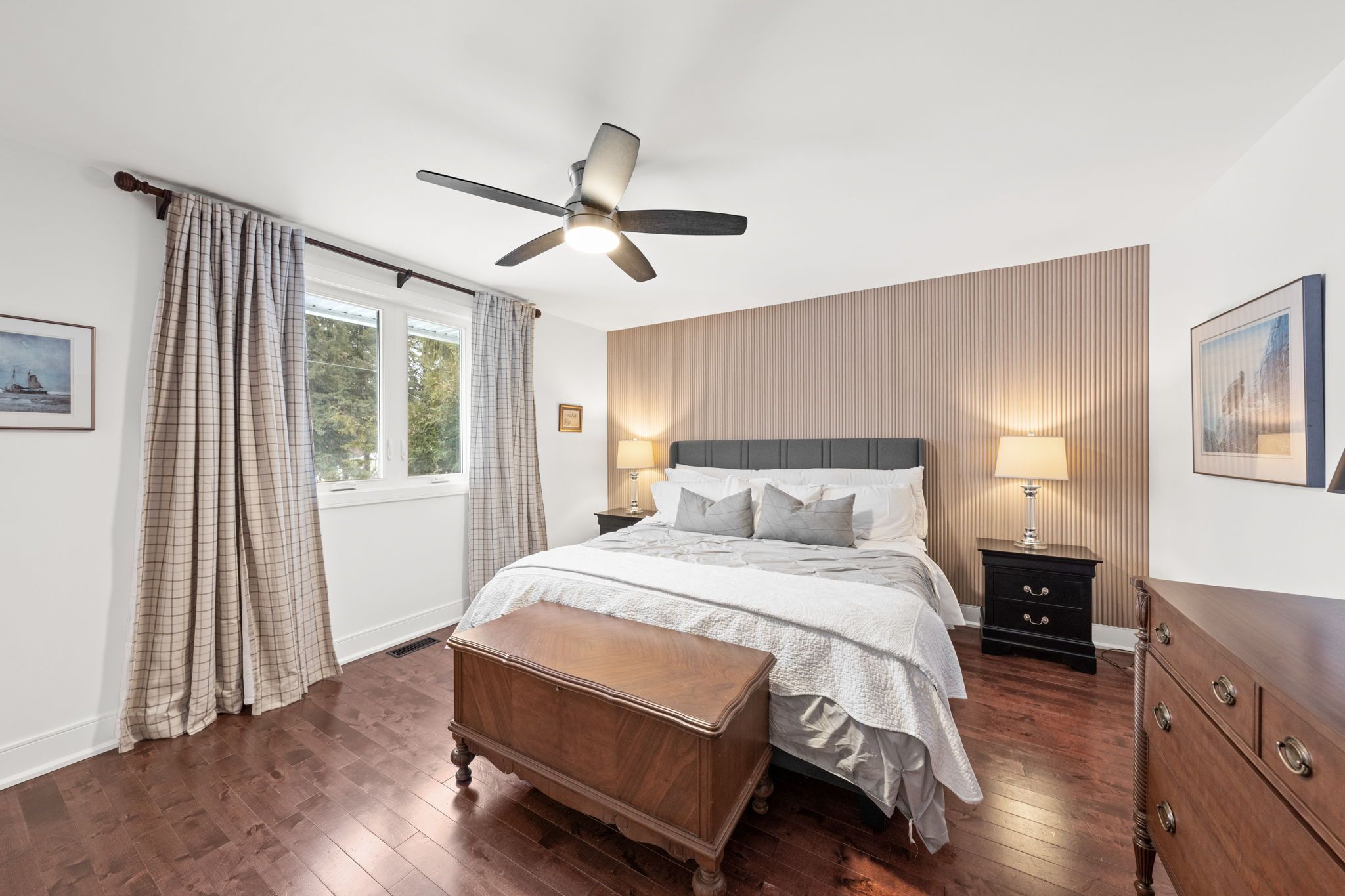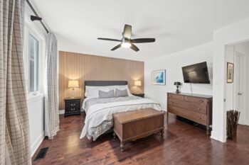 The primary bedroom with ceiling fan and accent wall overlooks the front of the home and includes a spacious walk-in closet and private ensuite. Two additional bedrooms and a well-appointed powder room complete this level.