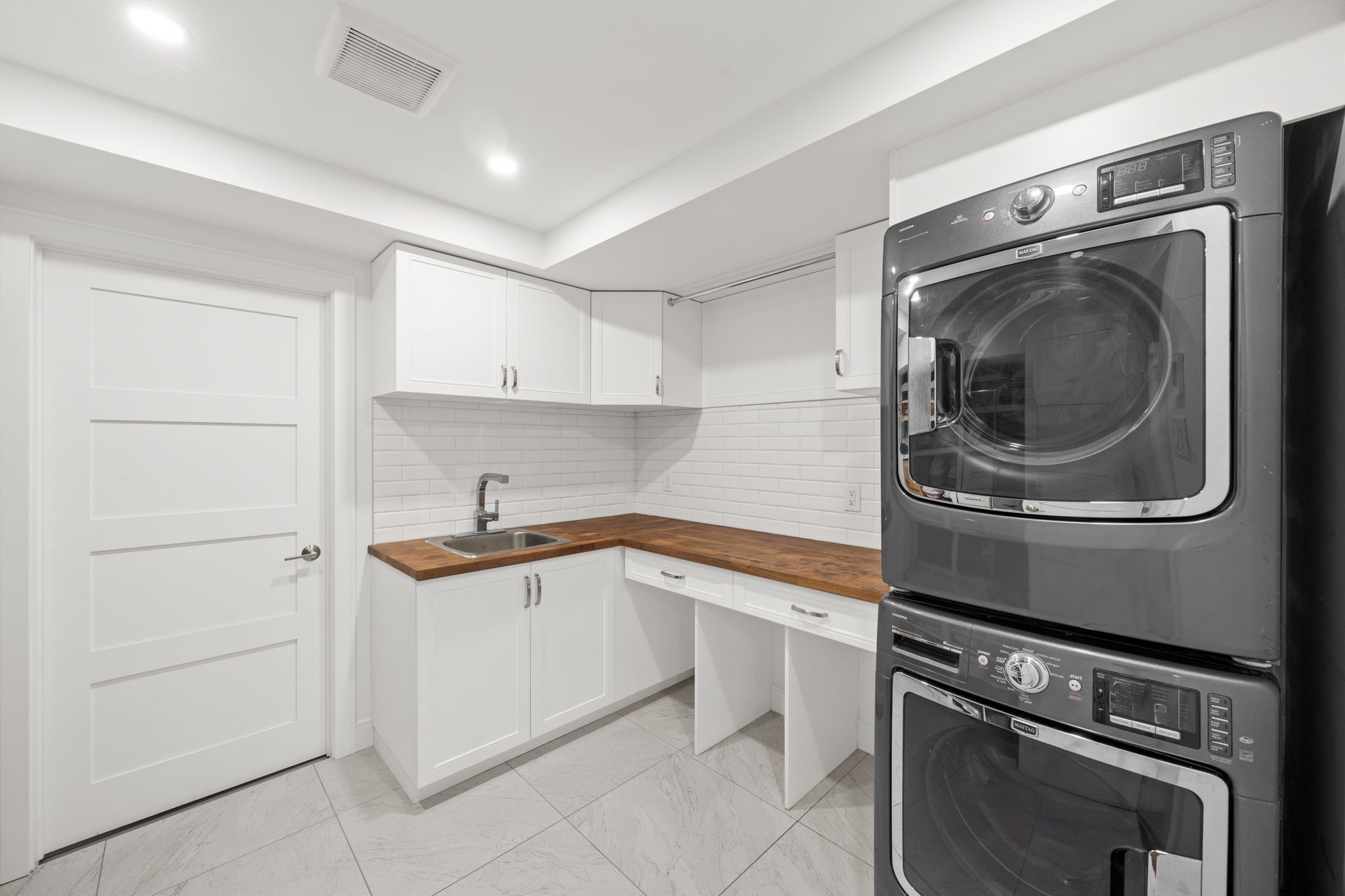 The spacious recreation room is ideal for movie nights, gatherings, and everyday relaxation. A stylish wet bar with cherry wood counters, beverage centre, shelving, and cabinetry is fully plumbed for future kitchenette potential, offering flexibility for entertaining or multi-generational living.