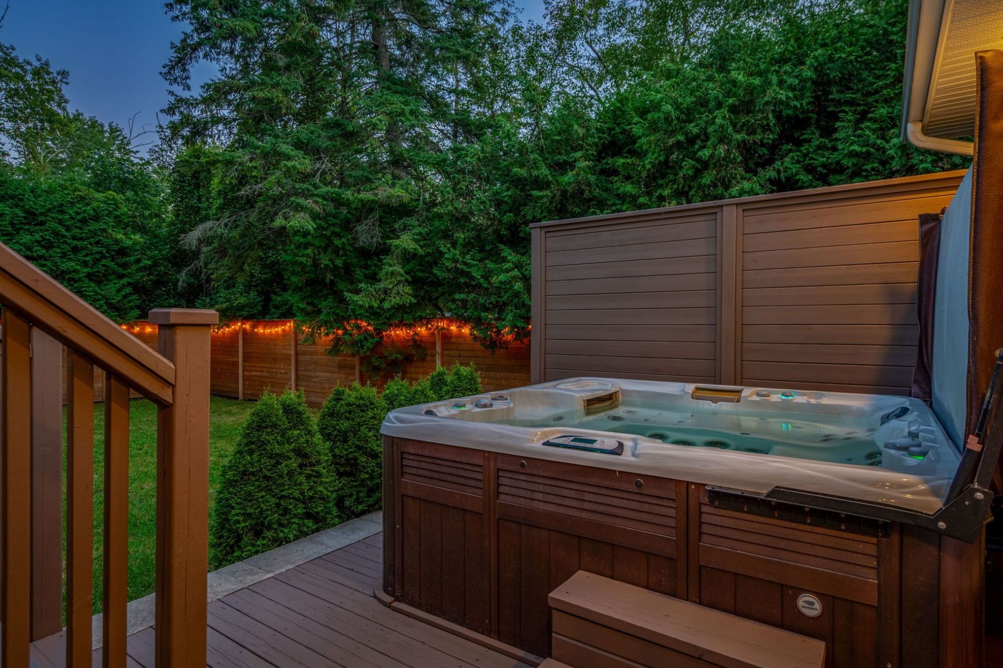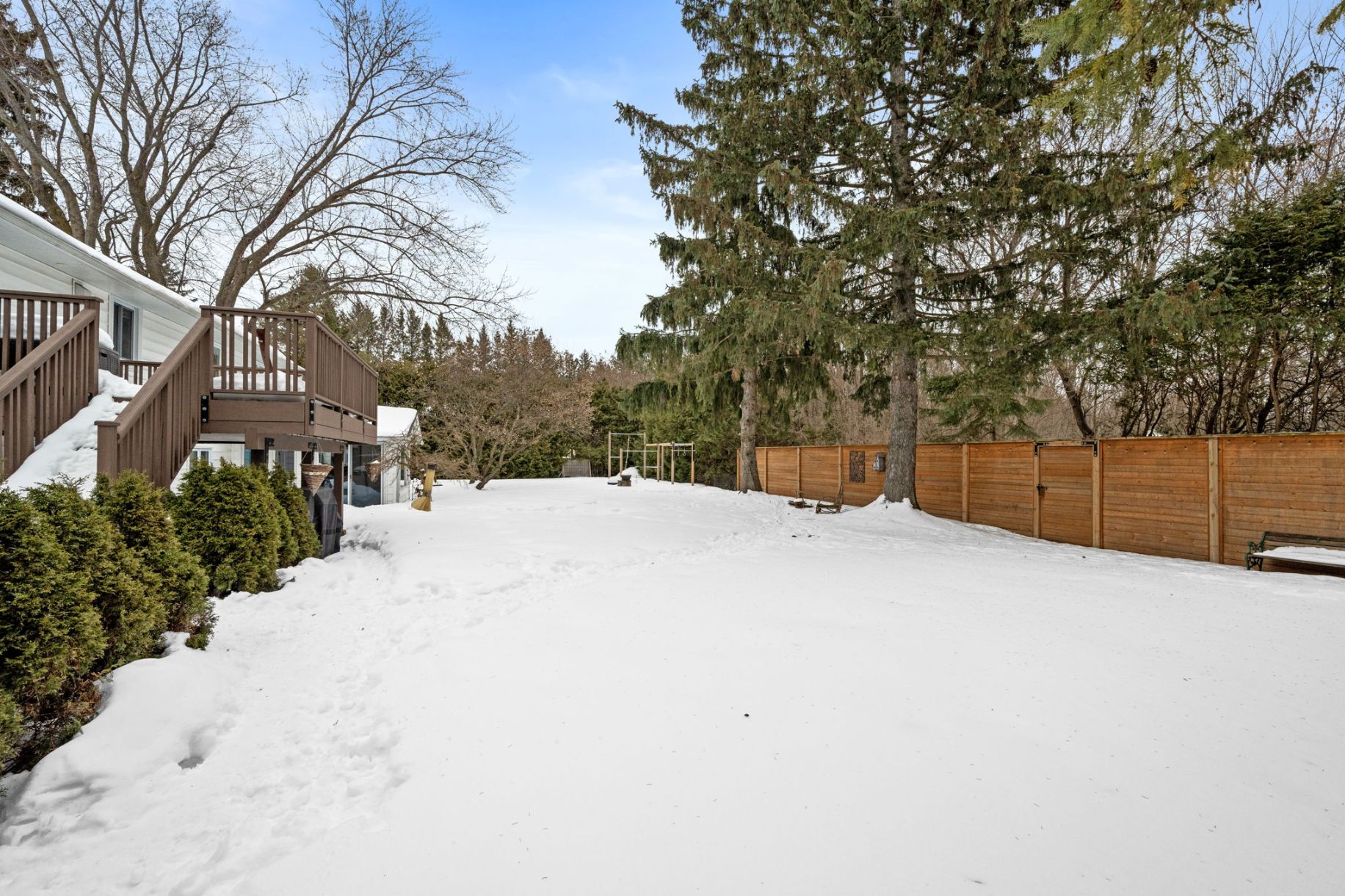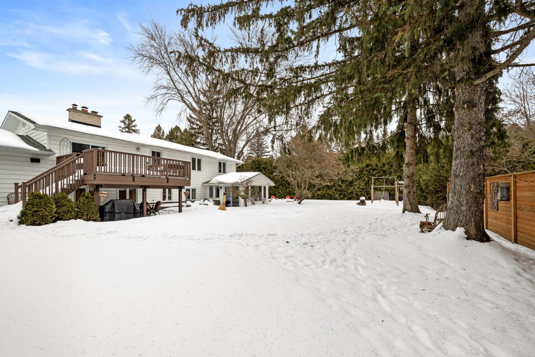 The south facing fully-fenced private backyard is framed by mature trees and cedar hedges, creating exceptional privacy, bathed in sunshine. Designed for both relaxation and play, the outdoor space features a two-tiered deck, hot tub, fire pit, parkour play structure, and expansive green space. Whether hosting summer gatherings or enjoying quiet evenings under the stars, this backyard truly elevates everyday living! A secondary driveway is also located on the far side of the property for added convenience.