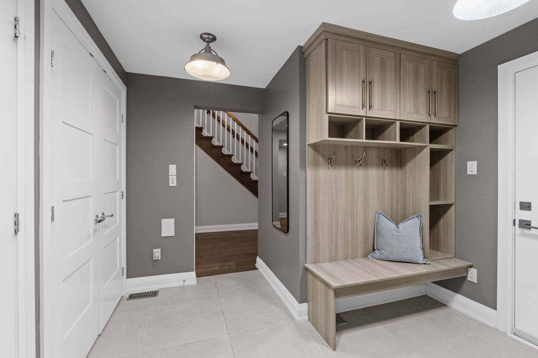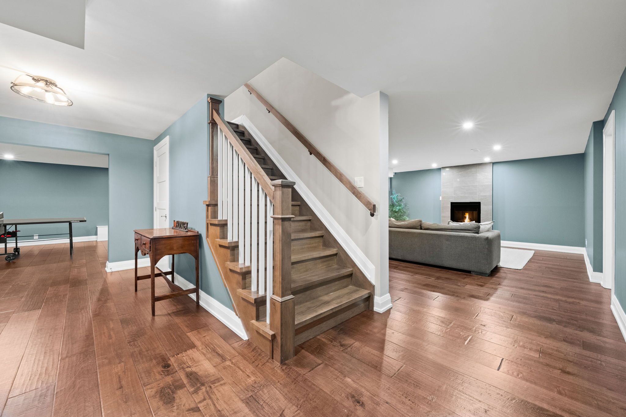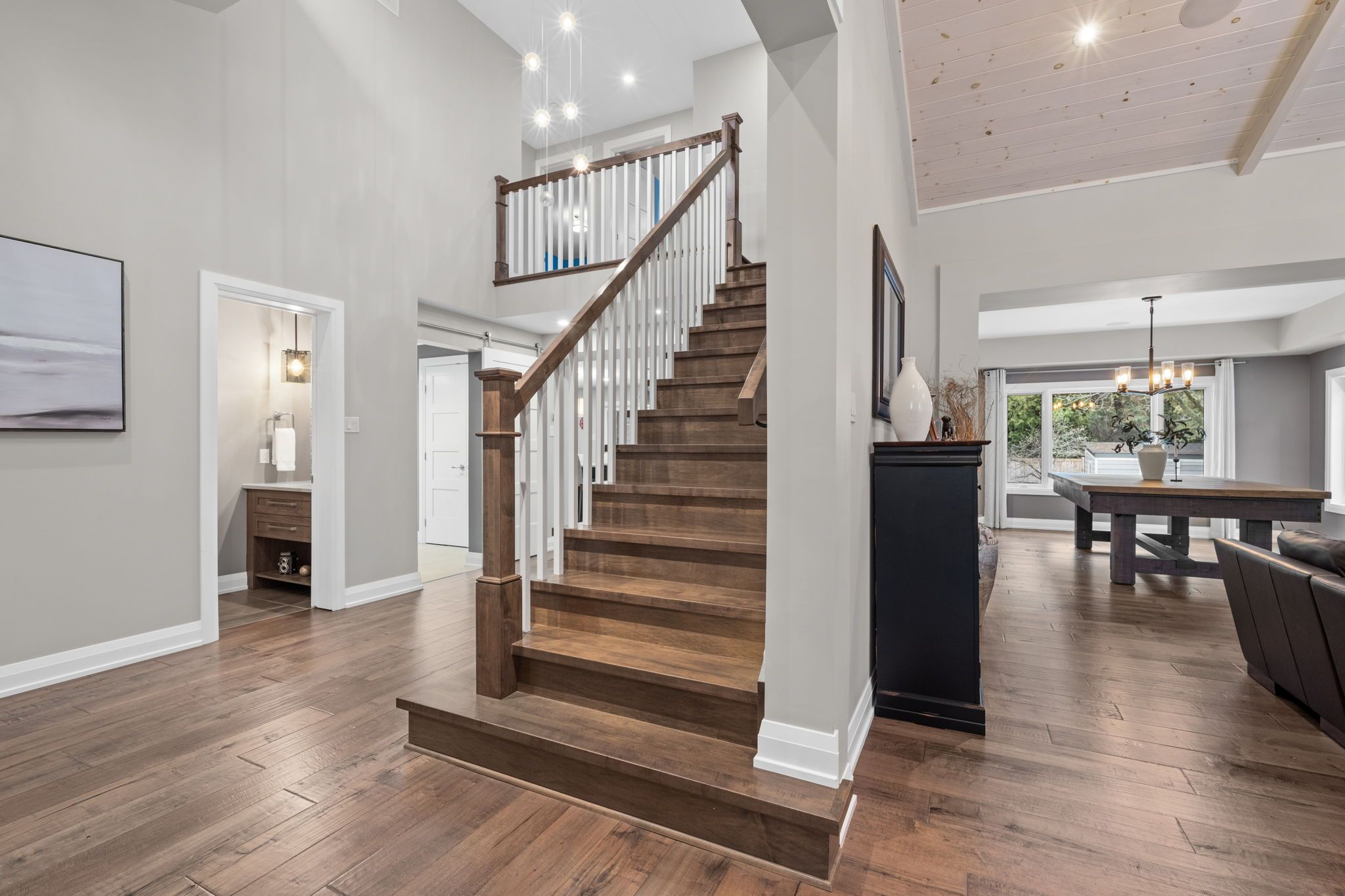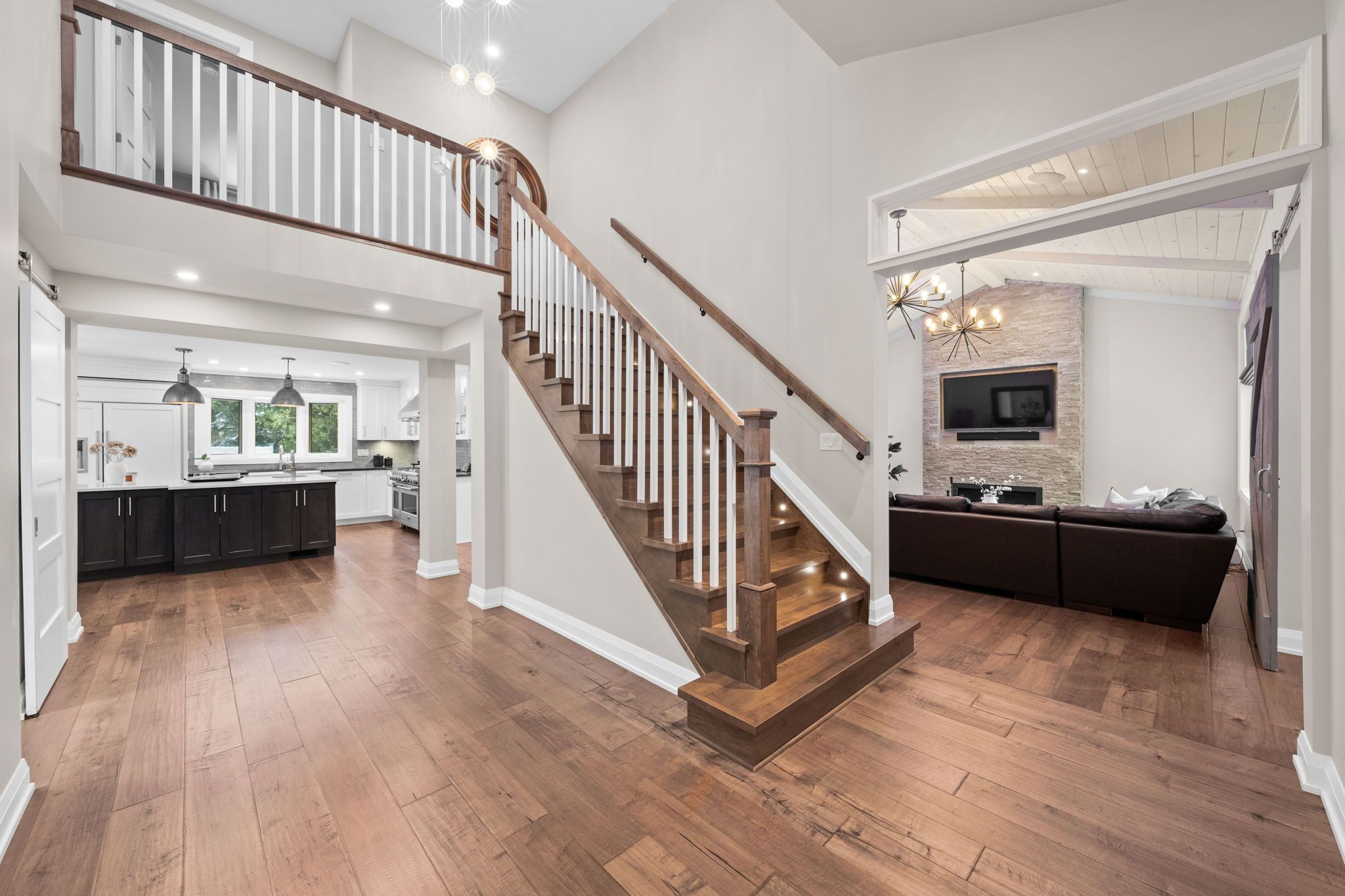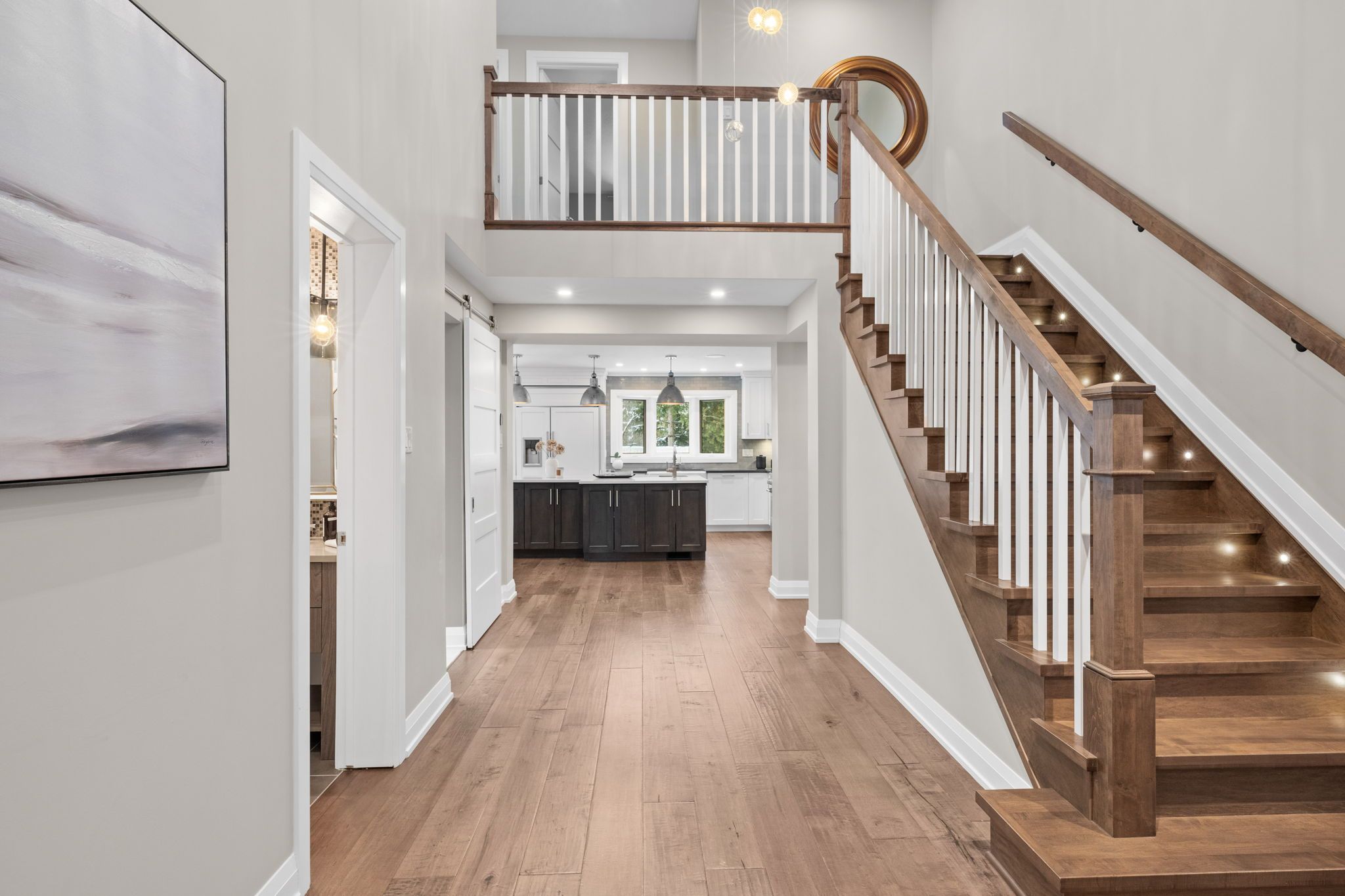 A grand foyer sets the tone with herringbone tile flooring, refined ceiling detail, rich engineered hardwood floors, and an illuminated statement staircase that immediately reflects the home’s craftsmanship and scale.