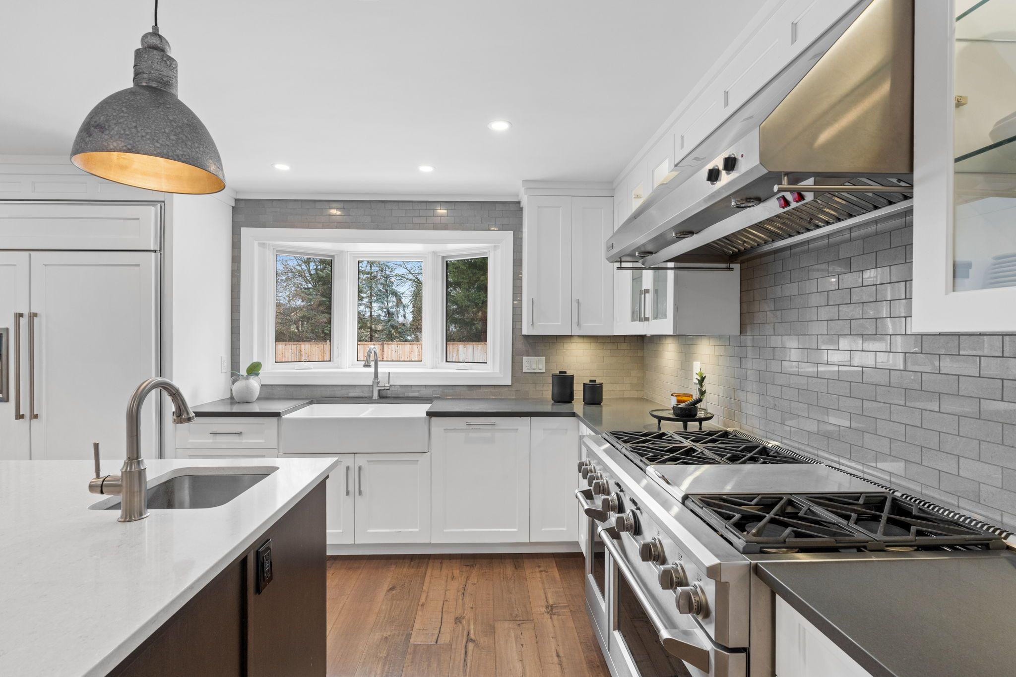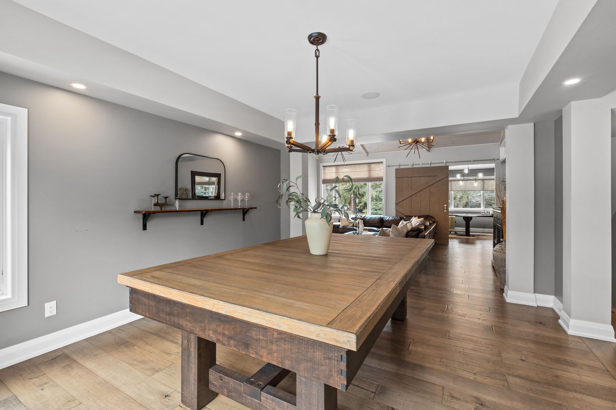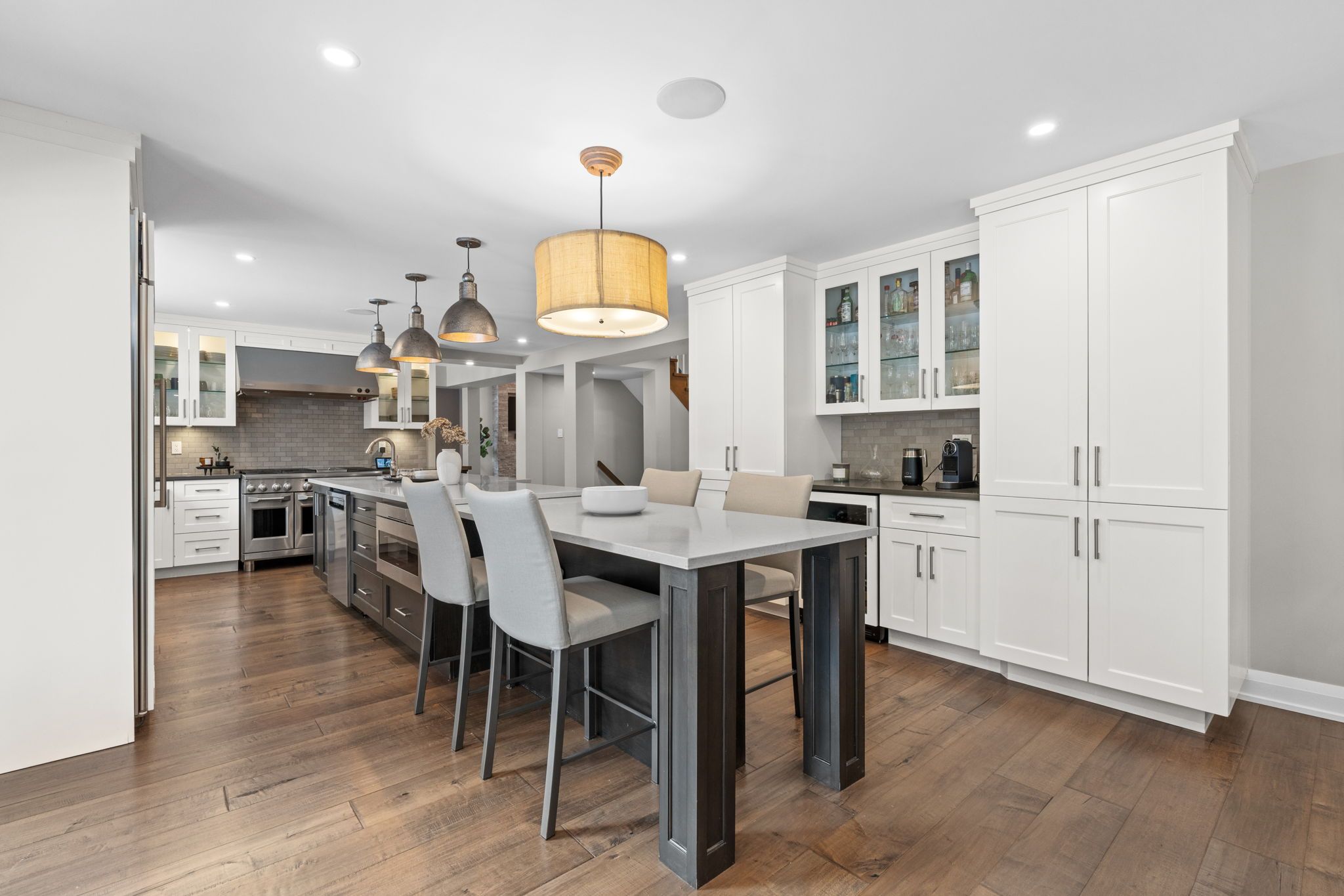 The chef’s kitchen blends beauty and function with quartz counters, stainless steel appliances, a Monogram six-burner gas cooktop with BBQ grill and double electric oven, Monogram built-in fridge with ice maker and water filtration system, farmhouse sink, Kitchen Aid streak-free dishwasher, and a Monogram drink/wine fridge. Ample cabinetry, pantry storage, a large island, and a breakfast bar make this a standout space. The adjacent formal dining room is ideal for gatherings both large and small.