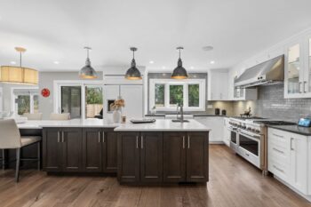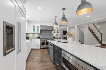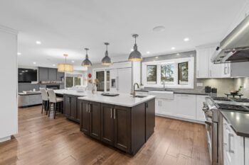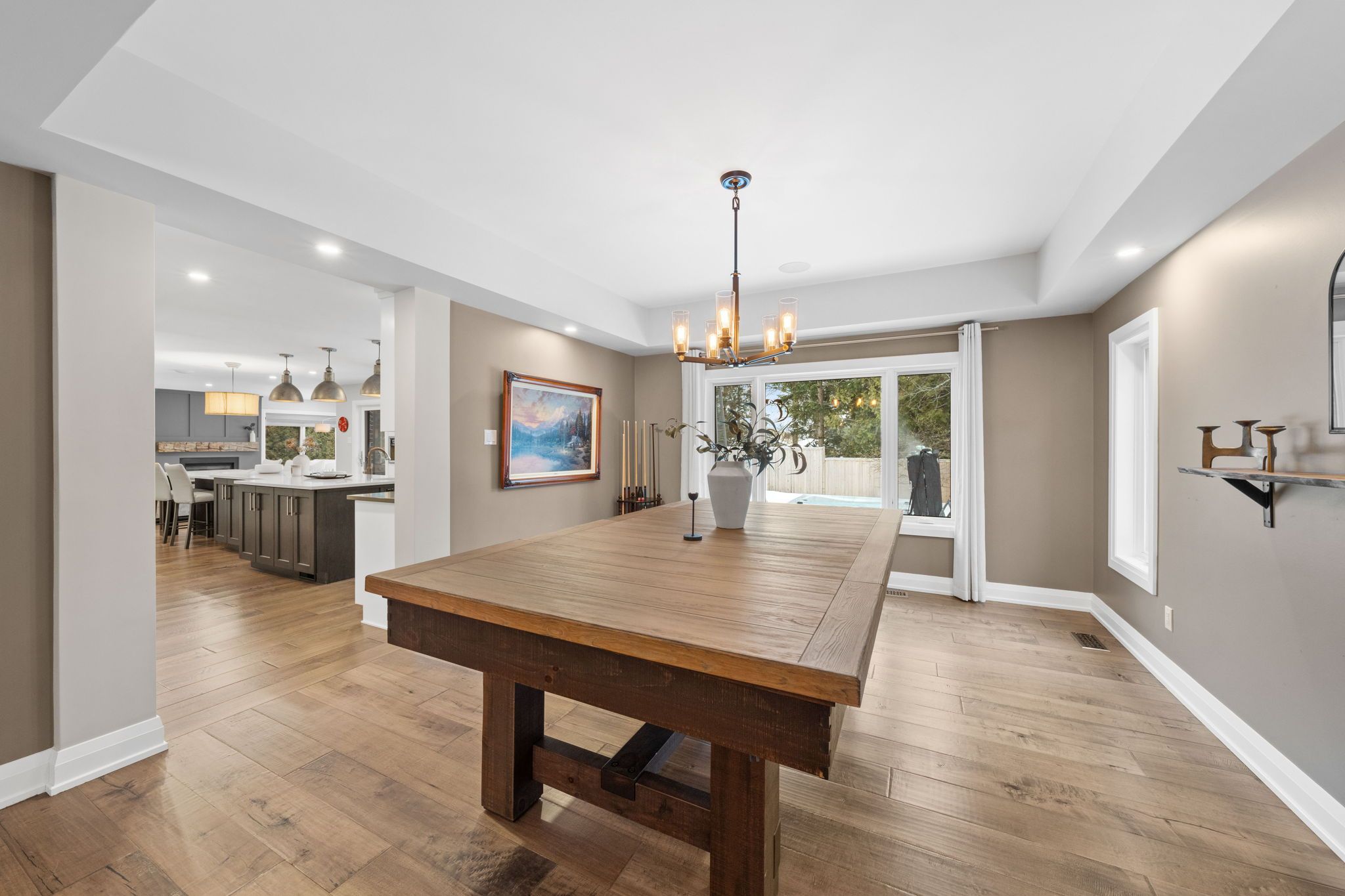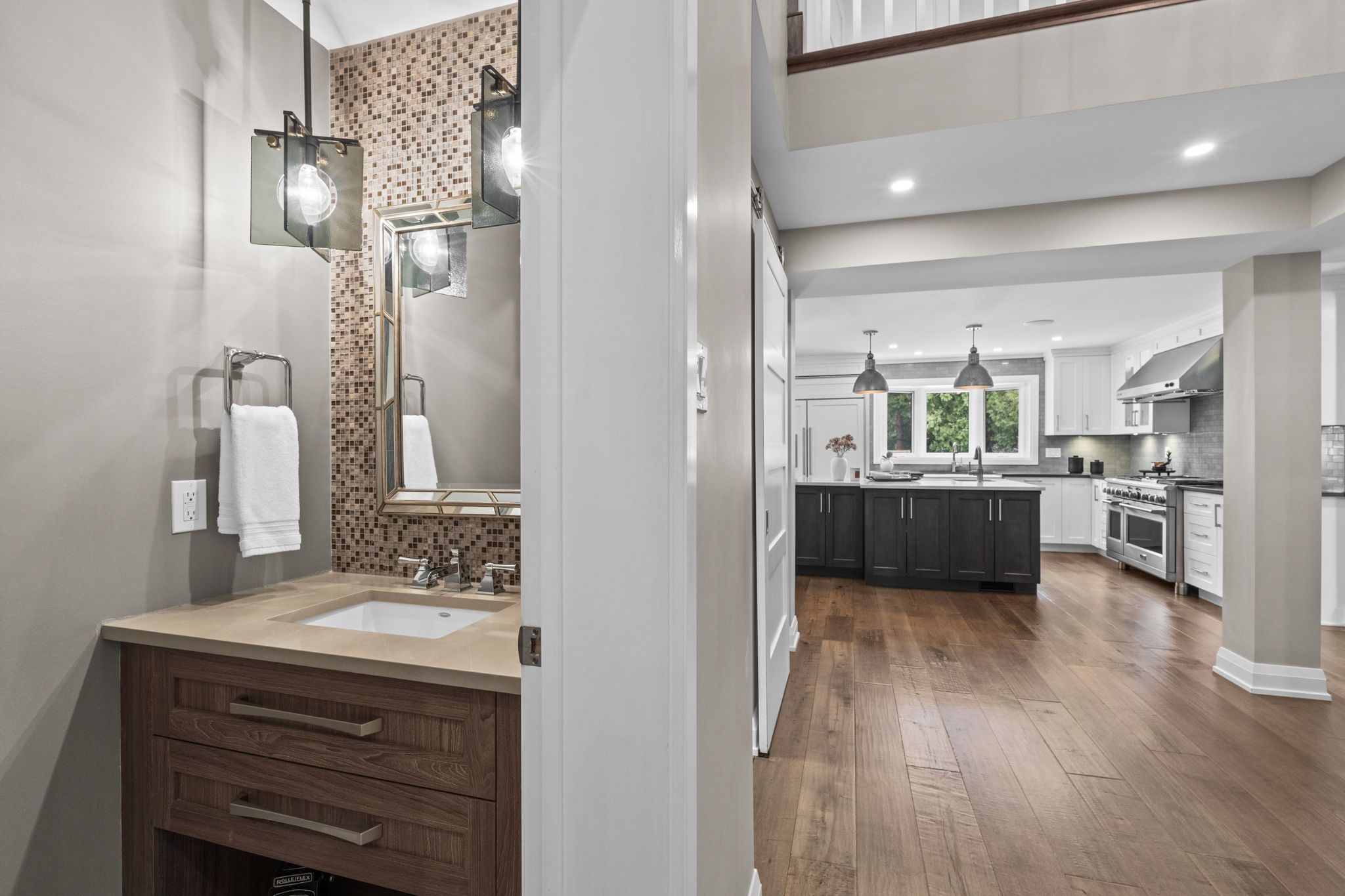 The chef’s kitchen blends beauty and function with quartz counters, stainless steel appliances, a Monogram six-burner gas cooktop with BBQ grill and double electric oven, Monogram built-in fridge with ice maker and water filtration system, farmhouse sink, Kitchen Aid streak-free dishwasher, and a Monogram drink/wine fridge. Ample cabinetry, pantry storage, a large island, and a breakfast bar make this a standout space. The adjacent formal dining room is ideal for gatherings both large and small.
