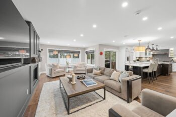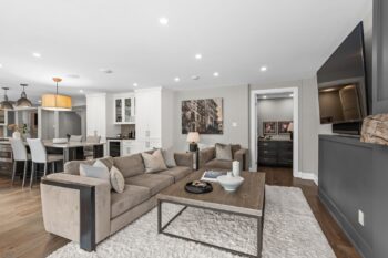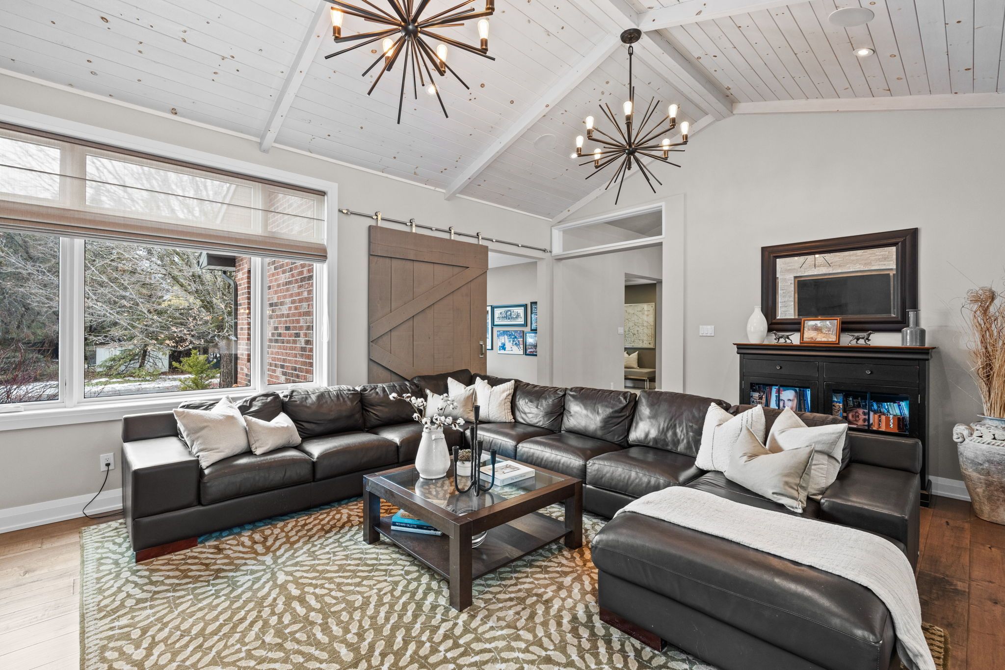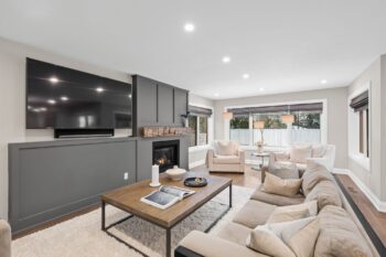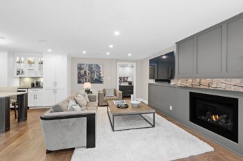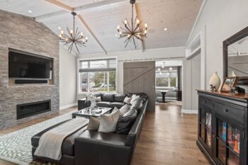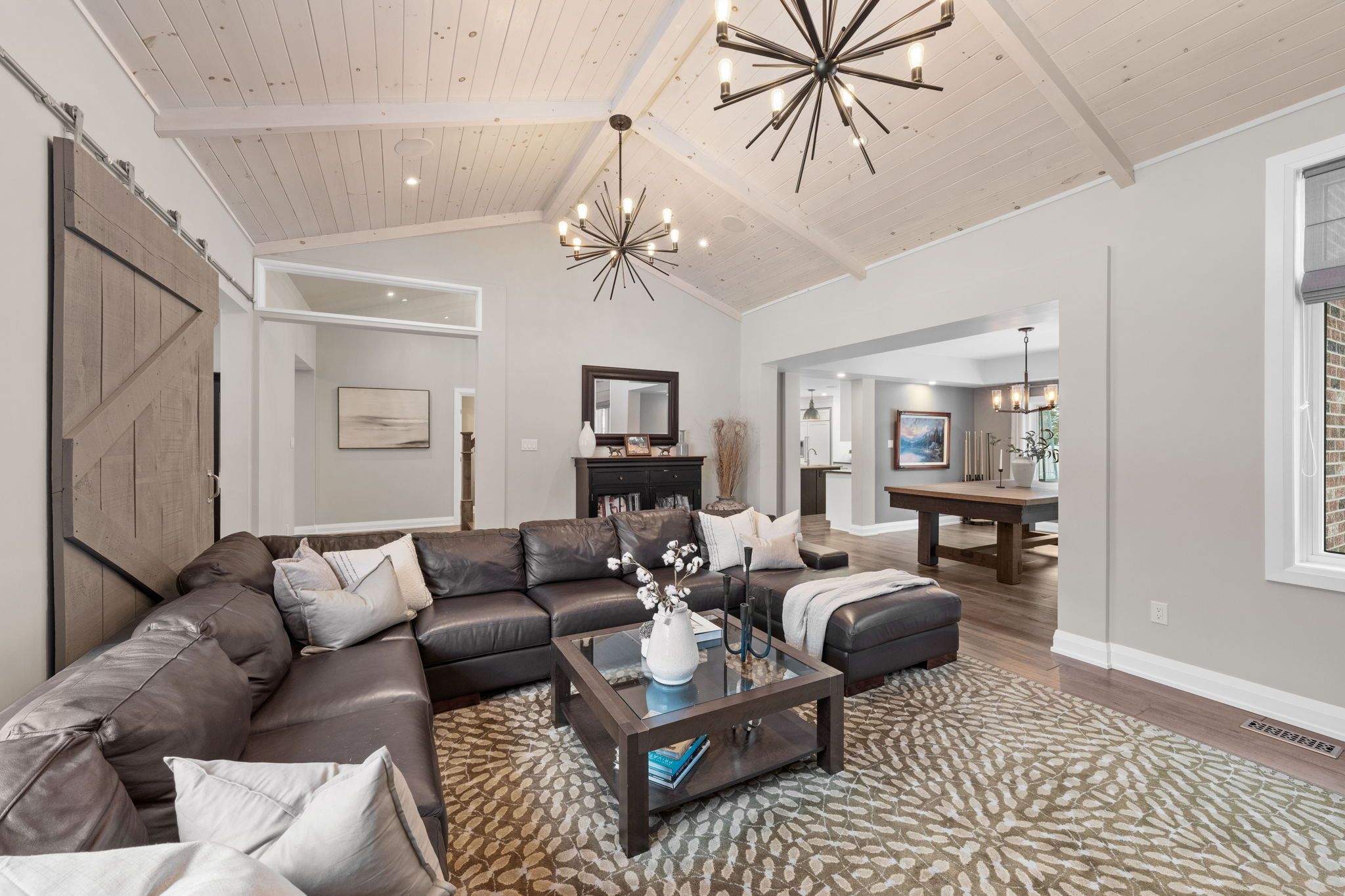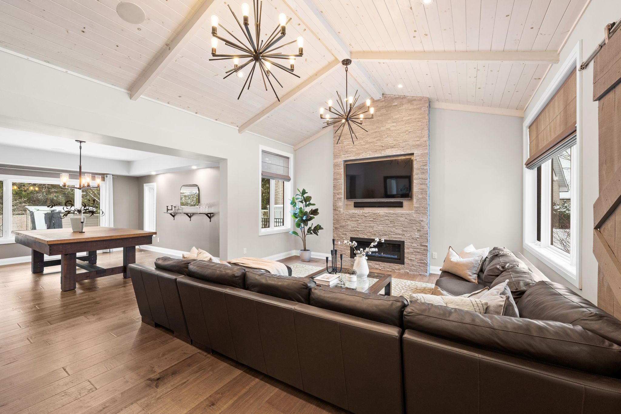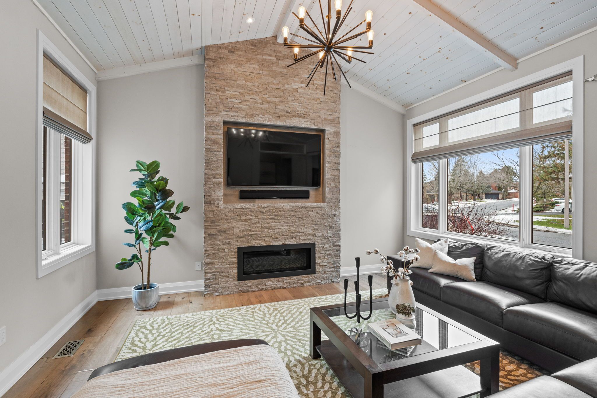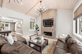 Filled with natural light and backyard views, the family room is centred around a gas fireplace framed by custom millwork and wood beam detailing. The dramatic living room offers soaring vaulted ceilings, statement chandeliers, and floor-to-ceiling stone surrounding the gas fireplace and television, creating a striking focal point.