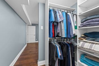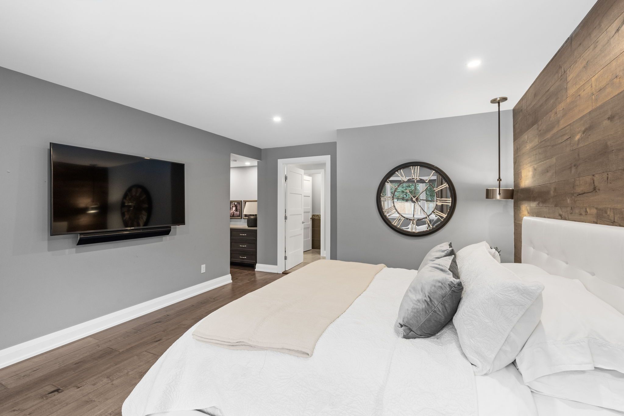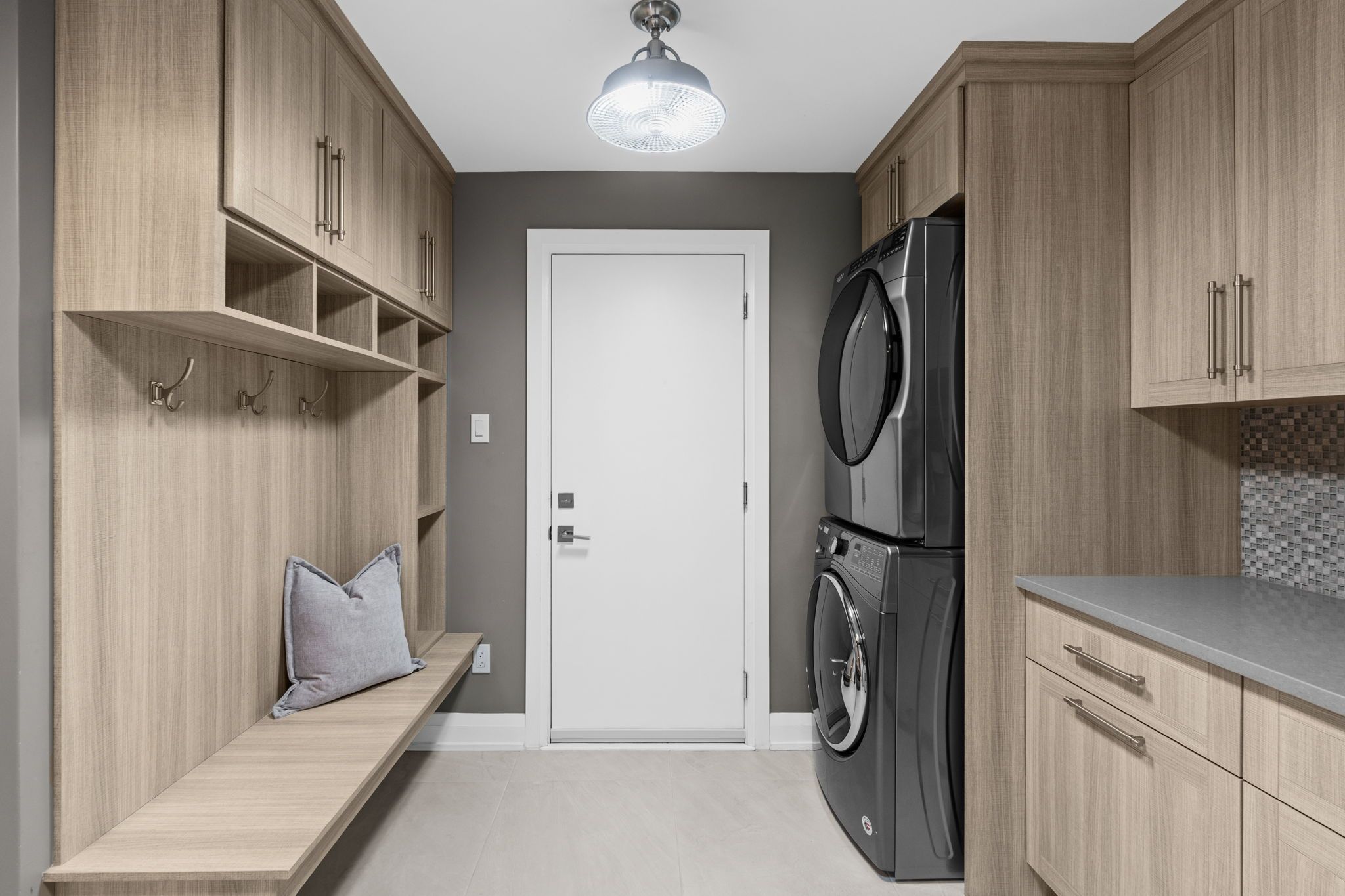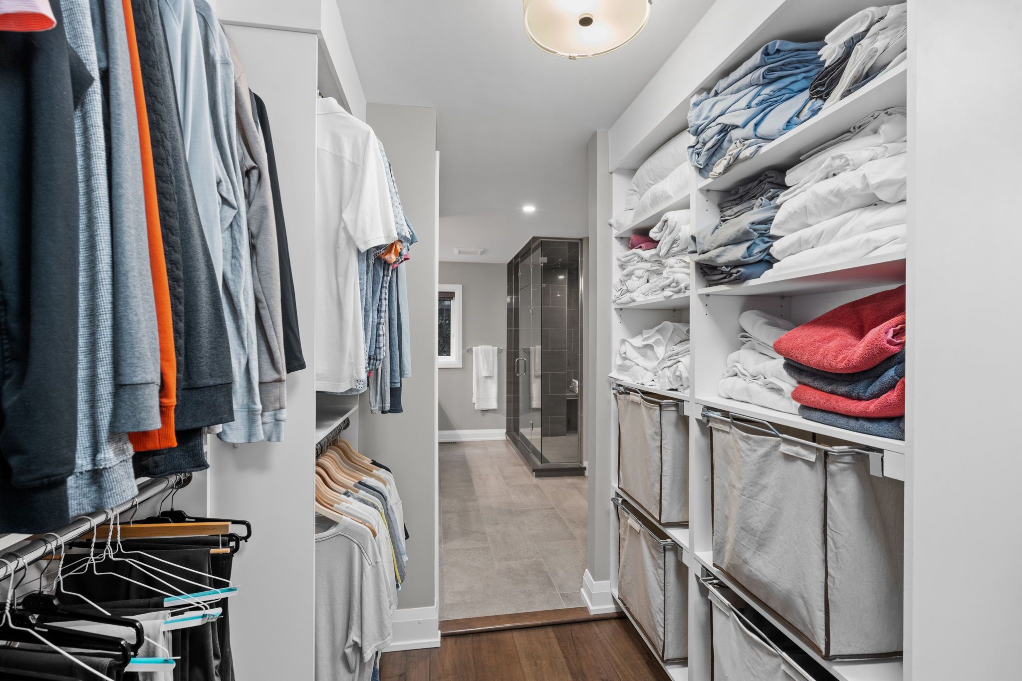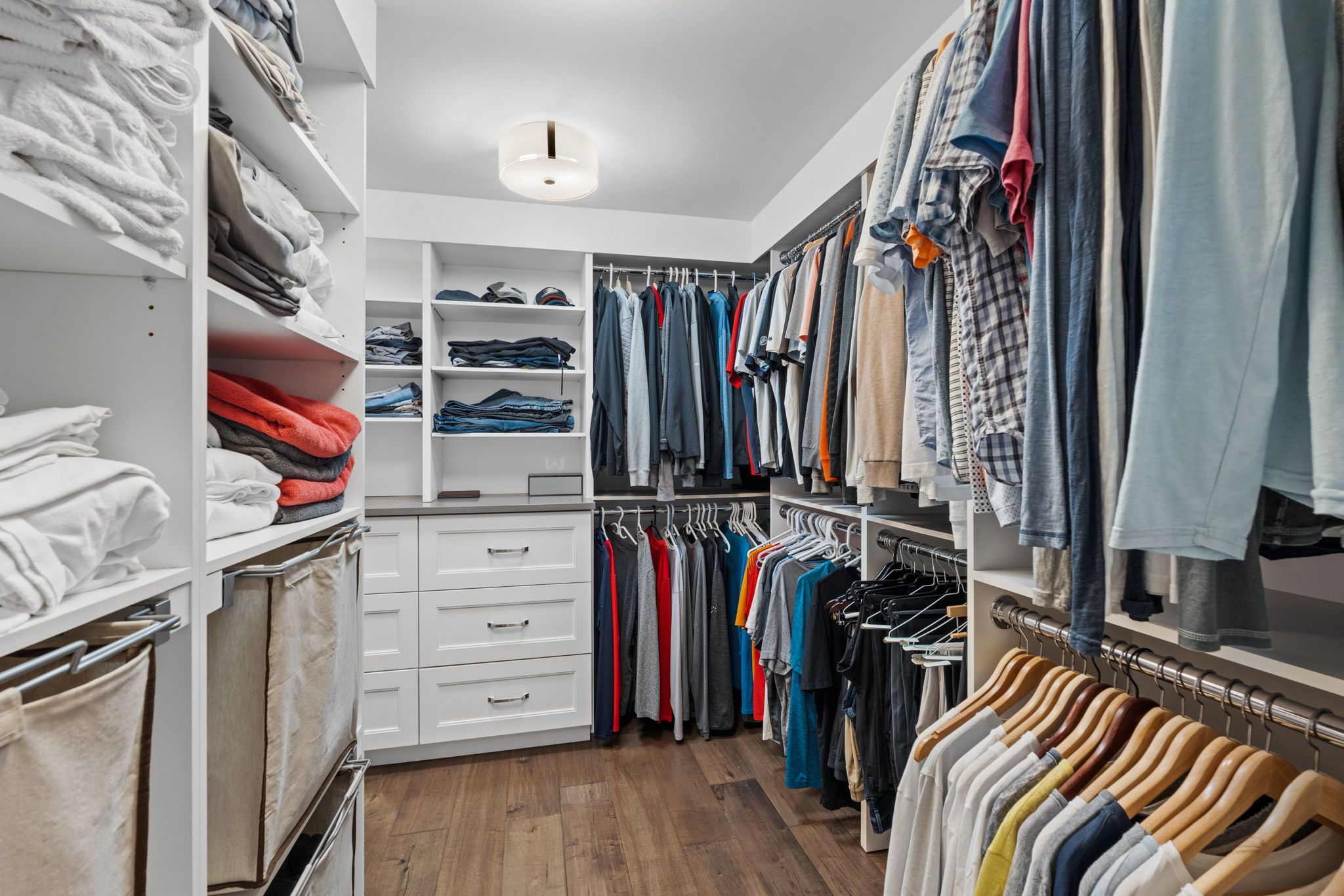 Located on the main level, the primary suite is a serene retreat accented by decorative wood paneling, elegant pendant lighting and a built-in dresser with quartz countertop. The spacious custom walk-in closet features built-in organizers, integrated laundry hampers, and a quartz countertop dresser, providing both convenience and luxury.