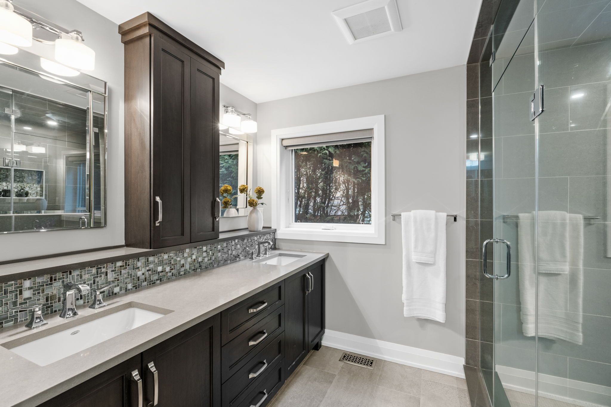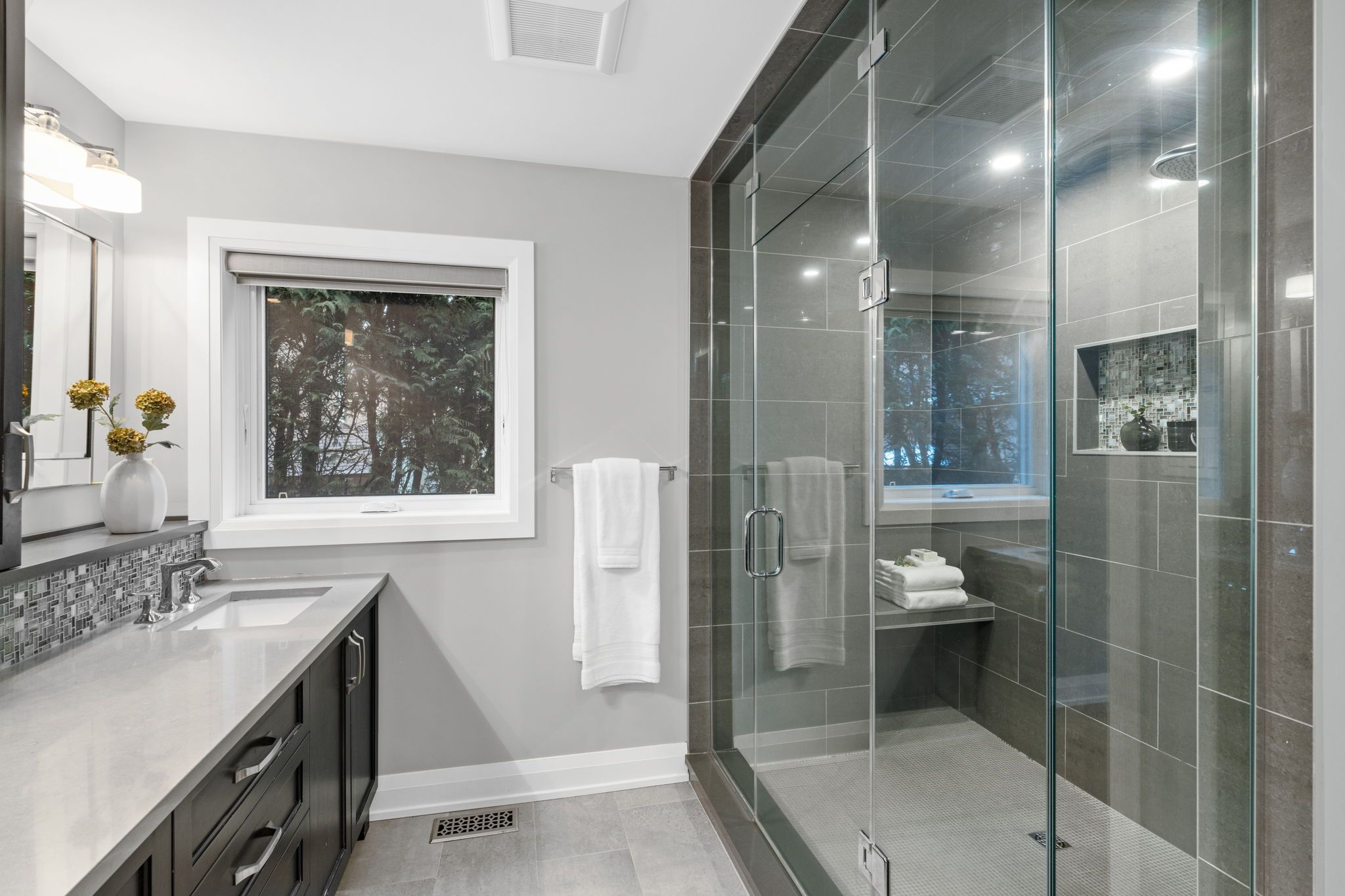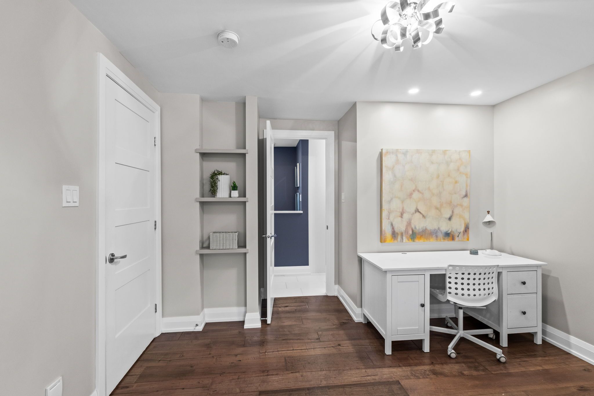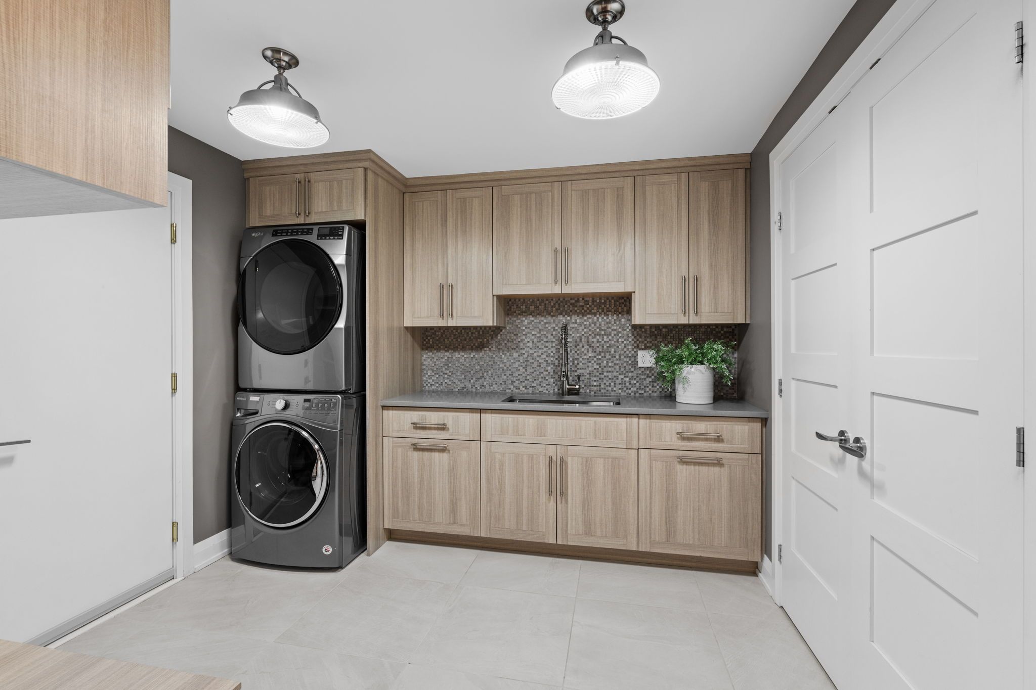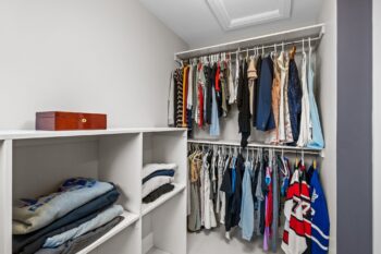 Located on the main level, the primary suite is a serene retreat accented by decorative wood paneling, elegant pendant lighting and a built-in dresser with quartz countertop. The spacious custom walk-in closet features built-in organizers, integrated laundry hampers, and a quartz countertop dresser, providing both convenience and luxury.
