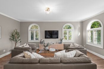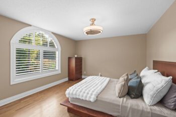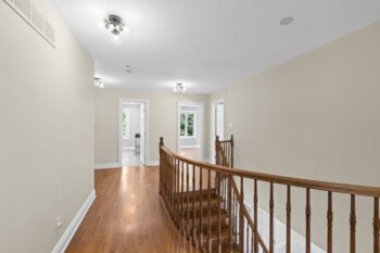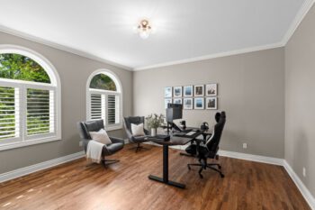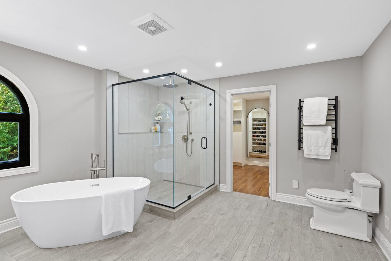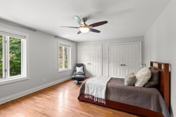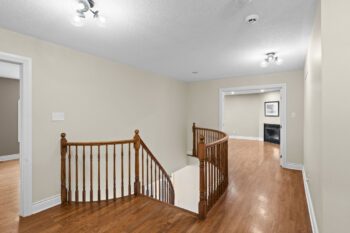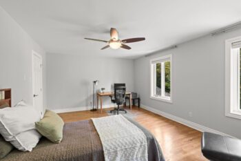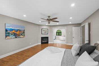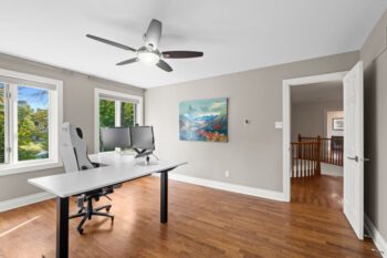 Upstairs, hardwood flooring runs throughout. The primary suite offers a cozy gas fireplace, a custom walk-in closet (Deslaurier, 2023), and a spa-inspired ensuite with heated floors, heated towel rack, soaker tub, and dual vanities. Three additional bedrooms share an updated main bath (2018) featuring custom finishes, heated floors, and a heated towel rack — all designed for everyday comfort.