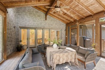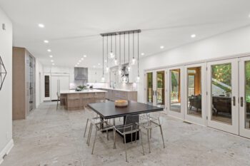 French doors open to the screened porch — a seamless extension of the kitchen and dining areas.