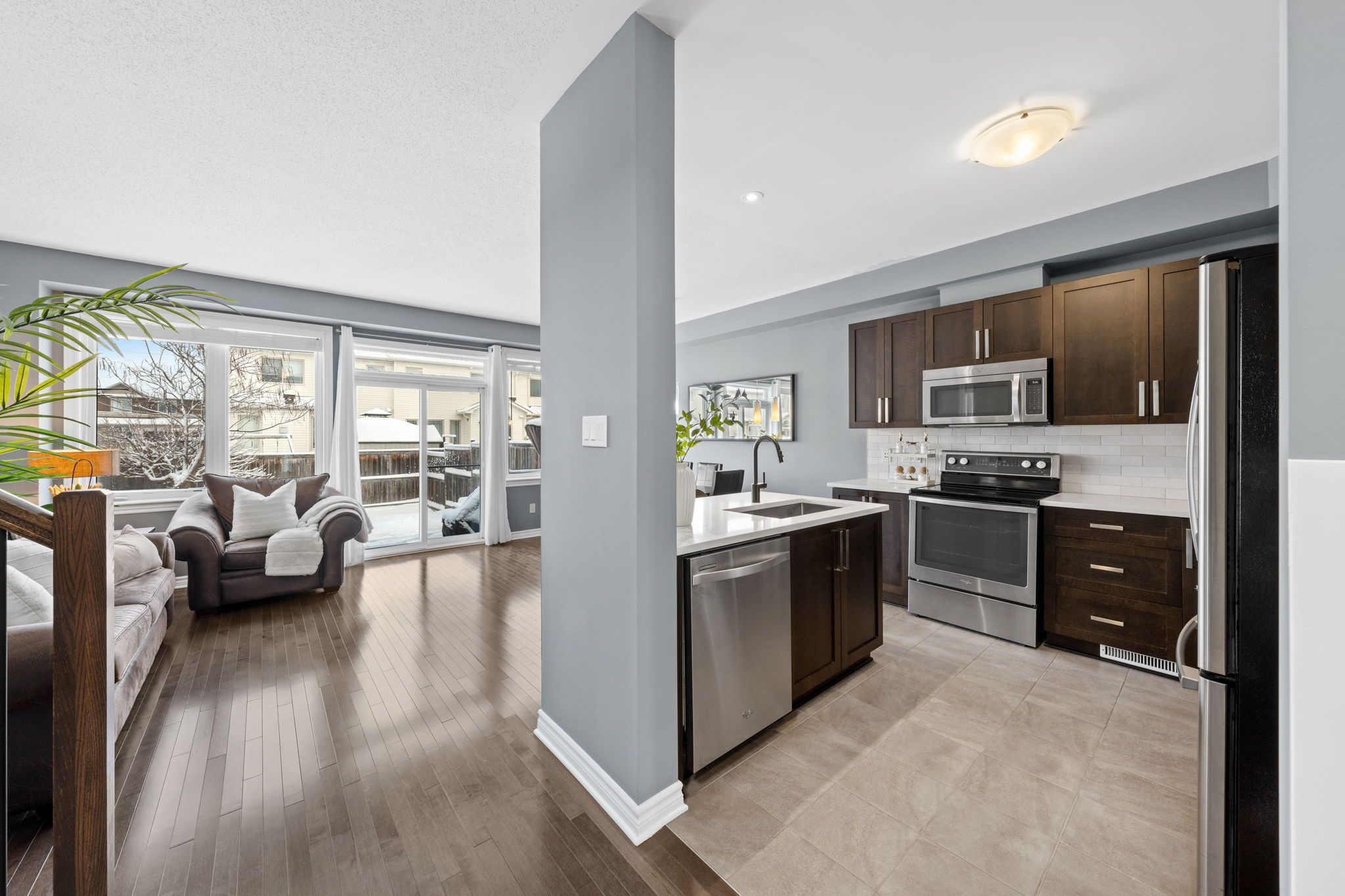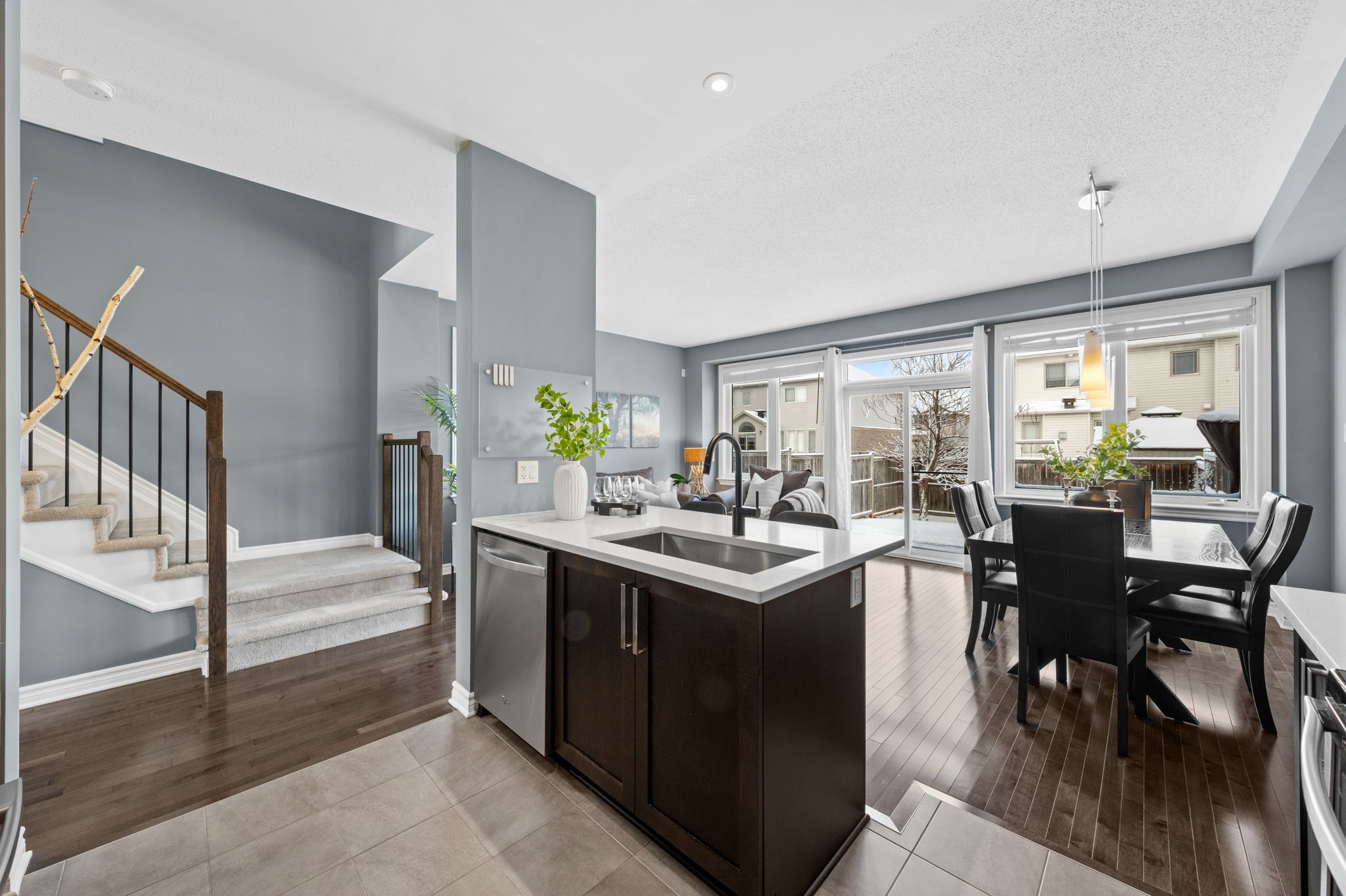 The kitchen features updated quartz countertops (2024), a deep sink with a black Moen faucet, stainless steel appliances, subway tile backsplash, ample cabinetry, and a functional island with seating for three. The layout seamlessly connects to the bright dining area and living room, highlighted by large windows and sliding door access to the backyard.