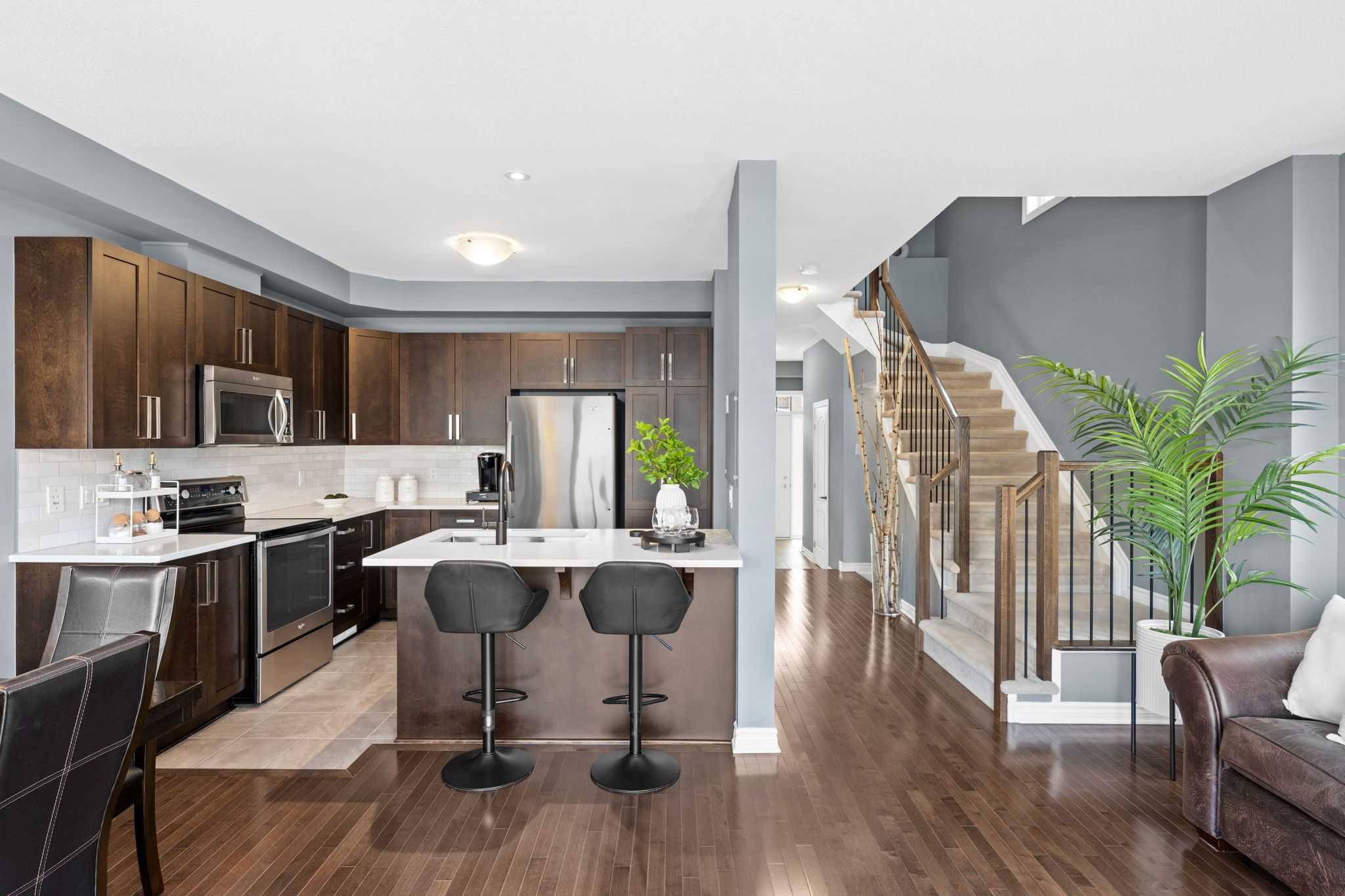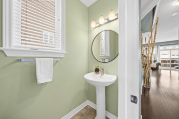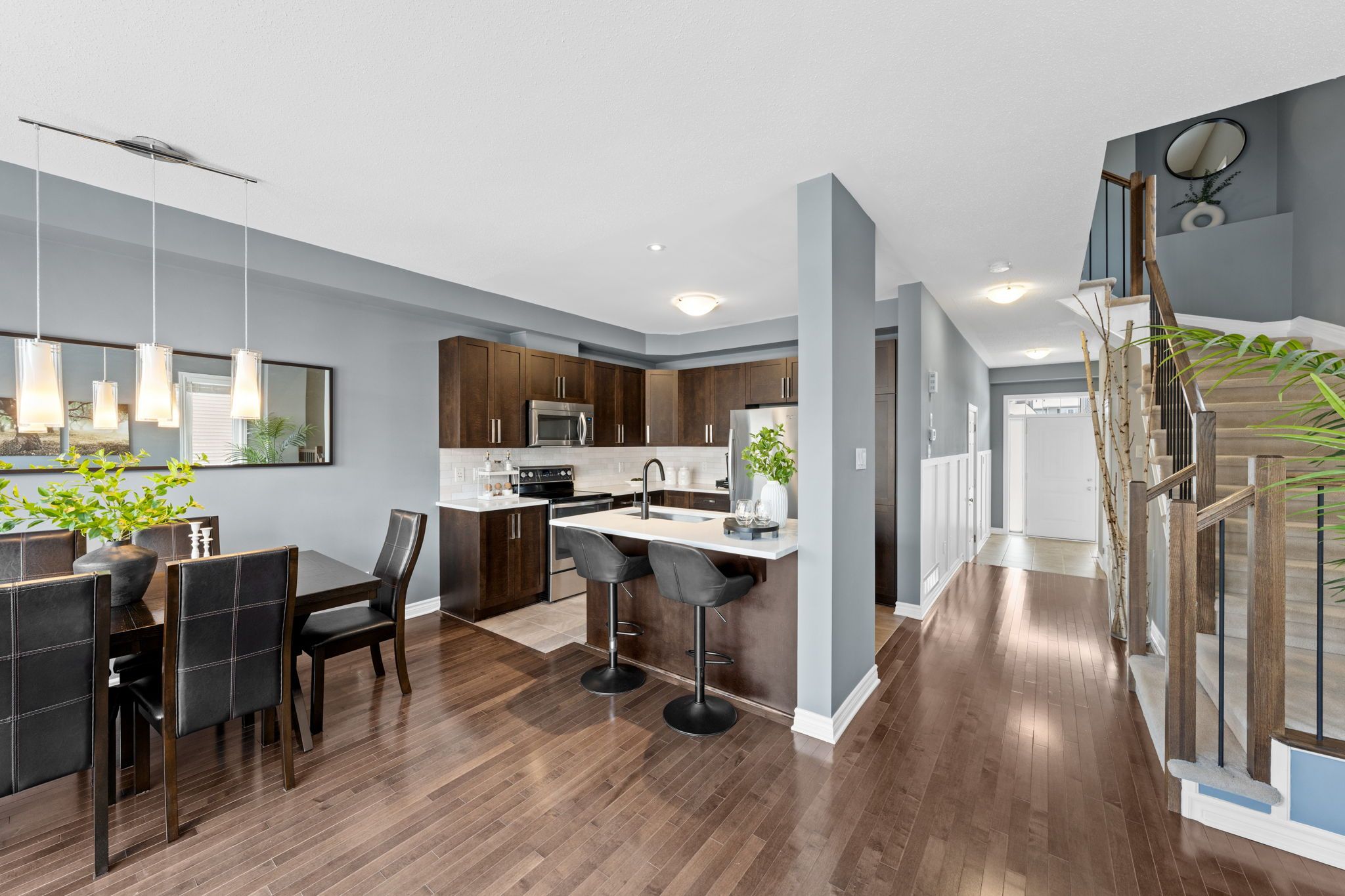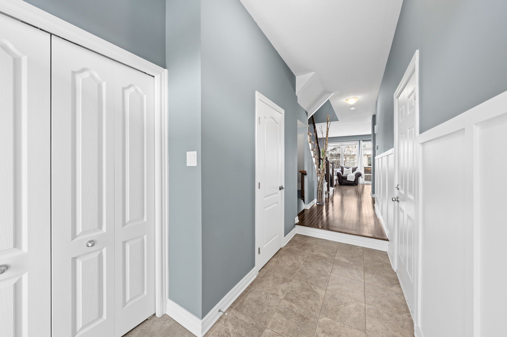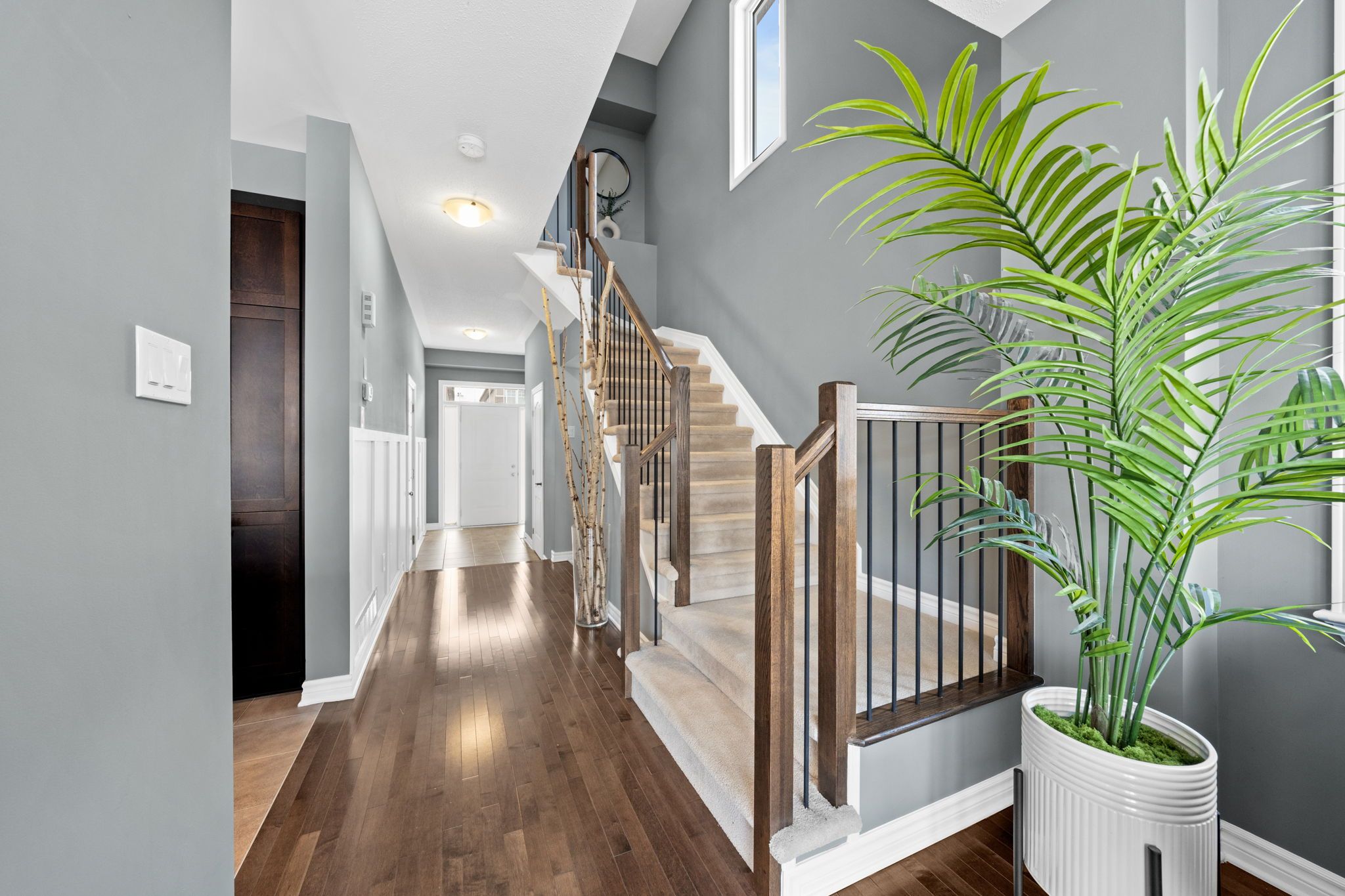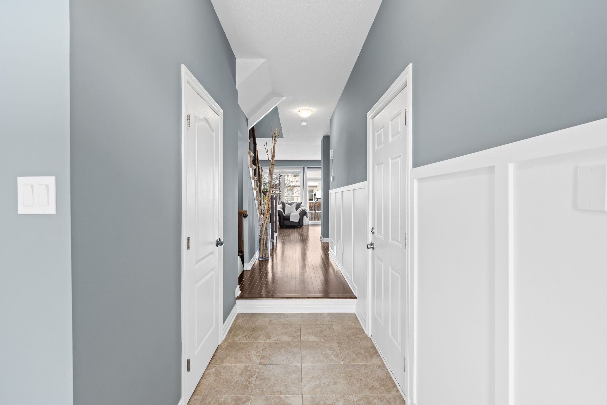 Step inside to a welcoming tiled foyer with a high ceiling and board and batten detail, creating an inviting first impression. A convenient powder room is located off the entrance before transitioning into the open-concept main living space. Hardwood floors flow throughout, offering a warm and cohesive feel, perfect for both everyday living and entertaining.