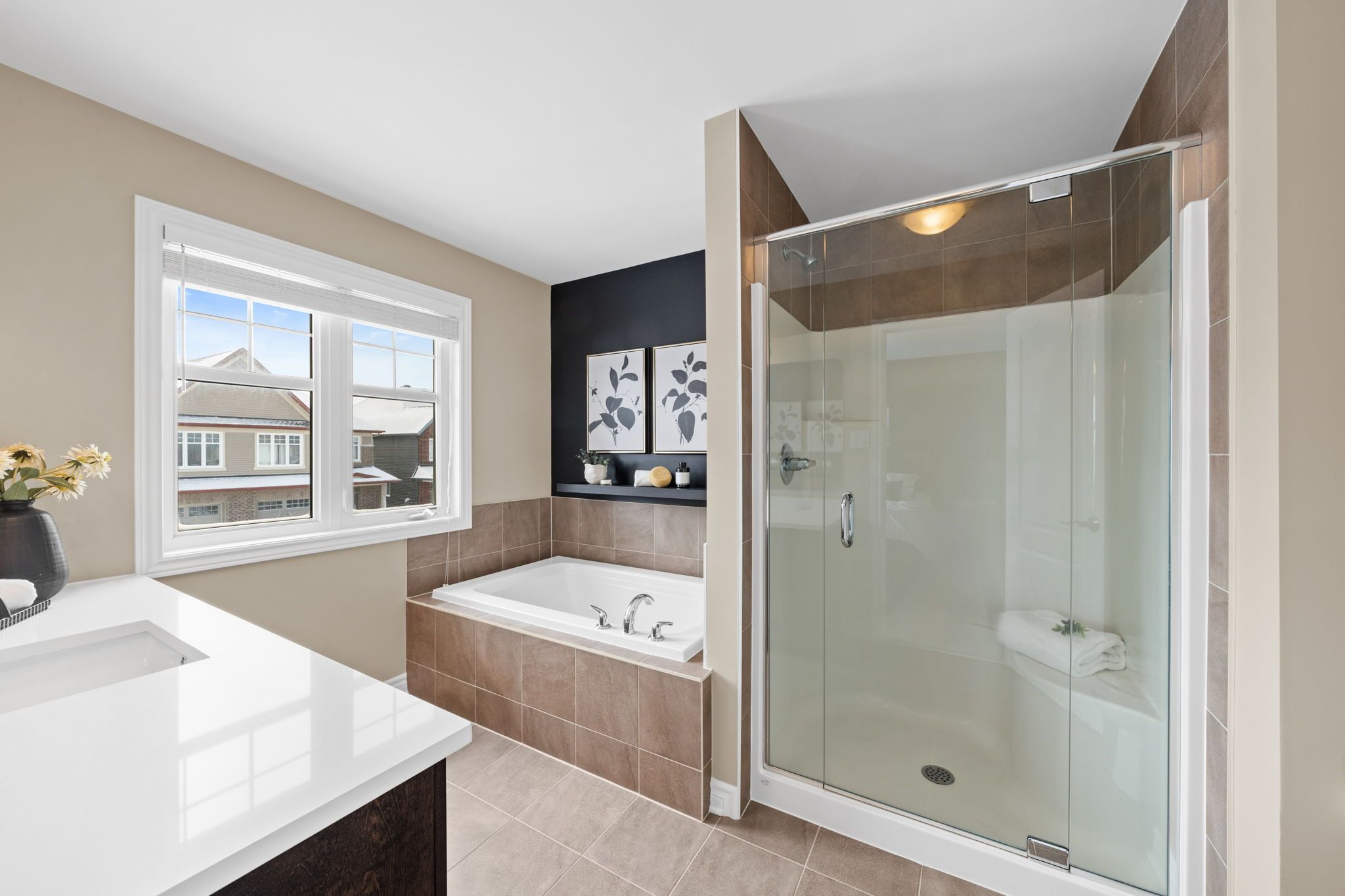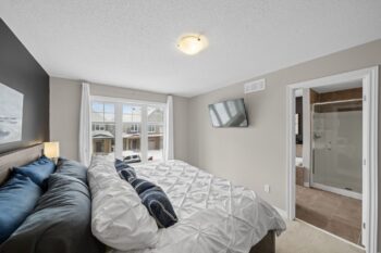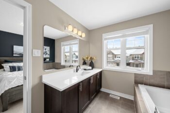 Upstairs, the spacious primary bedroom offers a large walk-in closet and a spa-inspired ensuite complete with an oversized glass shower with built-in seating, a relaxing soaker tub, and an updated quartz countertop with a Moen faucet.