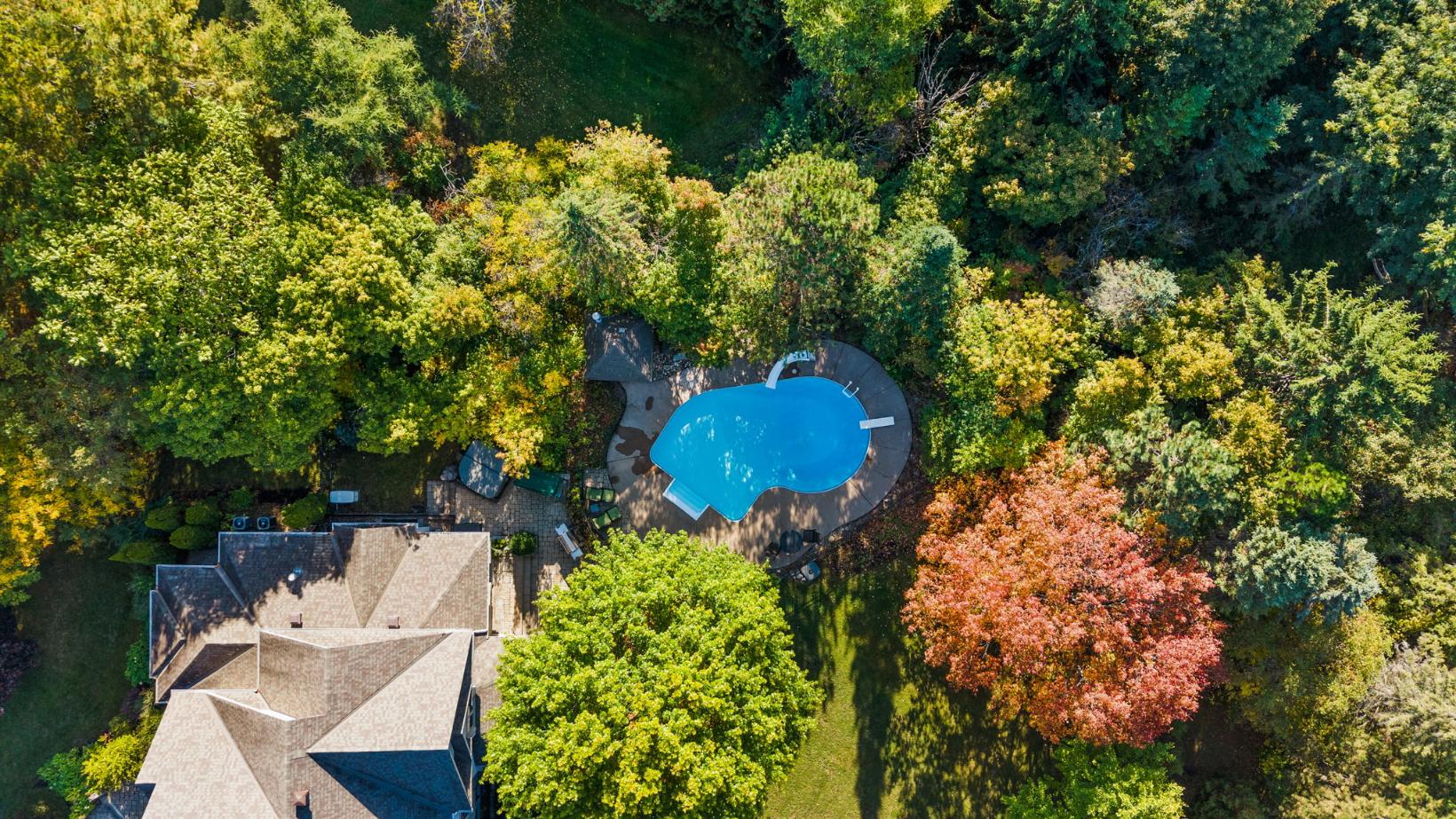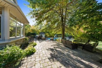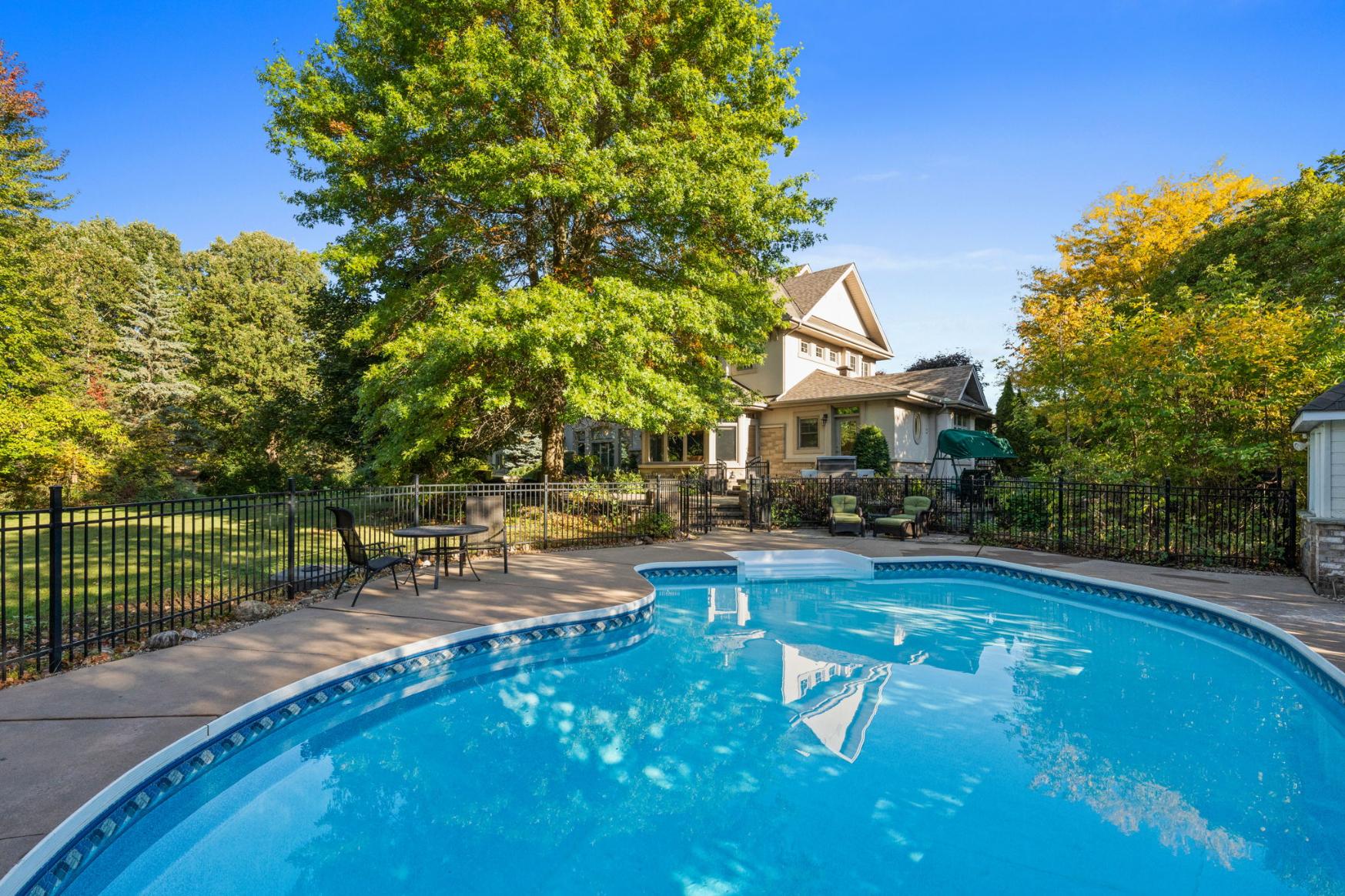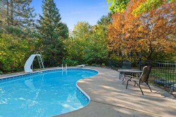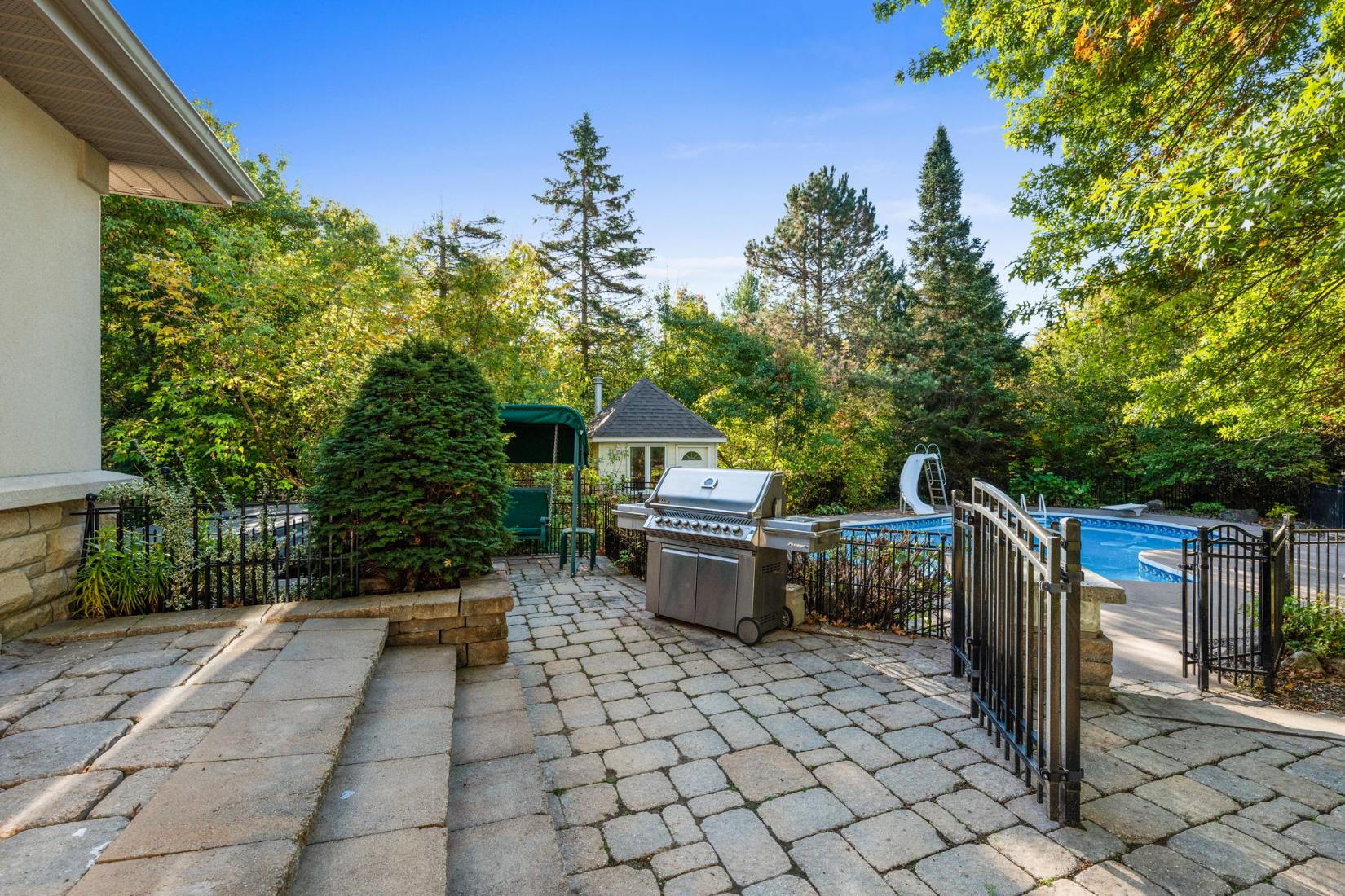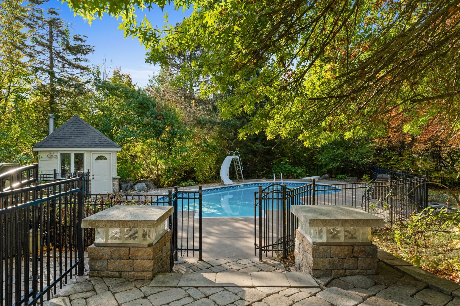 The property’s outdoor living spaces create a true backyard oasis. The heated saltwater pool serves as the focal point, complete with a slide, diving board, pool shed, and custom cover for year-round protection. Stone patios and walkways offer multiple areas for lounging and entertaining, while a hot tub, mature trees, and lush landscaping enhance the serene, resort-style atmosphere.