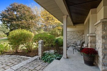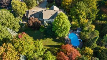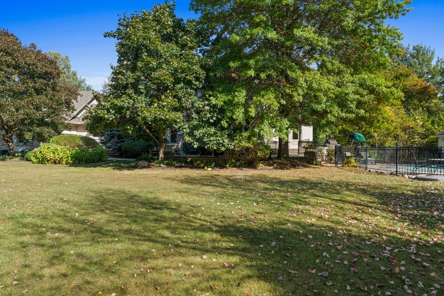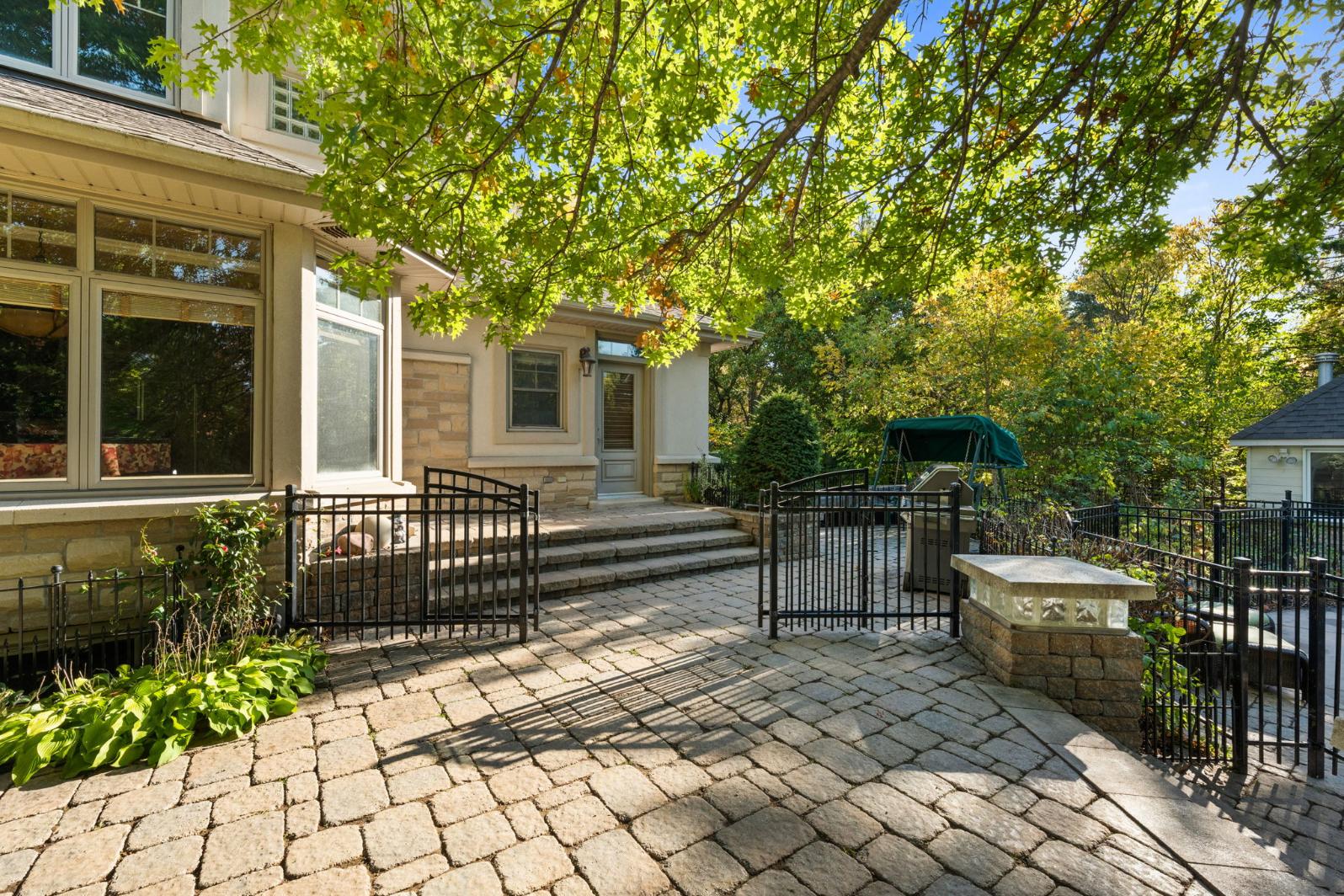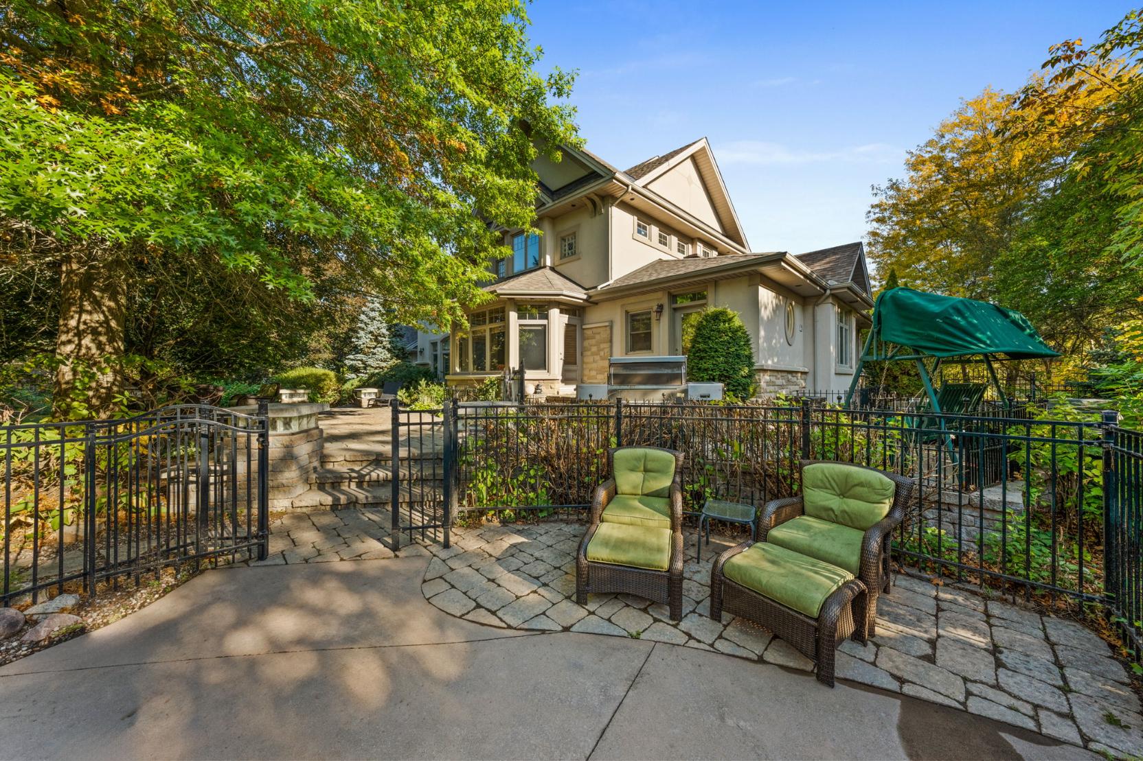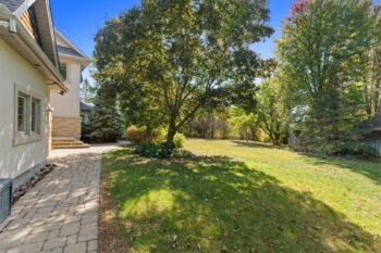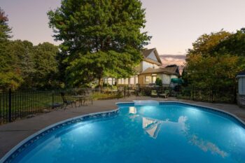 The property’s outdoor living spaces create a true backyard oasis. The heated saltwater pool serves as the focal point, complete with a slide, diving board, pool shed, and custom cover for year-round protection. Stone patios and walkways offer multiple areas for lounging and entertaining, while a hot tub, mature trees, and lush landscaping enhance the serene, resort-style atmosphere.
