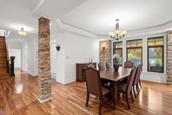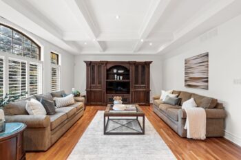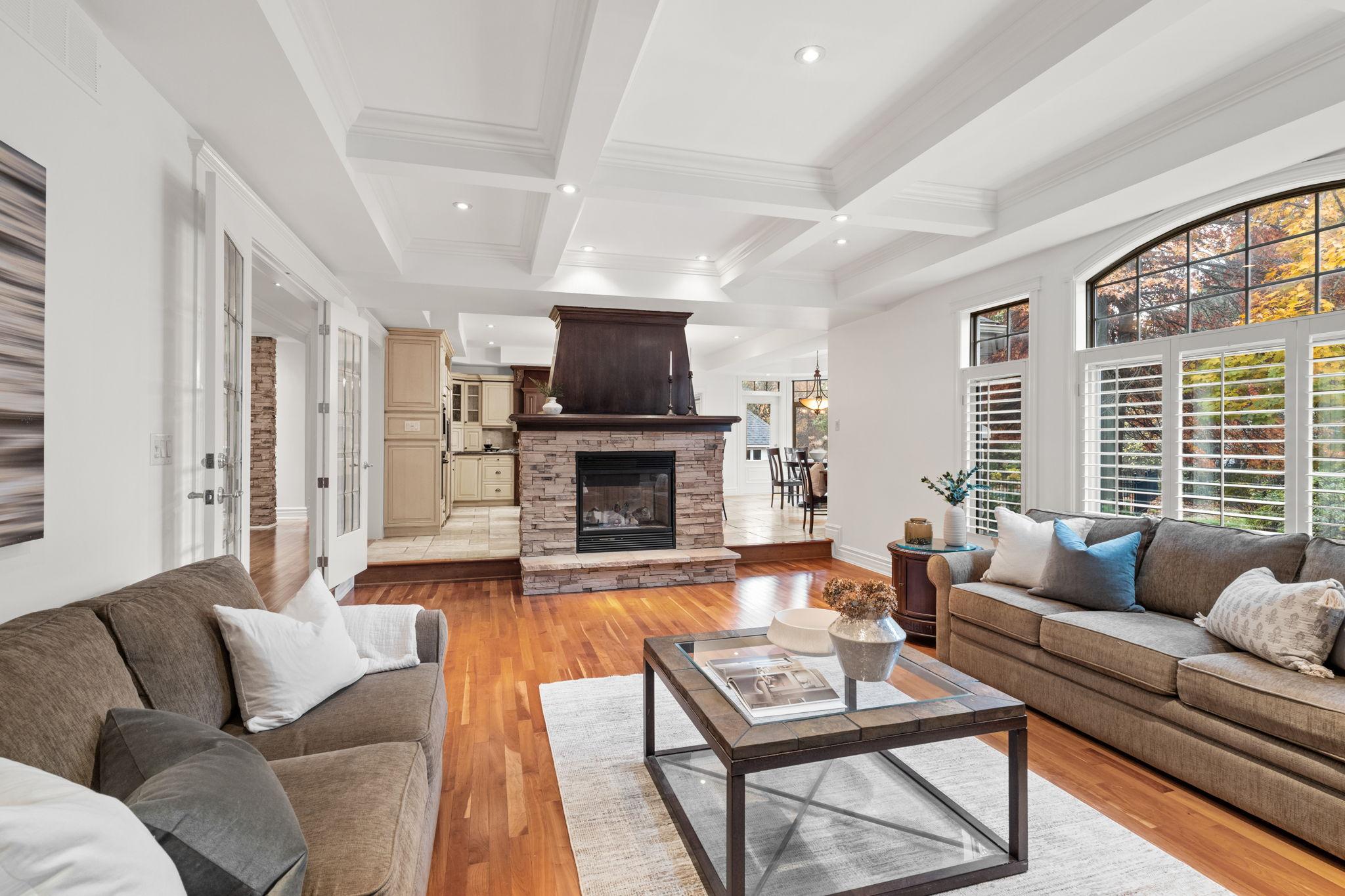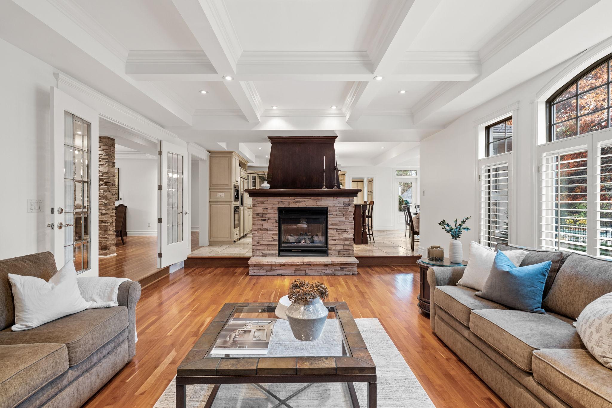 A grand foyer introduces warm cherry tones, natural stone accents, and intricate millwork that immediately convey the home’s quality and character. The great room is filled with natural light and anchored by a two-way gas fireplace, detailed coffered ceilings, and rich hardwood floors, blending comfort and sophistication for both everyday living and entertaining.