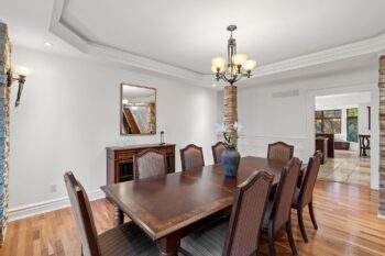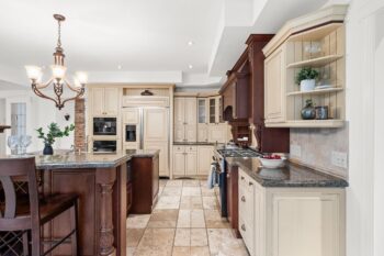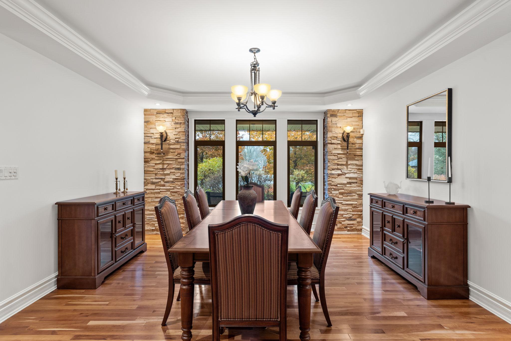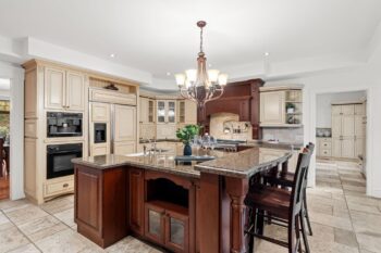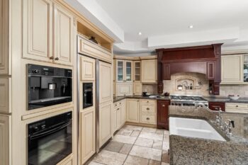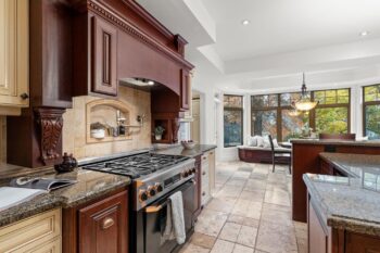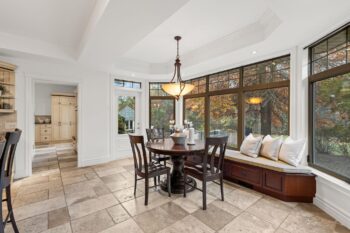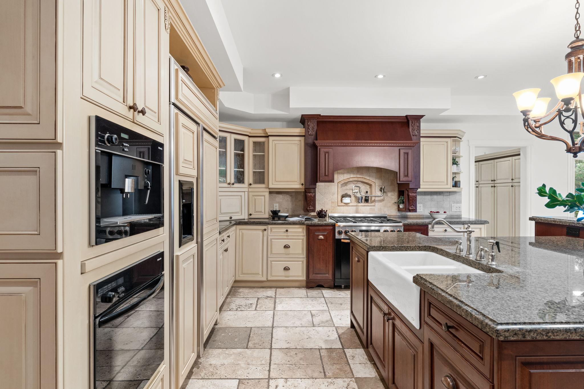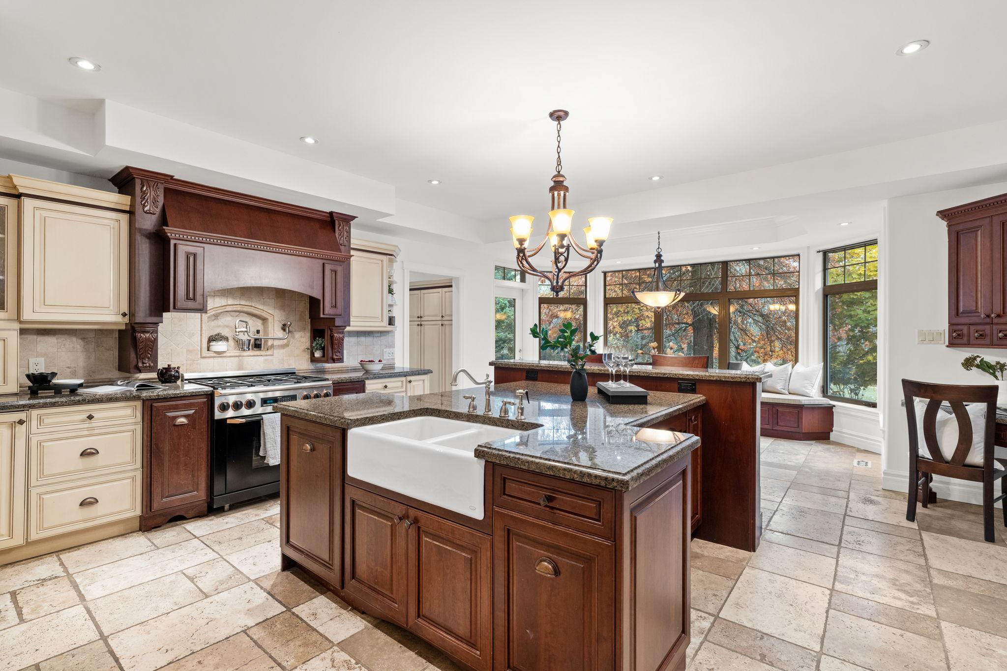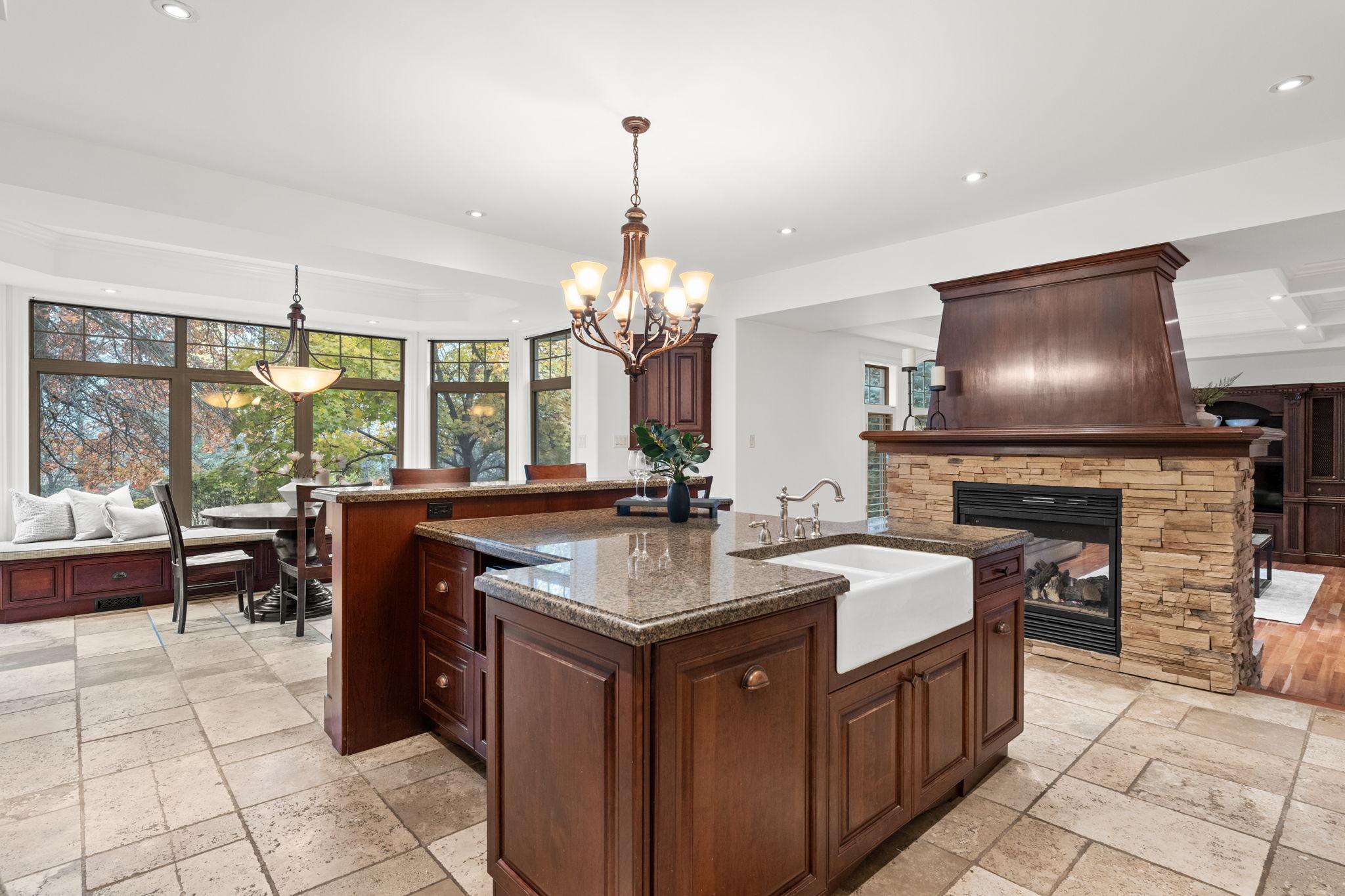The chef-inspired kitchen features antique cream cabinetry, a cherry island, granite counters, and elegant stone detailing with pot filler. Radiant floor heating, glass uppers, a wine rack, pots-and-pans drawers, and an appliance garage enhance both beauty and function. A bright breakfast nook with window seat and built-in desk complements the space, while the formal dining room offers timeless appeal with a full-height stone wall, coffered ceiling, and ambient lighting.
