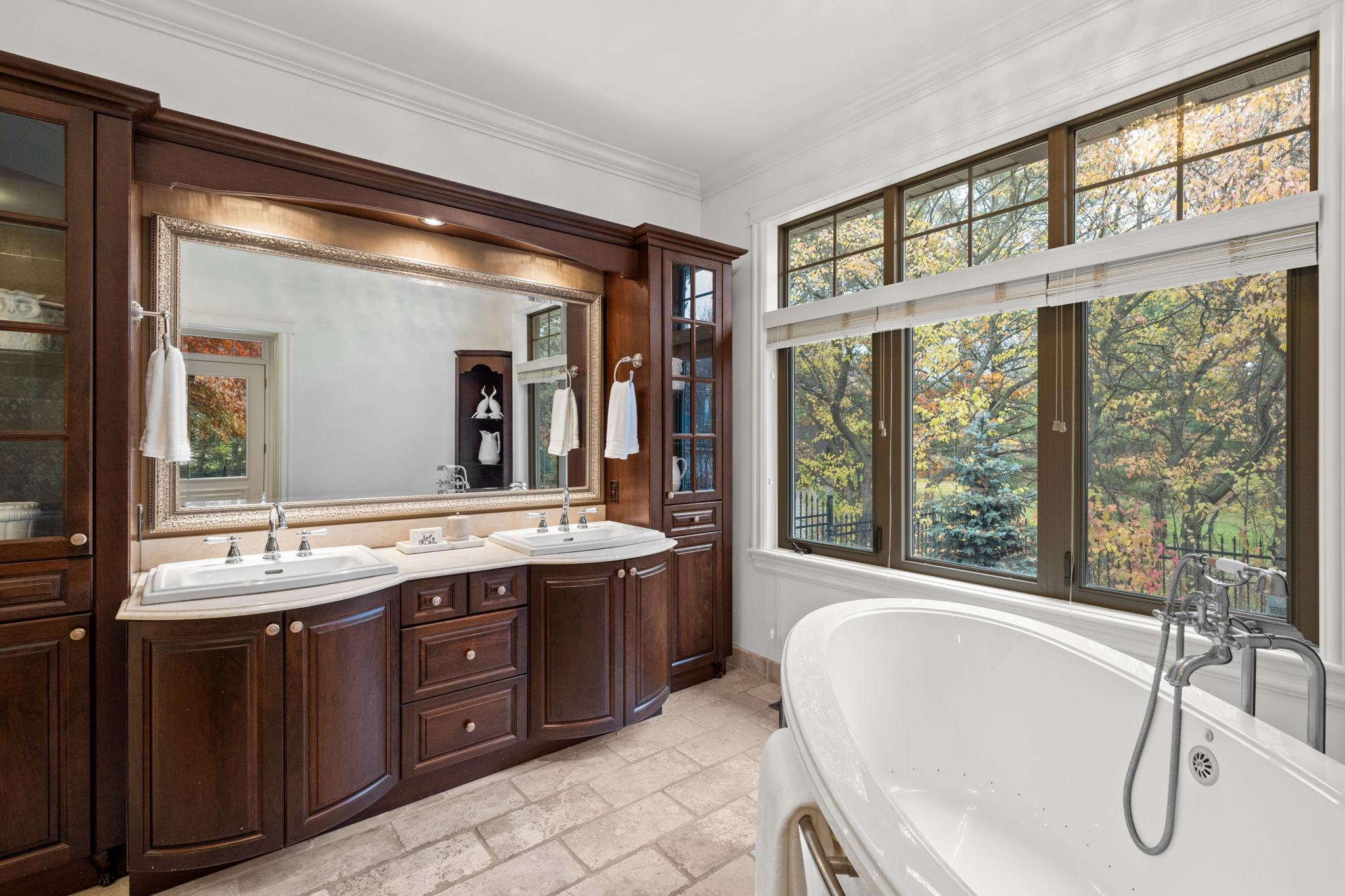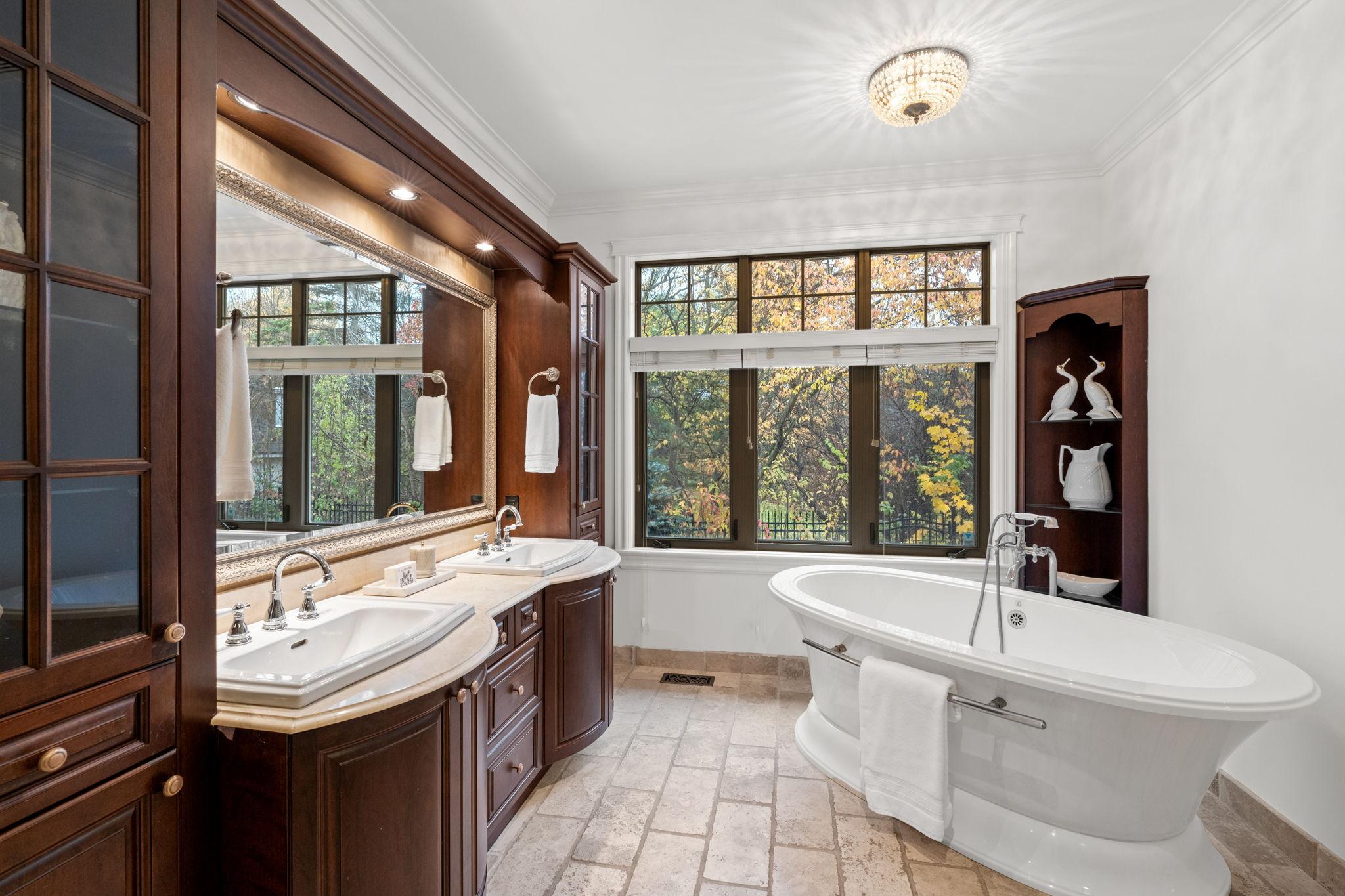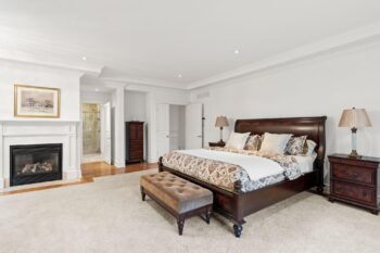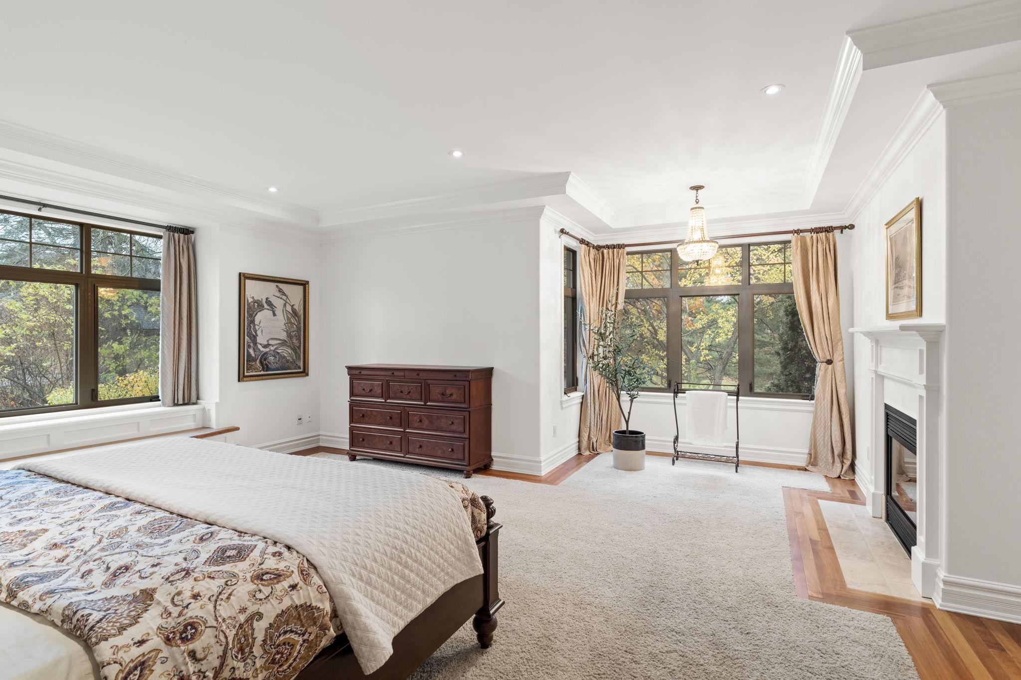 The primary suite is a warm and refined retreat, highlighted by rich wood detailing, a gas fireplace, walk-in closet, and a spa-inspired ensuite with radiant floors, stand-alone tub, rainhead shower, travertine counters, and double-sink vanity.