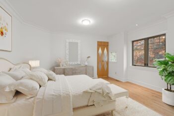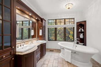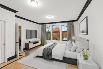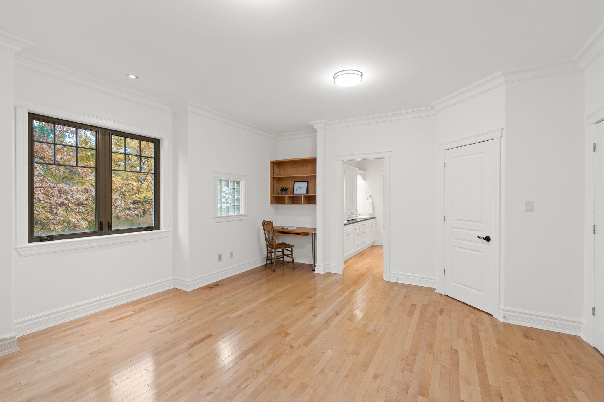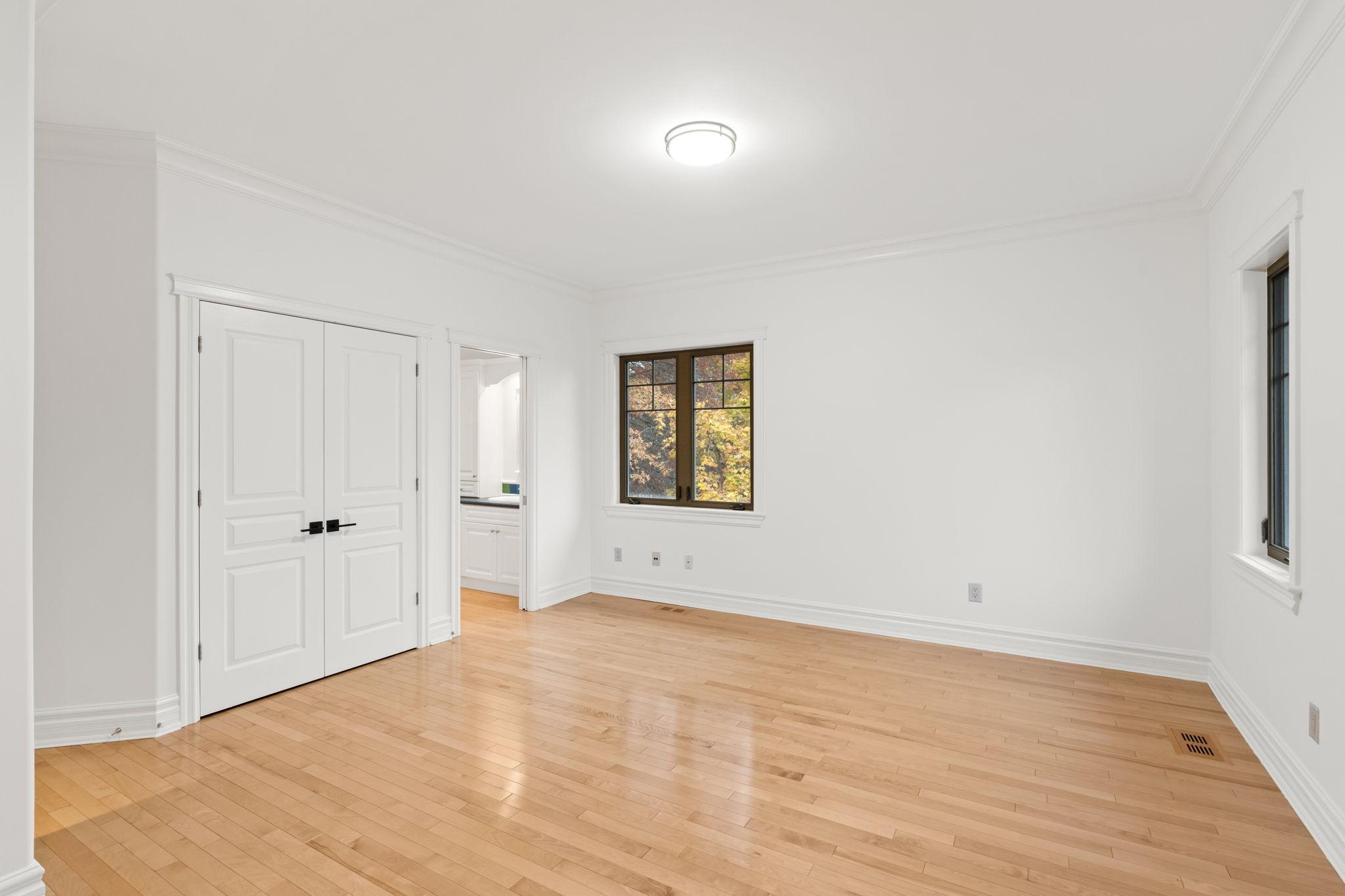 The primary suite is a warm and refined retreat, highlighted by rich wood detailing, a gas fireplace, walk-in closet, and a spa-inspired ensuite with radiant floors, stand-alone tub, rainhead shower, travertine counters, and double-sink vanity.