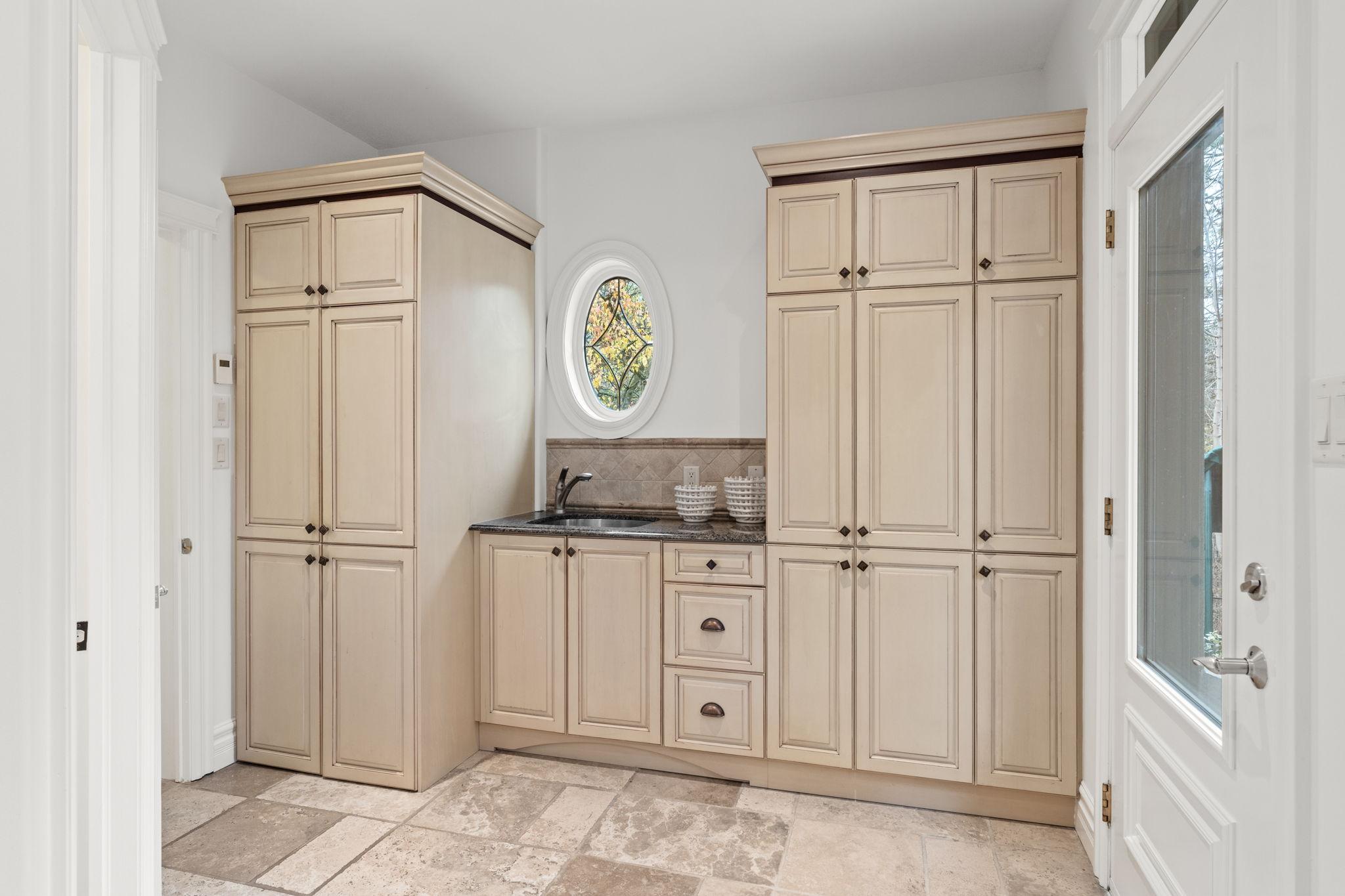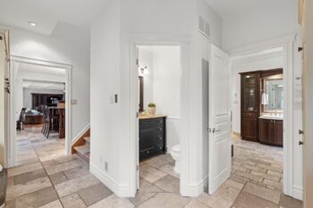The main-floor laundry room provides practical access to the pool and primary suite, with pantry storage, a powder room, and nearby second staircase for easy household flow.