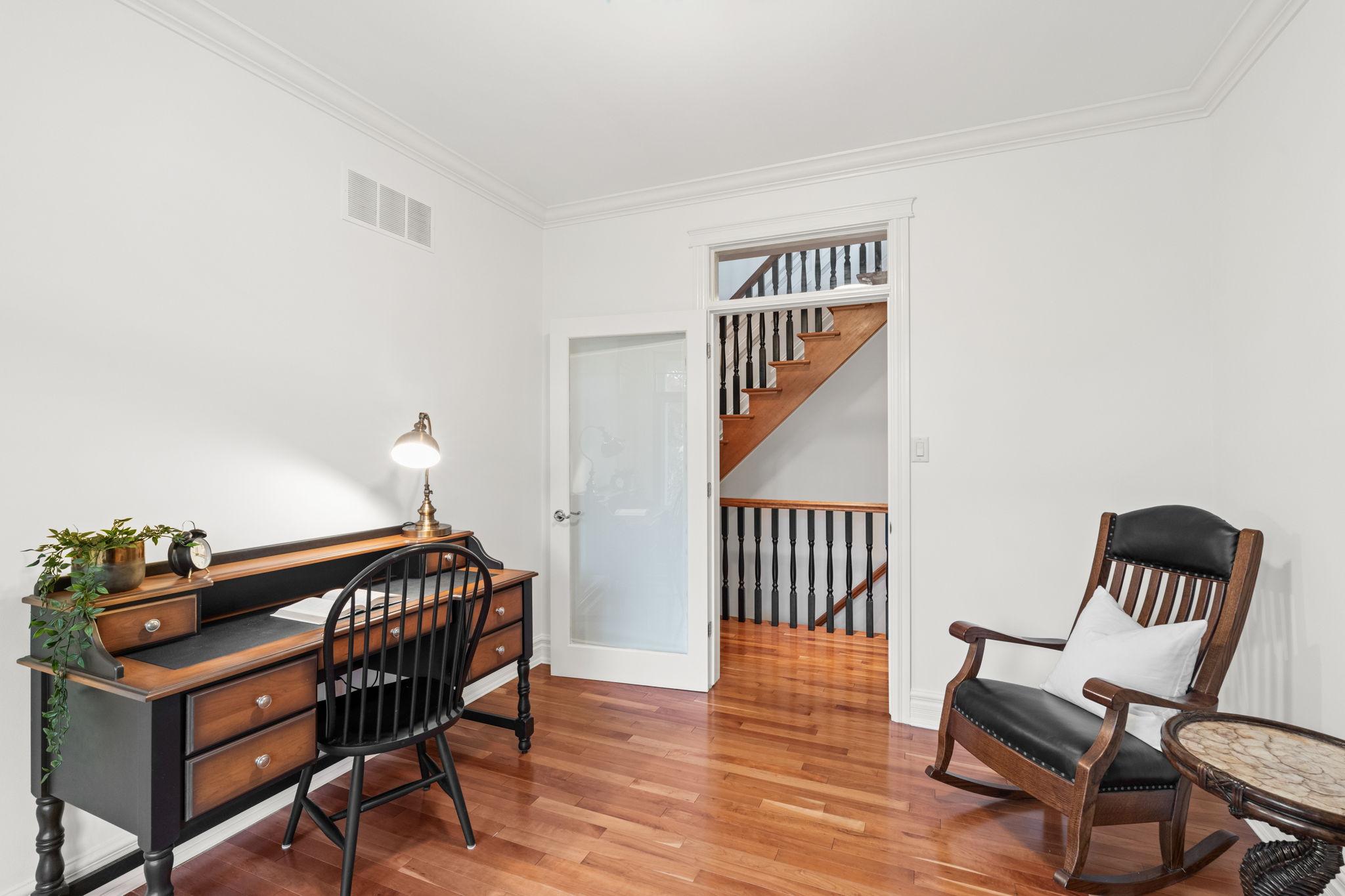 A den with custom built-ins offers a quiet workspace, and a well-designed mudroom with extensive cabinetry, fridge, and window seat connects directly to the garage, backyard, and front entry for seamless organization.