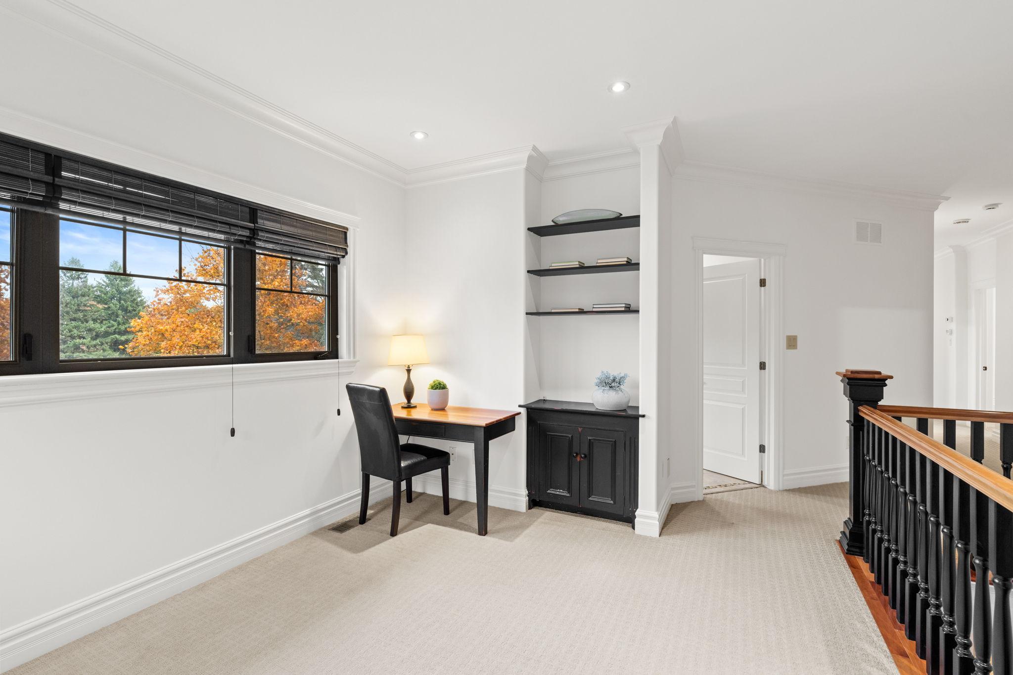 The loft provides a flexible living area ideal for reading, homework, or relaxing, featuring a built-in cabinet, shelving, and wall desk. Three spacious bedrooms offer generous closets and private or shared ensuite access. One bedroom enjoys a private ensuite with hall access, while two others share a Jack-and-Jill bath. The second-floor laundry room adds convenience with custom cabinetry, a fold-out ironing board, and dedicated workspace—ideal for busy family living.